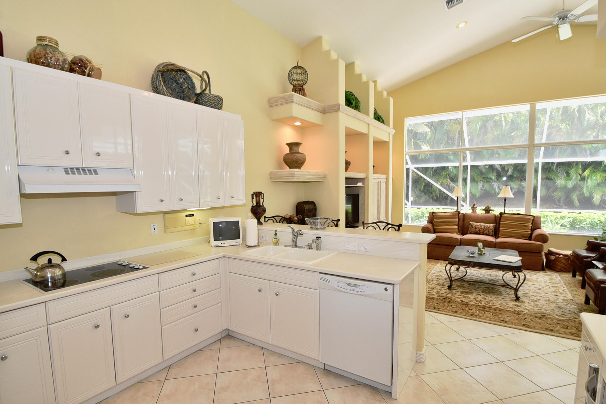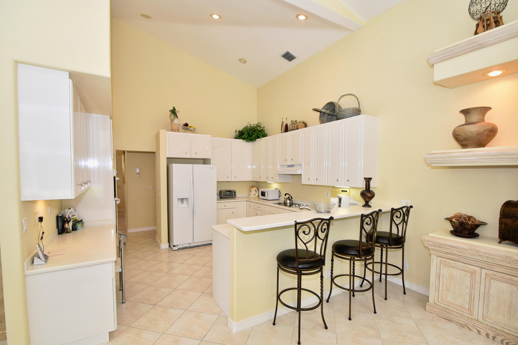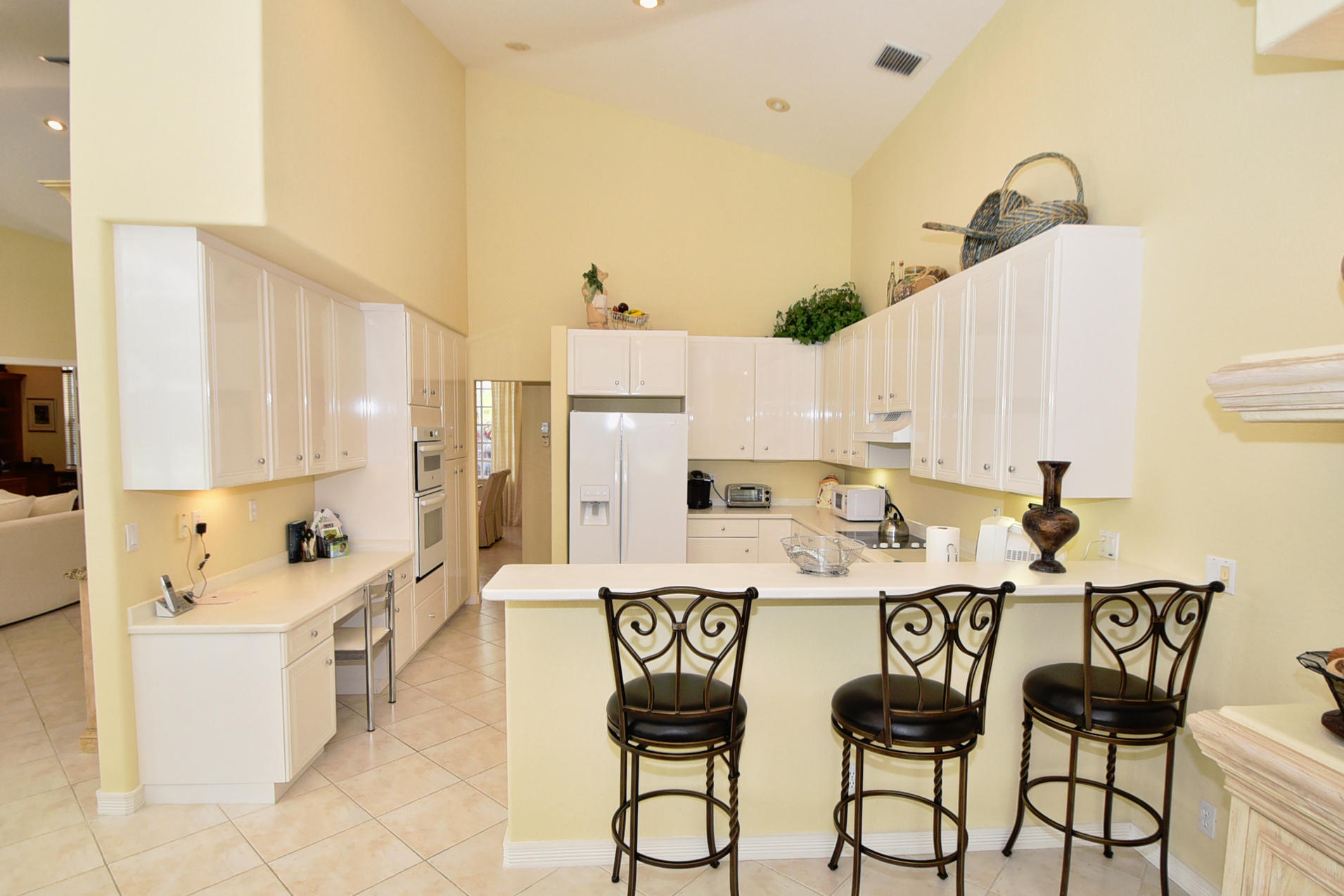 Wonderful, open & very bright 4 bedroom 3 full bath home. The 4th bedroom is a built-in office w/ designer wood cabinetry. Desirable white lacquer cabinets in the kitchen. Neutral tile floors, split bedrooms, custom built-ins, roomy closets, screened patio and a replaced roof. Topped off w/elegant circular driveway. JUST REDUCED! PRICED TO SELL! FURNITURE AVAILABLE.Mandatory membership country club-LIVE THE LIFESTYLE!!