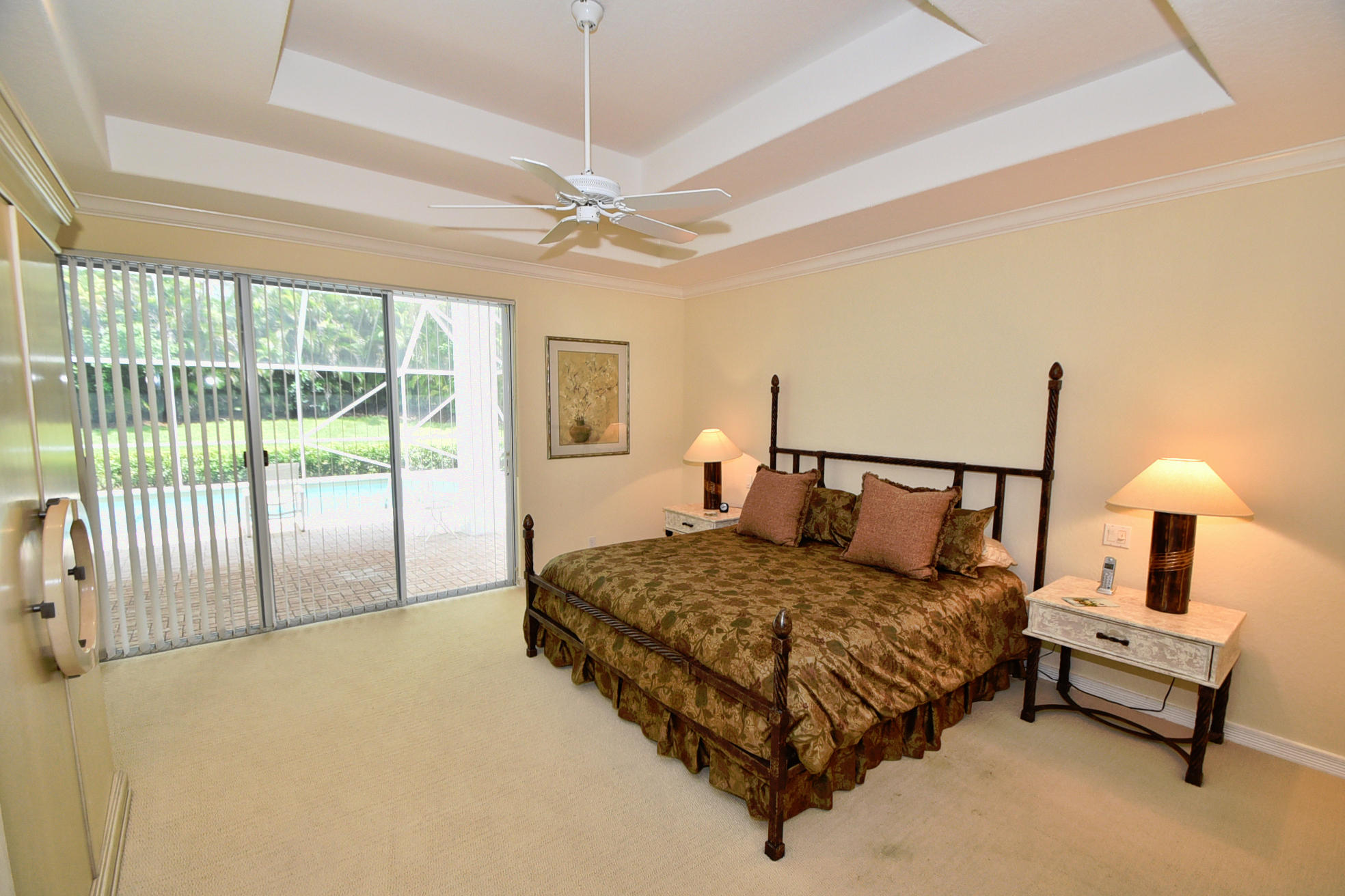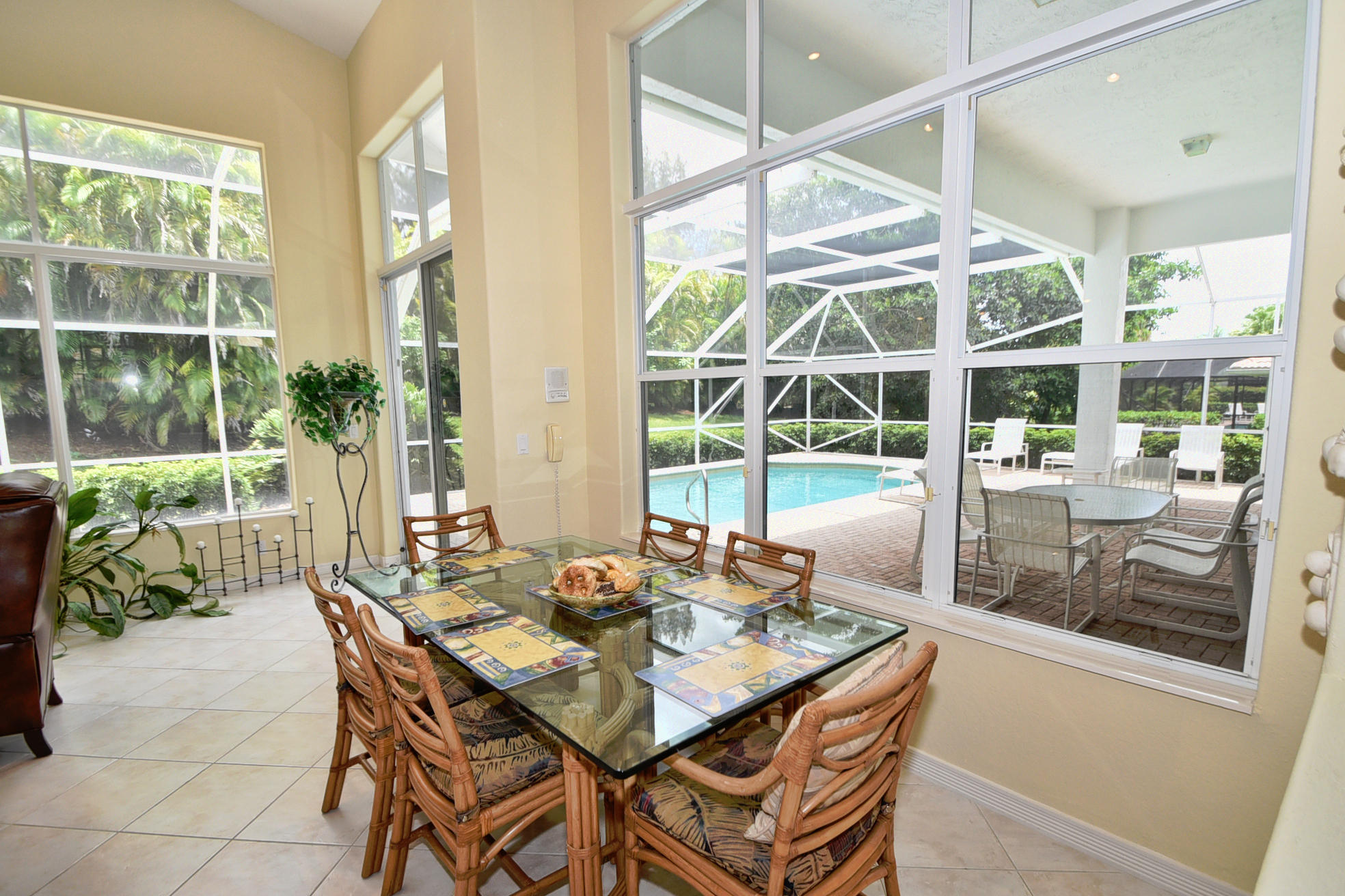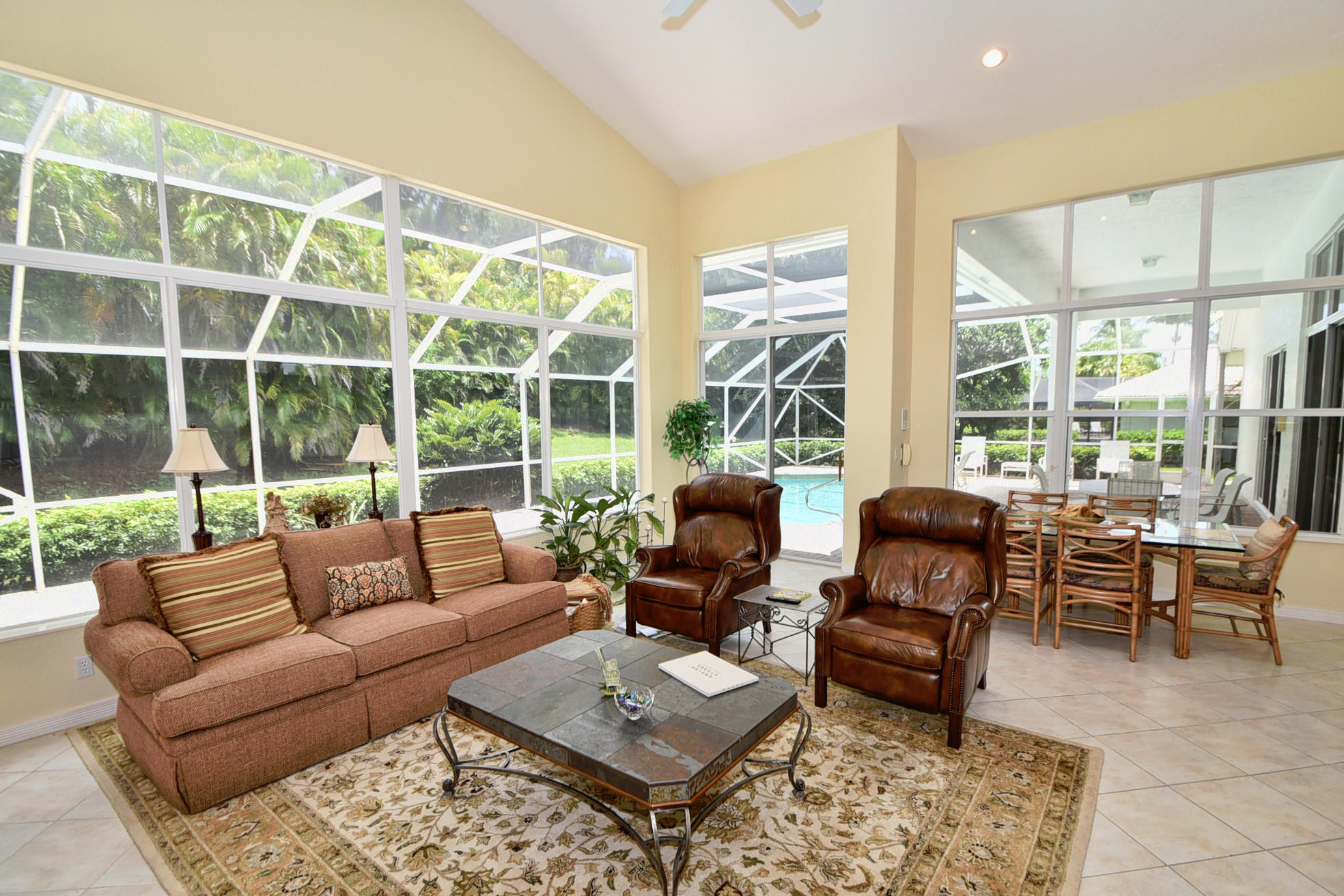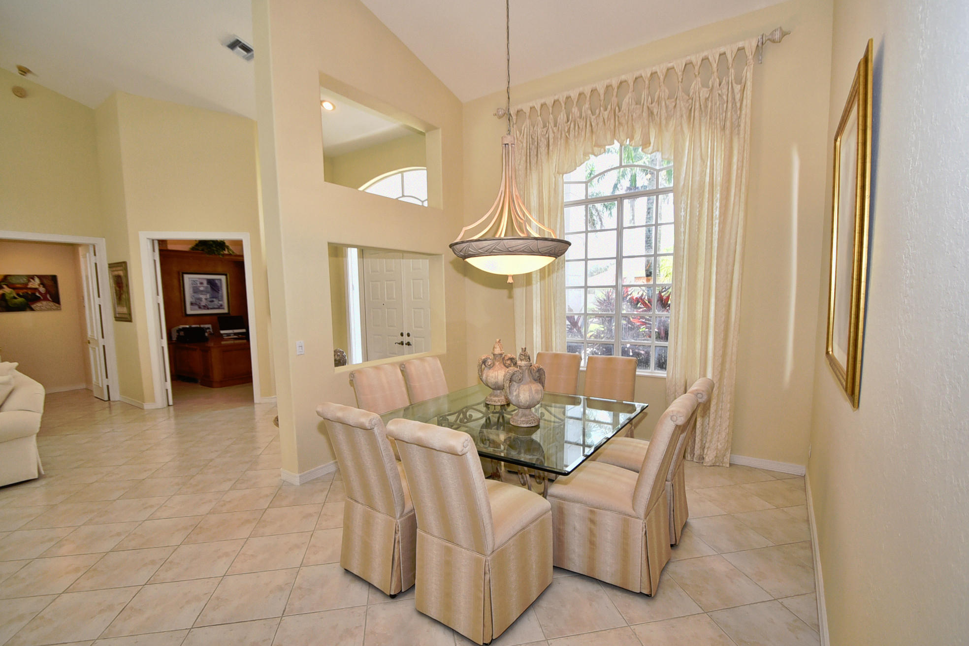 Wonderful, open & very bright 4 bedroom 3 full bath home. The 4th bedroom is a built-in office w/ designer wood cabinetry. Desirable white lacquer cabinets in the kitchen. Neutral tile floors, split bedrooms, custom built-ins, roomy closets, screened patio and a replaced roof. Topped off w/elegant circular driveway. JUST REDUCED! PRICED TO SELL! FURNITURE AVAILABLE.Mandatory membership country club-LIVE THE LIFESTYLE!!