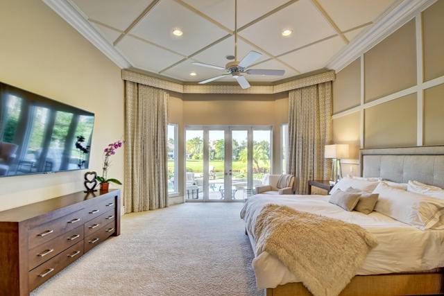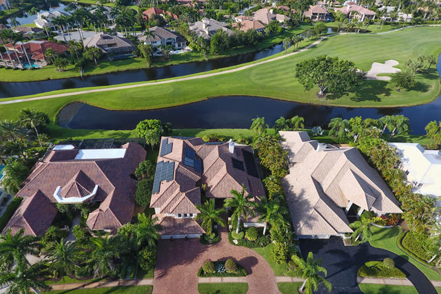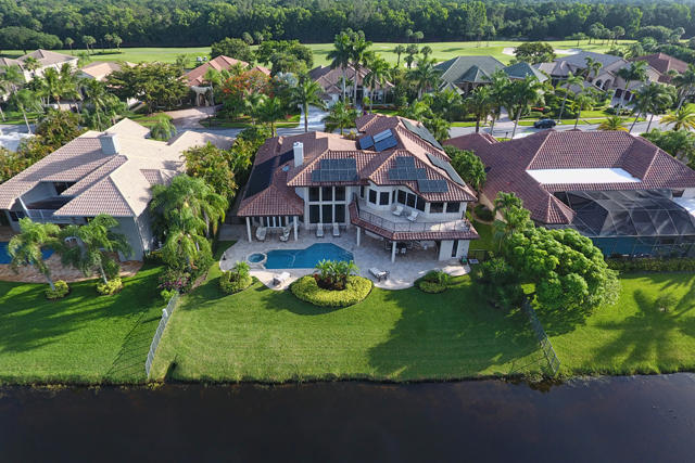 Totally renovated (down to studs) & expanded like new! Magnificent Contemporary home with every extra & superb southern lake & golf views. Elevator, hurricane impact glass, theater, generator, Crestron smart system, LED lighting, Platinum Mosquito Protection, executive phone system, water purification & reverse osmosis, SOLAR panels for energy efficiency. 1st floor Master suite with his & her baths & large custom closets. Euro-style kitchen with quartz counters, Wolf gas range, convection oven, microwave, Sub-Zero refrigerator, Miele dishwasher, Butler pantry, wine fridge. Large family room. Loft with theater, exercise area & huge terrace. 2 laundry rooms. 4 Guest bedrooms are en-suite. Southern exposure for resort-style pool, patios, terrace, outdoor kitchen, and prime lake & golf views.