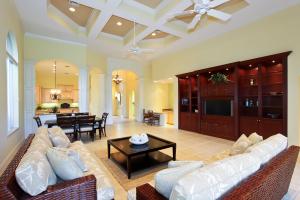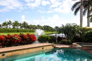 This property is in model-perfect condition and features a popular Florida great room floor plan with three bedrooms, three baths plus den. Beautiful water view overlooks a lake with fountain. Built in 2004, this home has many upgrades including large granite kitchen with s/s appliances and granite desk area. Intricate designer ceilings, crown moldings, built-in remote-control ceiling fans, granite wet bar with wine fridge all complete the great room. New pool equipment with screened-in dining patio area. Each bedroom has a private bath with granite countertops. Master bath has two granite vanities, bidet, and a doorless sports shower.