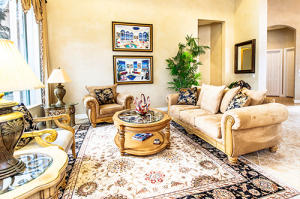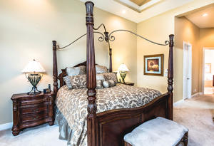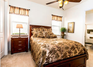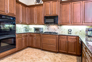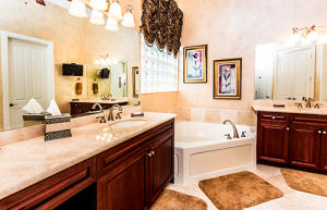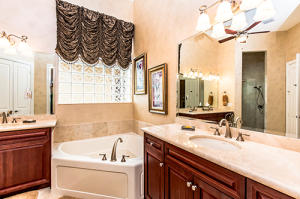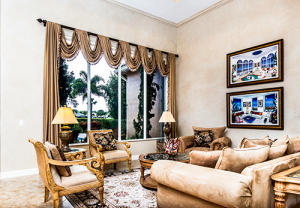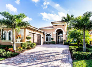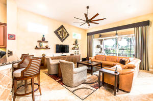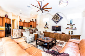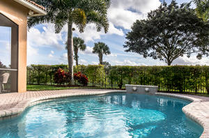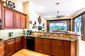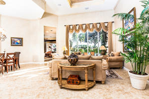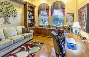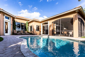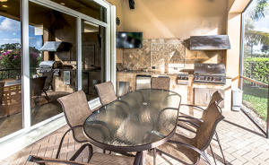 Sought-after ''Miramonte'' model with a prime southern exposure. 3BR/3.5 BA+Den. Upgrades at every corner of this home: designer treatments, built-ins, Accordian shutters, whole-house generator, built-in Bose sound system in three rooms. The stunning office built-in features two desks, wood floors. Neutral tones and soft faux finishes, Central vac, Tile on diagonal, Large screened patio, with custom designed summer kitchen with a fridge, large cooktop + two side burners, Granite topped Butlers Pantry w/ wine fridge, wood cabinets in kitchen, granite counters, pullouts in cabinets, ''To die for'' Pantry, Brand new front-loading washer and dryer, Garage has Epoxy floor and custom cabinets and bike racks. Pool and patio area has a golf view. Move-in perfect.