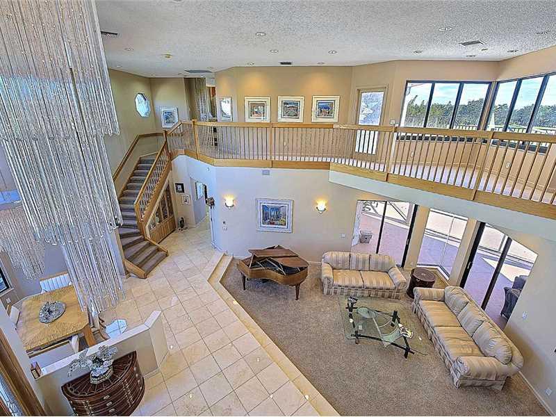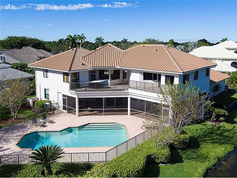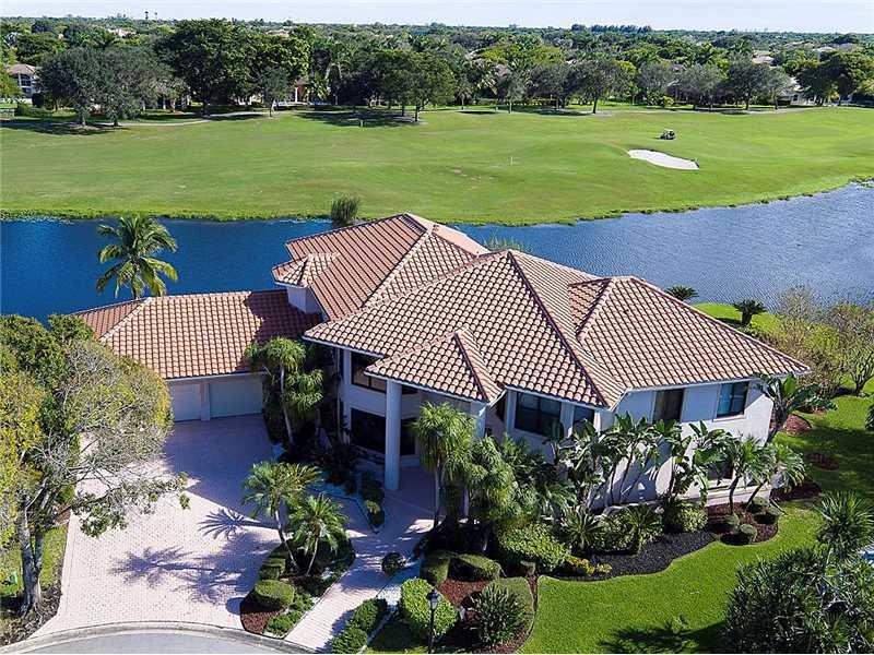 Point, waterfront & golf course view lot in quiet cul de sac. Custom residence, 5 true bedrooms+office+loft. Almost every room captures 270 degrees of flowing waterways & rolling greens. New roof 2015, Impact windows & shutters, contemporary architecture, rich oak trims, marble floors, enormous roofed patios, 18x35' pool + deck . Updated oak kitchen: stainless steel, granite, induction & convection cooking. Tremendous master suite & gym, designer library/office. Interior & exterior balconies. A MUST SEE!