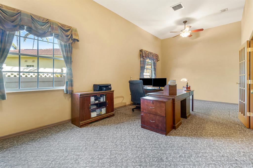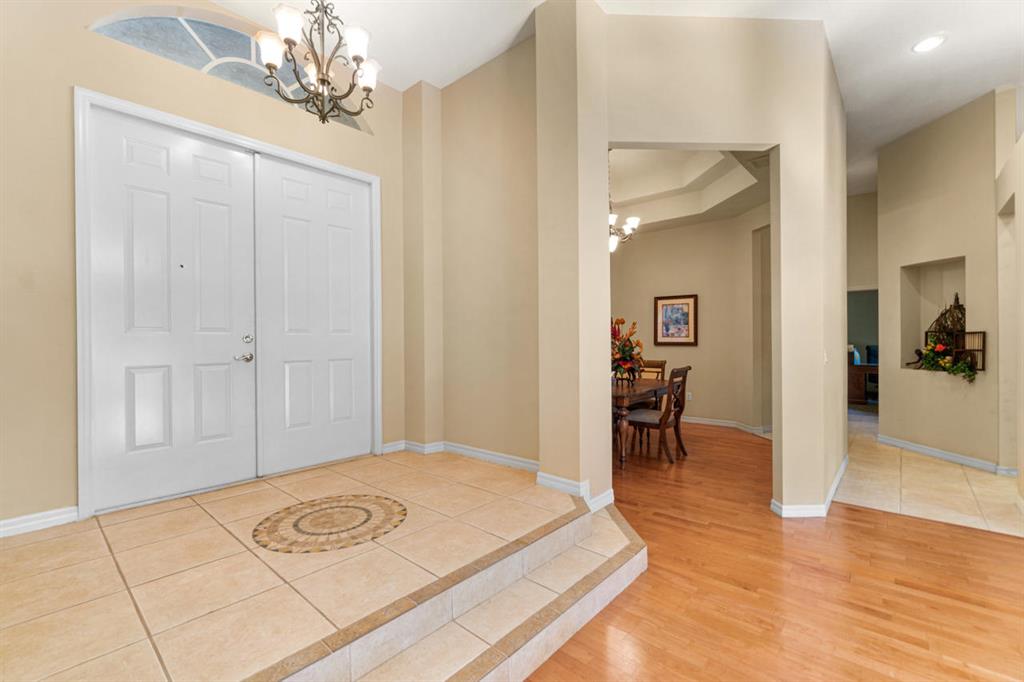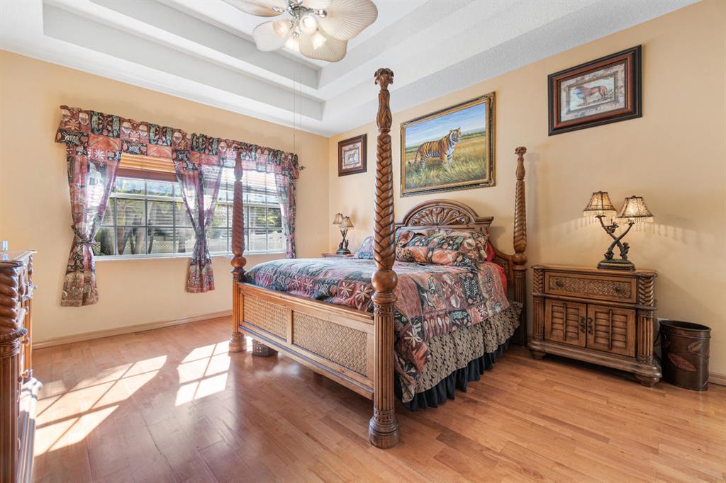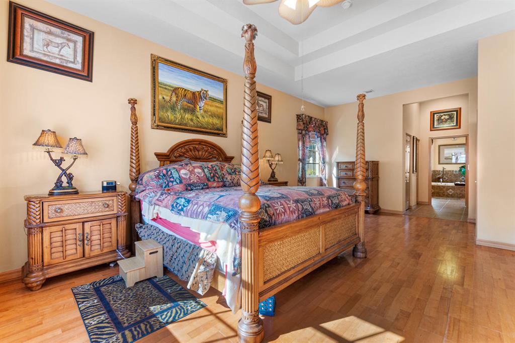 Enter this extraordinary pool home of Lago Estates South and you will find the 5 bedroom/3 bathroom/3 car garage home of your dreams! The 12 foot ceilings and real wood floors greet you with sunshine and space as you tour through this triple-split bedroom home. The master suite will spoil the owner with its private sitting area, ensuite with custom tile work and oversized jacuzzi tub, spacious closets, and private entrance to the outside oasis. The gourmet kitchen boasts endless real wood cabinets as well as granite counters for a combination that will please even the pickiest of chefs.