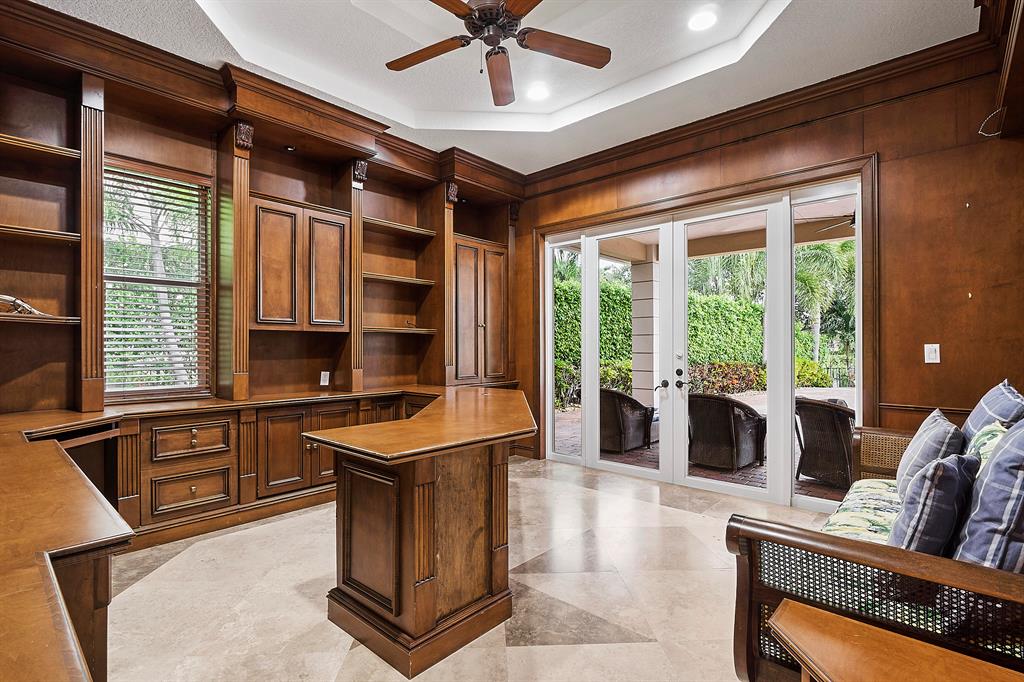 This exceptional home offers dramatic lake views and emphasizes luxury living. Complete with 4 bedrooms plus a richly wood paneled office/den, 3 full bathrooms, one half bath ,formal living room with fireplace, a large and inviting kitchen with center island, walk-in pantry adjacent to the family room and sun splashed Florida room. The owner's suite boast a jacuzzi spa tub, dual vanities and a private covered balcony overlooking the community's 45 acre lake. For peace of mind, the property features all hurricane rated windows . Other features include a 2018 roof, tankless water heater, travertine marble throughout,. Step out any of the numerous French doors to the lanai with an expansive patio, outdoor kitchen, oversized heated pool with spillover spa and lounging ledge.