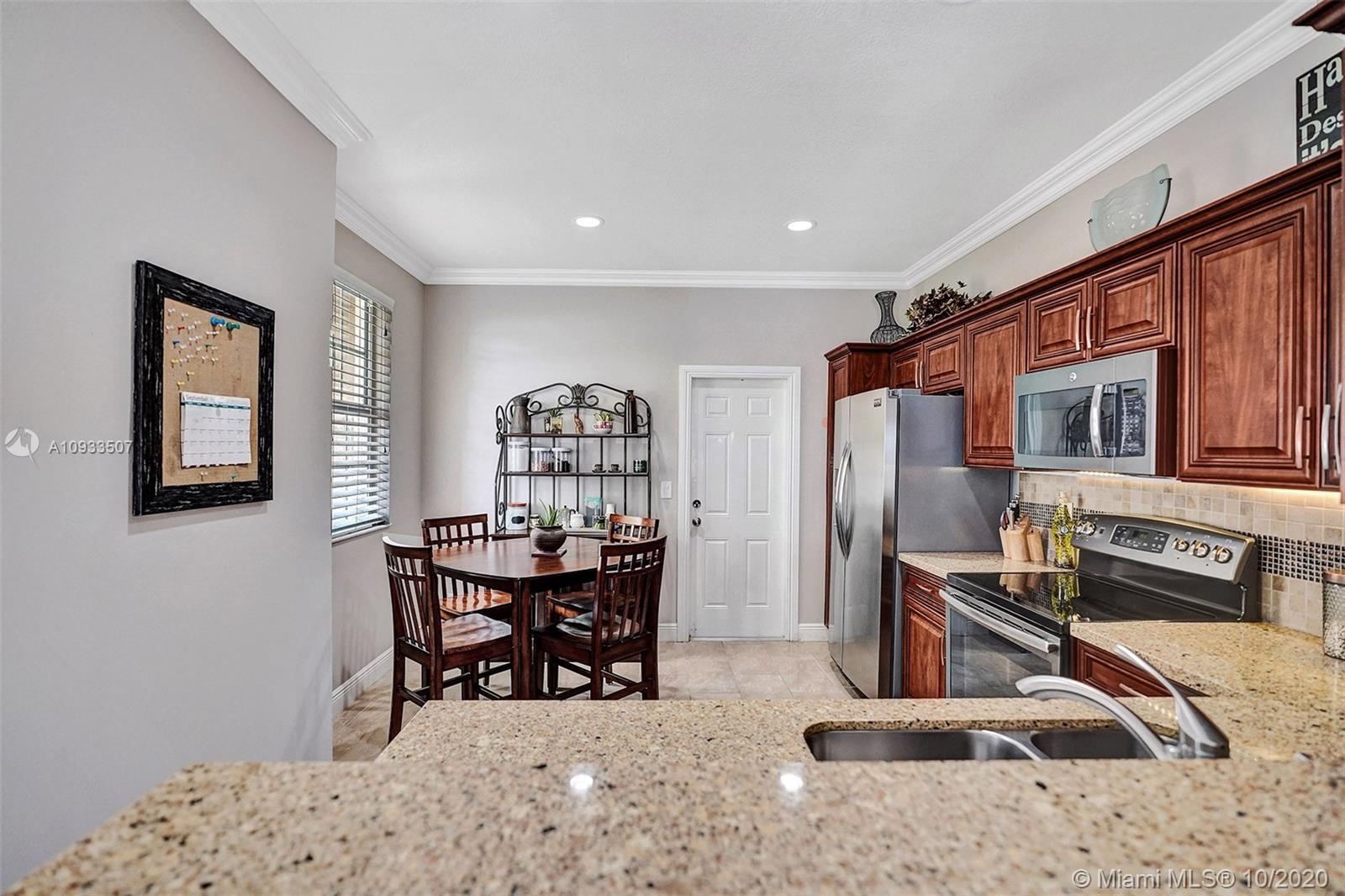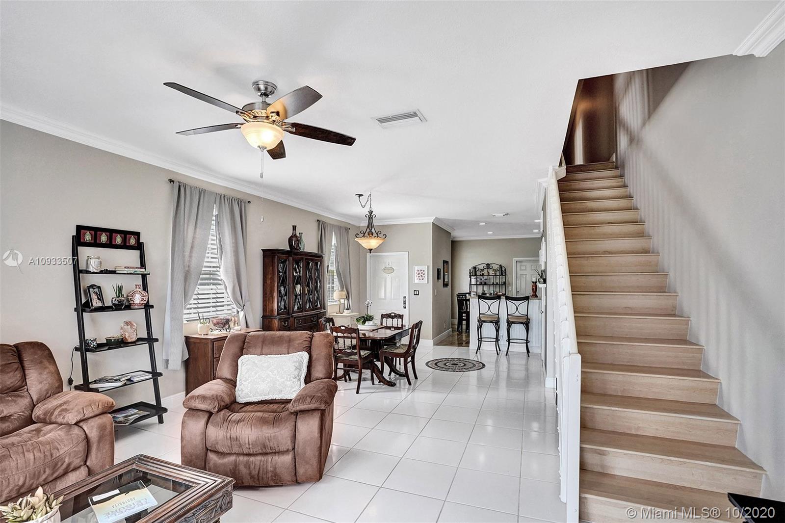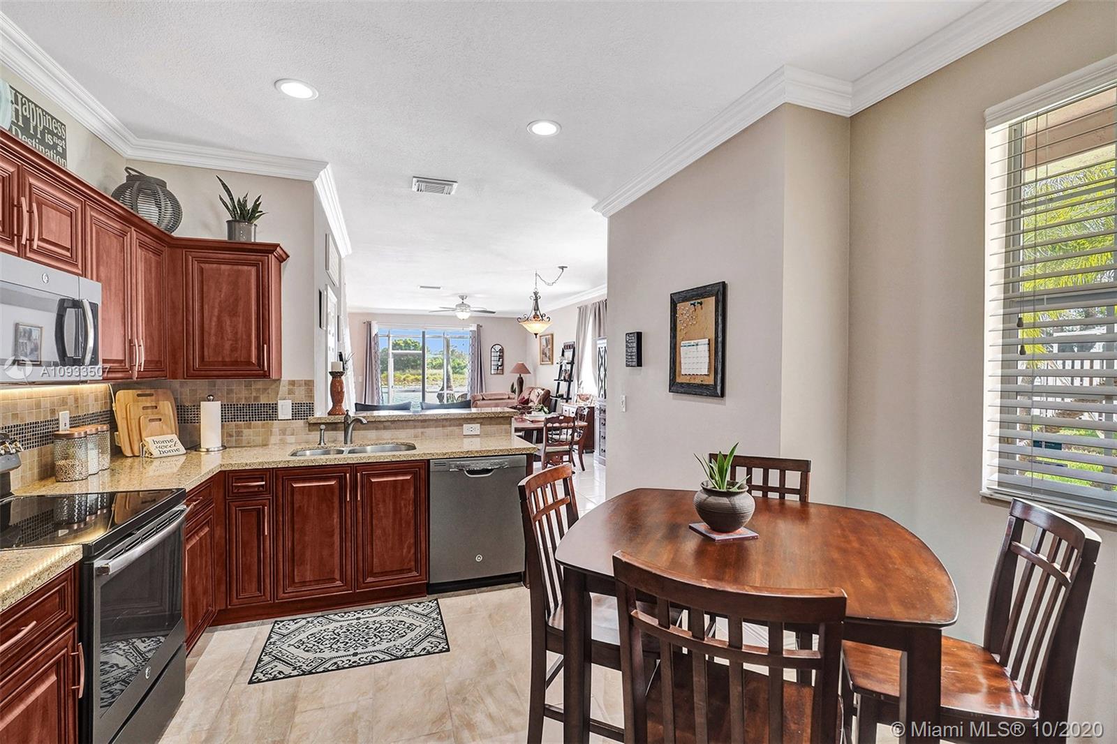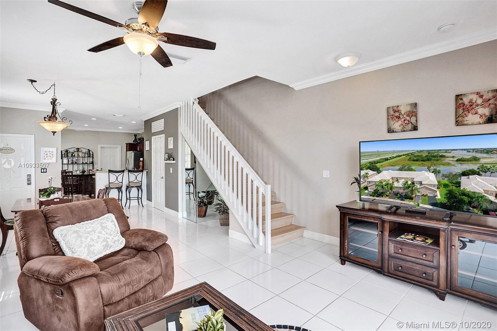 Enjoy beautiful lake views from the screened patio of this well-maintained 4 bedroom, 2.5 bath townhome in San Messina. Upgrades galore. Eat-in kitchen with updated cabinets, soft close drawers, granite countertops & stainless steel appliances. Tile floors downstairs, wood laminate on stairs and bedrooms. All bedrooms upstairs. Updated bathrooms. TRANE a/c system with UV light. Oversized one car garage allows for tons of storage. Samsung Steam front loader washer & dryer in garage. "Smart" garage door opener. HOA amenities include community pool & tot lot. Easy access to highways, shopping & dining. Publix & Imagine Charter School across the street. All A-rated Weston schools. This gem is truly move-in ready! A pleasure to show! See attachments for floor plan, HOA info & Feature Sheet.