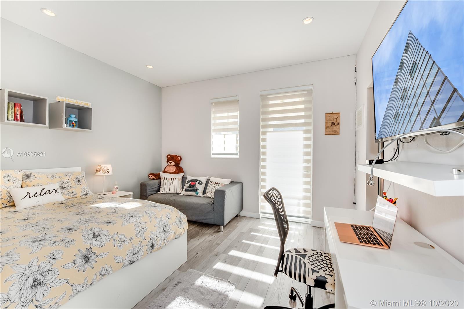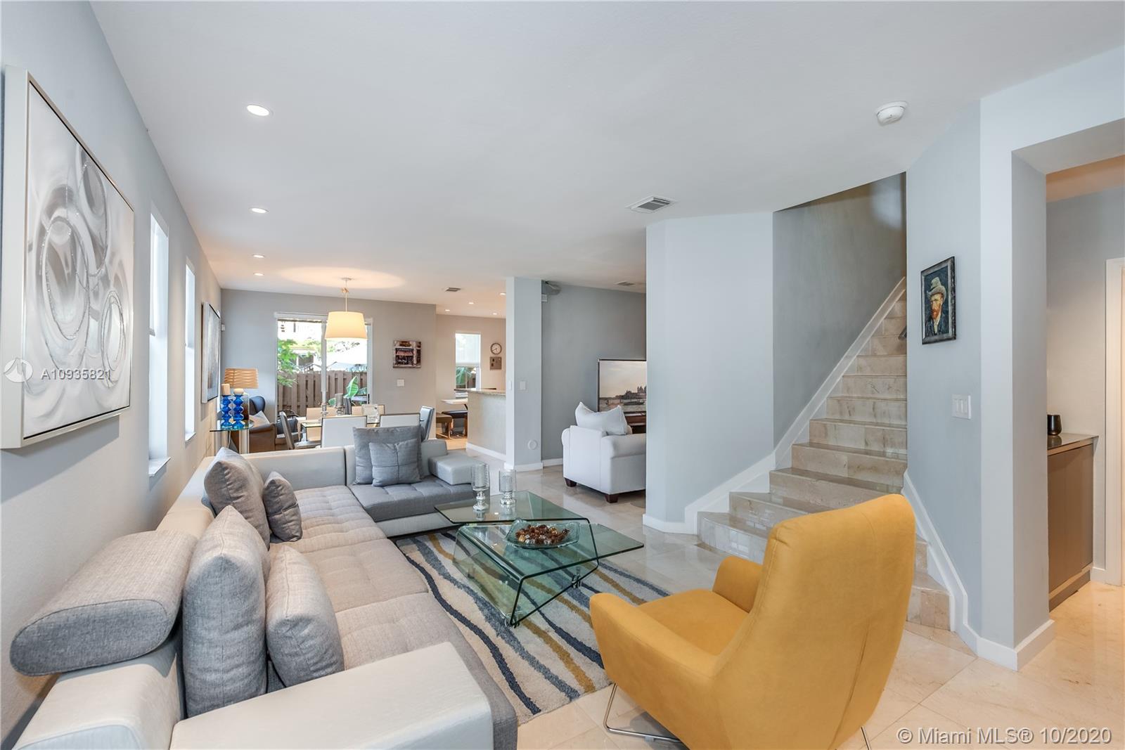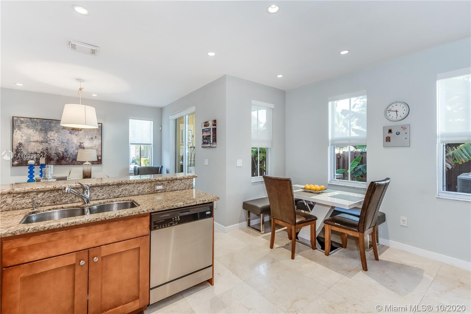 The corner lot home has an ample floor plan w/lots of natural light across the layout that makes it feel like a single family home. Features include hand selected marble floors, updated bathrooms & kitchen, new A/C, recessed lighting throughout, high quality, wood grain tile upstairs, SS appliances, window treatments, a private office. The large master suite upstairs has plenty of volume & sunlight. Its gorgeous walk-in closet w/custom cabinet system. Master bath offers dual vanities, shower & tub. The masters' private balcony w/North & West views, perfect for evening sunsets. Bedrooms upgraded w/built-in closets, window treatment & private balconies. 2 bedrooms are Jack & Jill suites. Half bath downstairs. 2 car spaces & 2 car garage w/lots of add'l storage. Add'l guest parking near by.