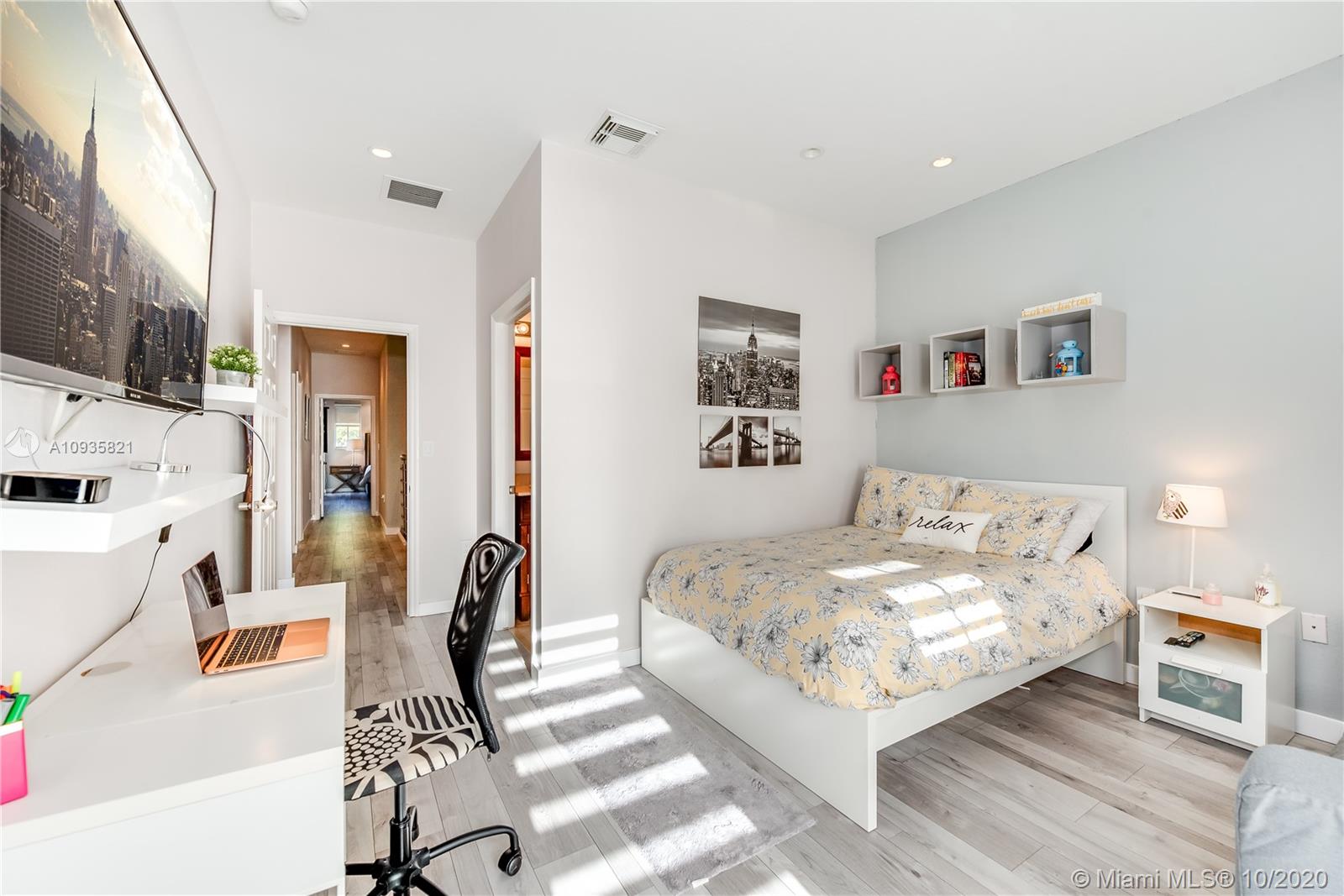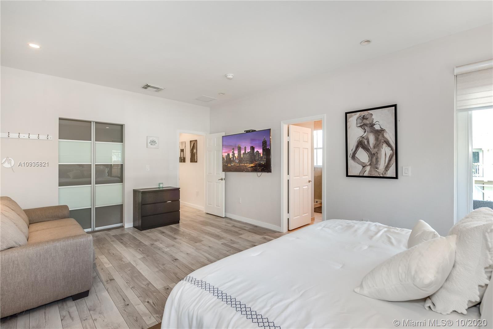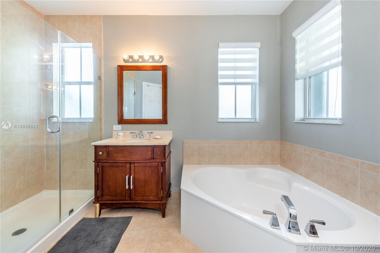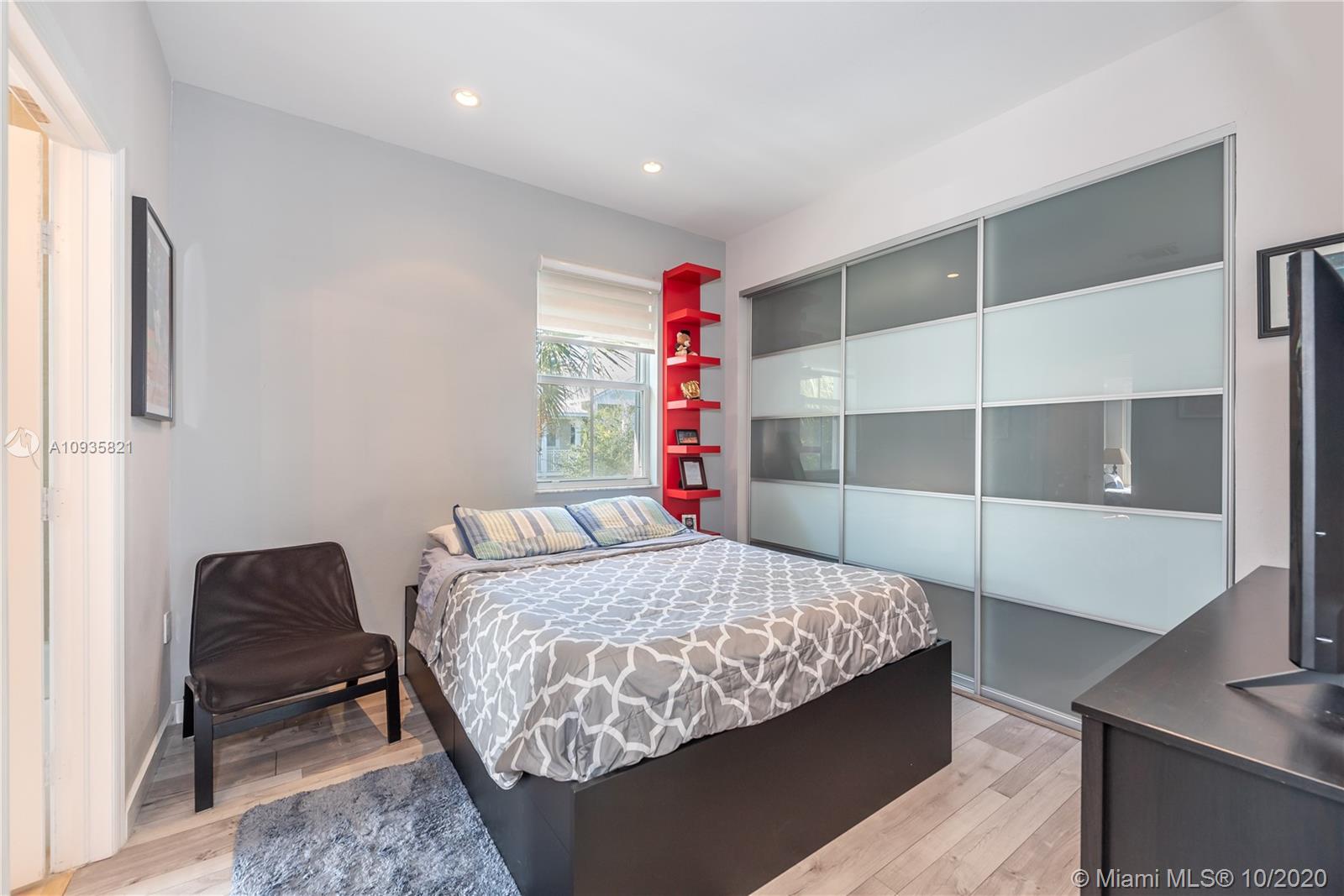 The corner lot home has an ample floor plan w/lots of natural light across the layout that makes it feel like a single family home. Features include hand selected marble floors, updated bathrooms & kitchen, new A/C, recessed lighting throughout, high quality, wood grain tile upstairs, SS appliances, window treatments, a private office. The large master suite upstairs has plenty of volume & sunlight. Its gorgeous walk-in closet w/custom cabinet system. Master bath offers dual vanities, shower & tub. The masters' private balcony w/North & West views, perfect for evening sunsets. Bedrooms upgraded w/built-in closets, window treatment & private balconies. 2 bedrooms are Jack & Jill suites. Half bath downstairs. 2 car spaces & 2 car garage w/lots of add'l storage. Add'l guest parking near by.