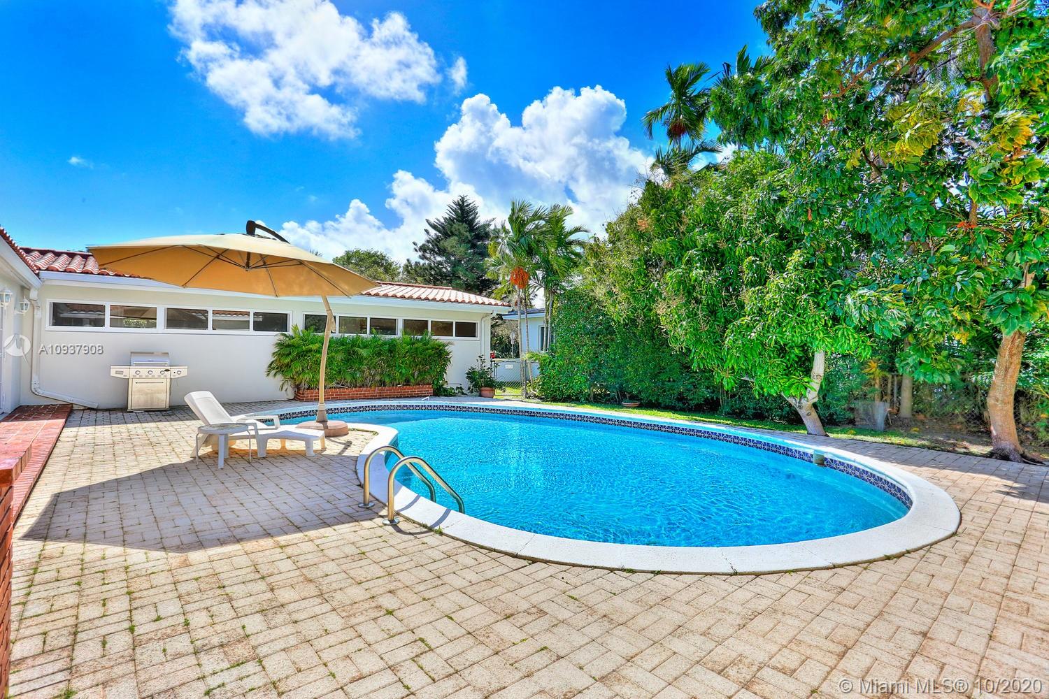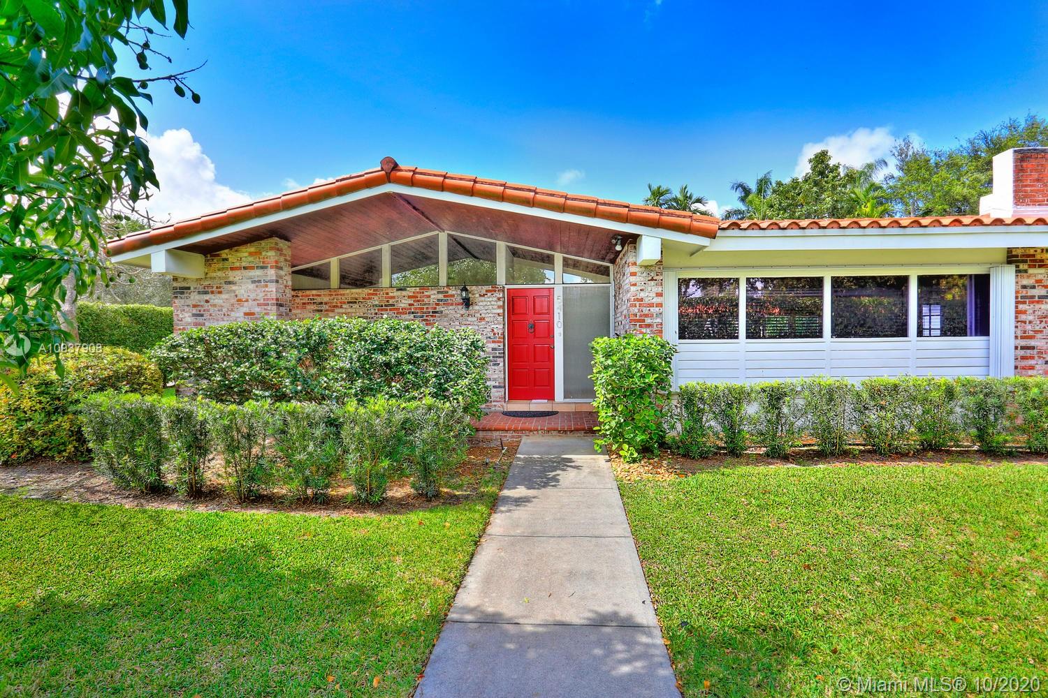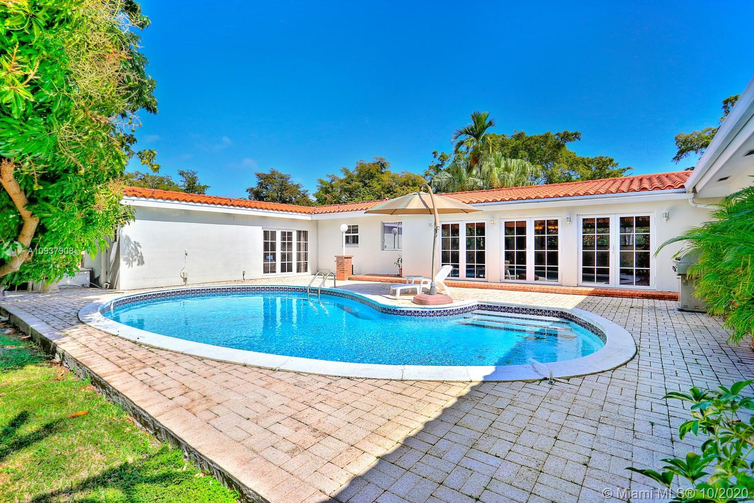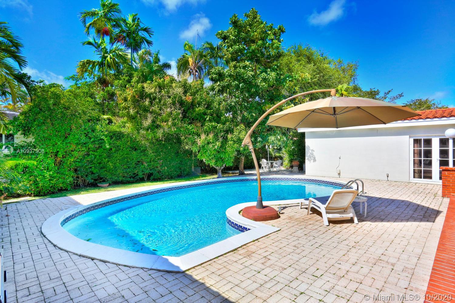 Classic mid-century modern-style home on historic & tree-lined Alhambra Circle. Hidden behind a tall privacy hedge and surrounded by 11,550 SF of gardens with fruit trees & tropical landscaping. Light-filled, open living spaces feature vaulted ceilings and banks of French doors that overlook ultra-private courtyard with large pool & terrace. Split-plan bedroom layout with 4th BR/BA ideal for housekeeper or guests ( private entrance). Notable features include: sunny kitchen w/ gas range & granite countertops, large master suite w/vaulted ceilings, separate laundry room, 2 car garage & most windows & doors with impact glass. Walking distance to UM campus, Riviera Country Club and close to The Biltmore Hotel.