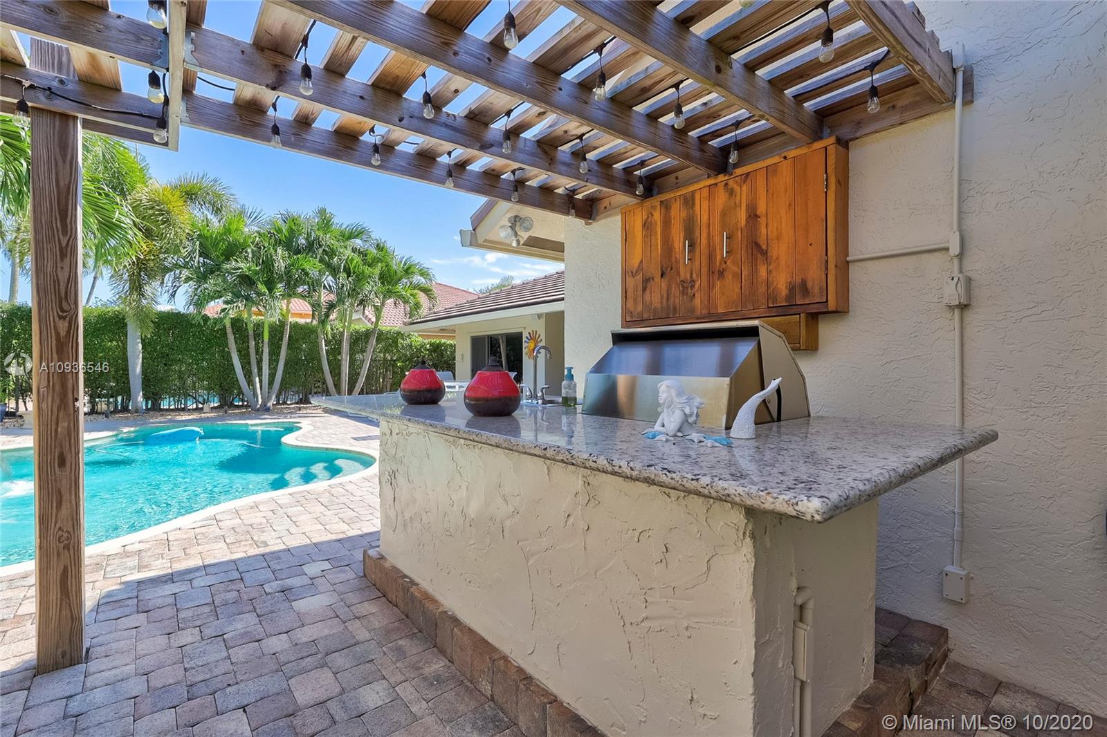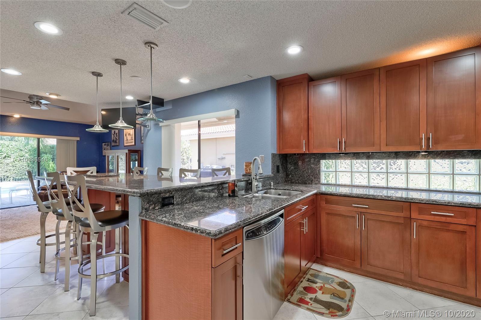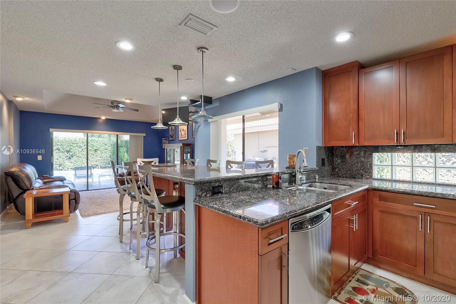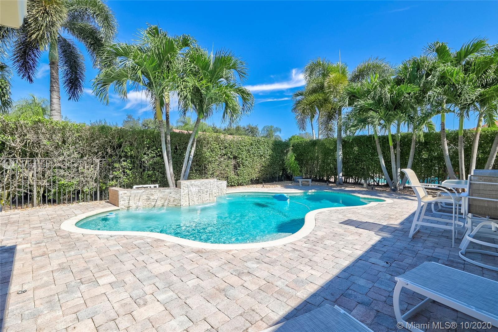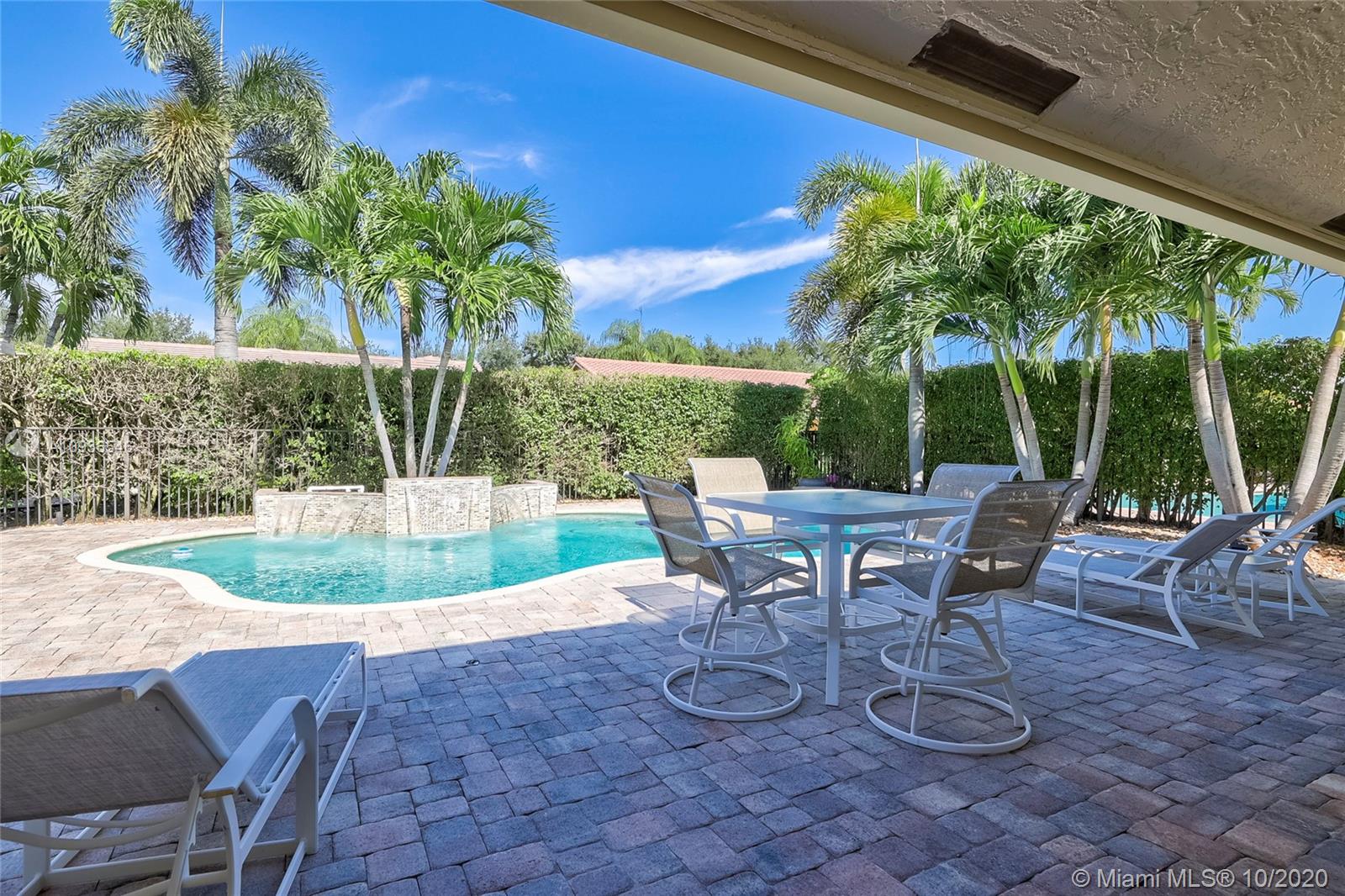 Move in ready 3/2 + office in fabulous gated Sunset Springs. Open floor plan with expansive living spaces. Updated kitchen featuring granite counter tops, wood cabinets, stainless steel appliances, undermount lighting and big center island/snack bar. Large master suite, big walk-in closet, and beautifully remodeled master bath with oversized walk-in shower. All secondary bedrooms are spacious, and second bathrooms has also been tastefully updated. Amazing pool area, with pavered deck, and built-in summer kitchen. Full hurricane protection, post Wilma Roof, 2 water heaters, and 2012 A/C.