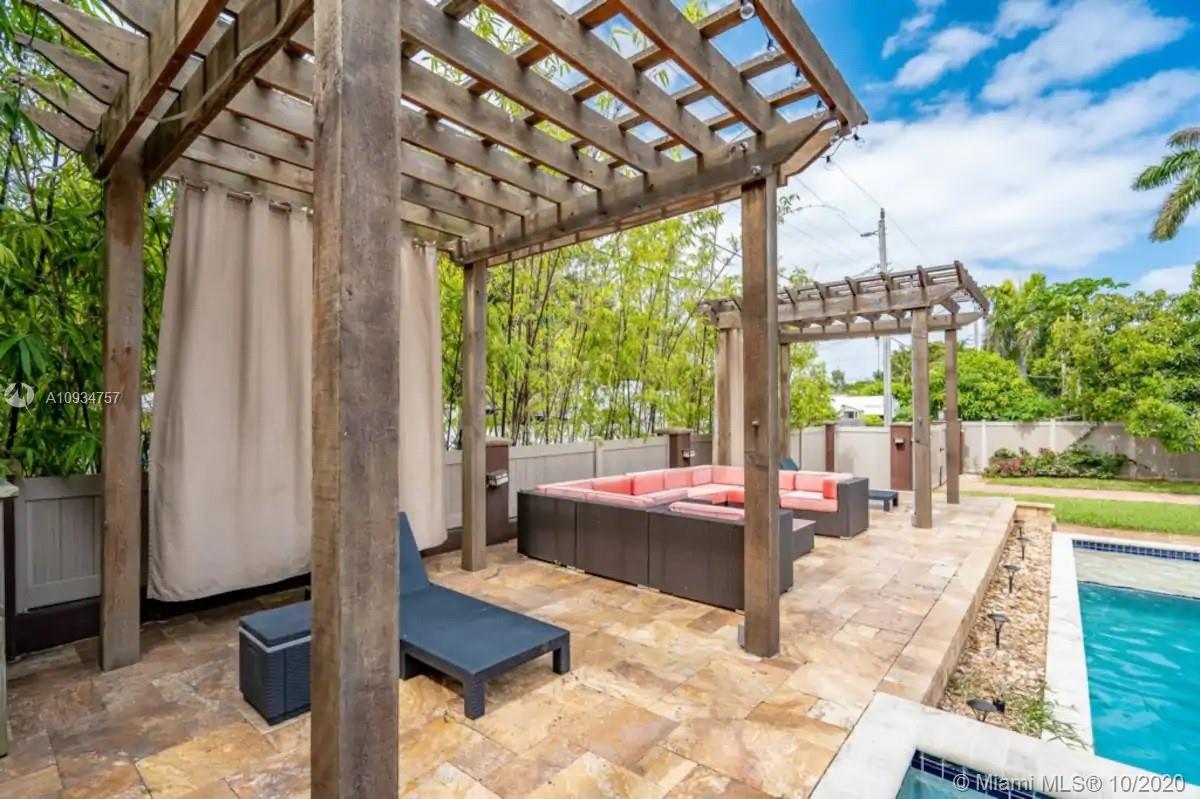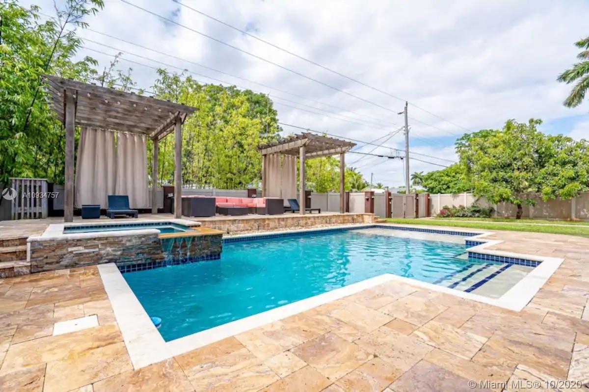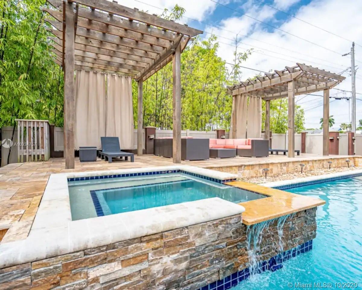 This Hollywood Dream House is a 2 bedroom 2 1/2 bathroom very spacious home with an open concept. Circular driveway with attached shaded pergola that can fit two full sized cars. Very clean and bright kitchen with all white cabinets and white appliances including fridge, gas range, microwave, garbage disposal and dishwasher. All windows and large sliding doors have been updated to hurricane proof quality. Completely renovated backyard with screened in porch and a great size heated pool and hot tub. Two detached pergolas and a 40' travertine stone raised deck surround the pool. Privacy fencing around the entire backyard with a driveway accessing the alley. Sprinkler system on a well. Home is located just 2 miles from Hollywood Beach and Boardwalk and 1 mile from Downtown Hollywood.