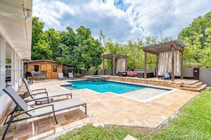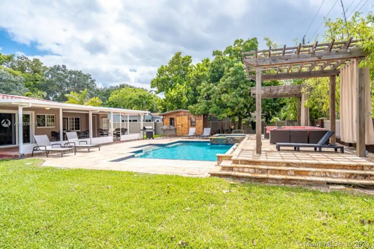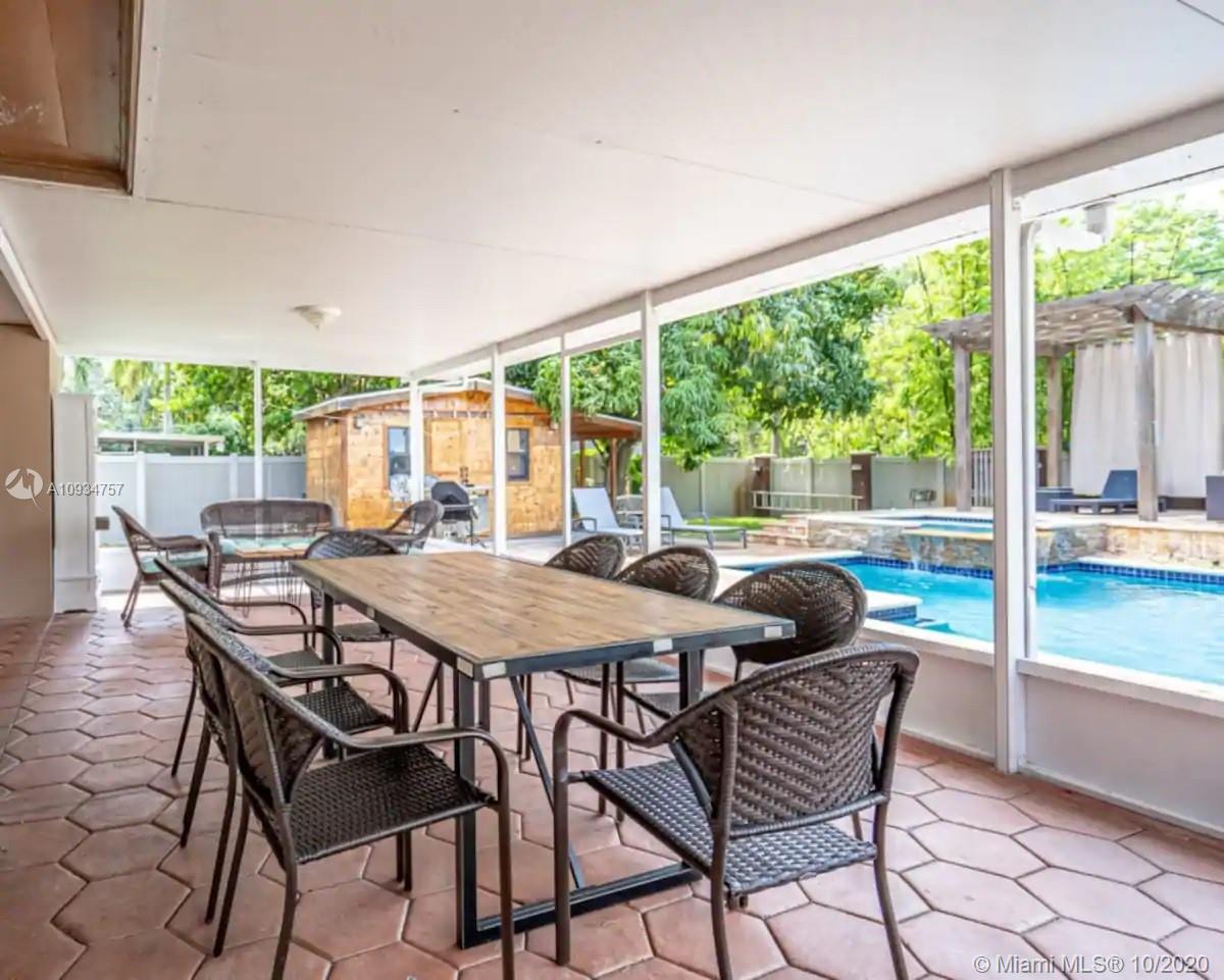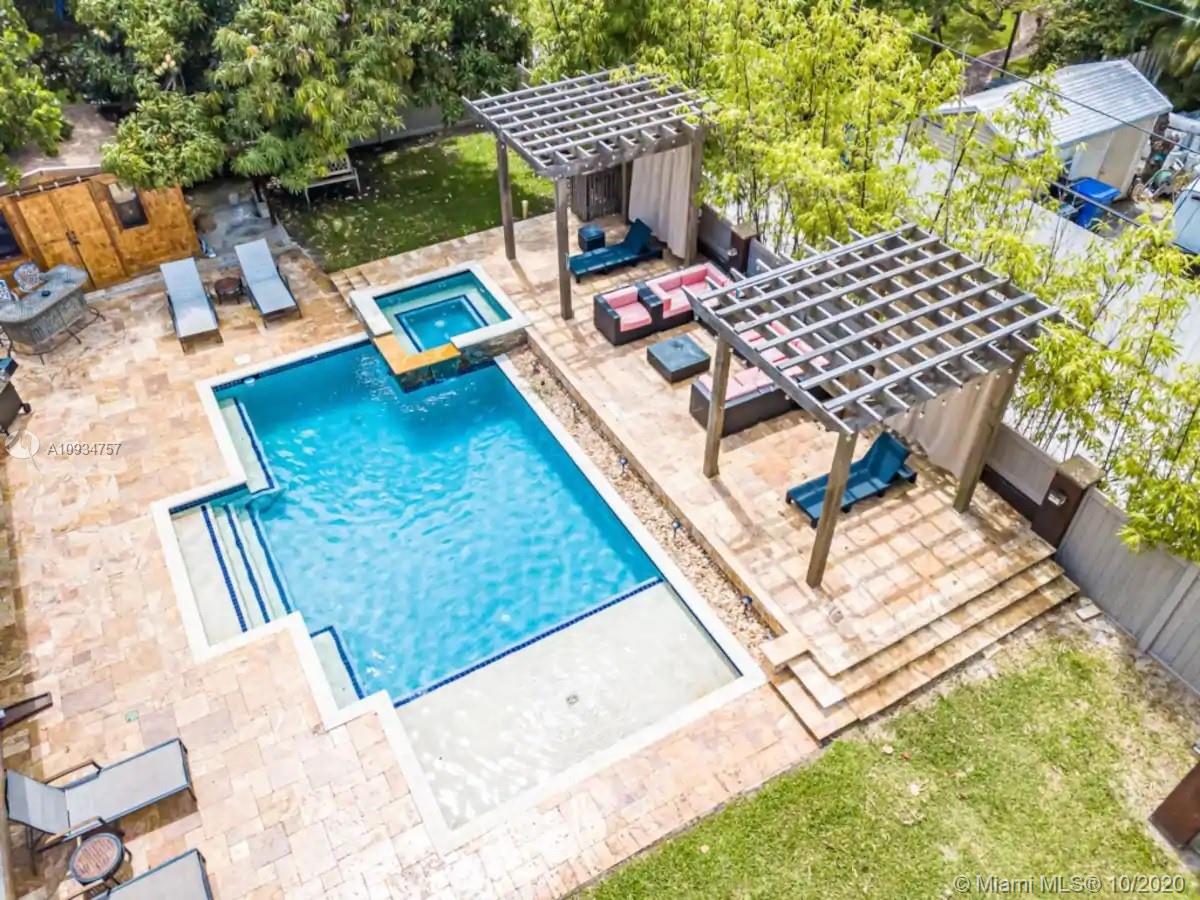 This Hollywood Dream House is a 2 bedroom 2 1/2 bathroom very spacious home with an open concept. Circular driveway with attached shaded pergola that can fit two full sized cars. Very clean and bright kitchen with all white cabinets and white appliances including fridge, gas range, microwave, garbage disposal and dishwasher. All windows and large sliding doors have been updated to hurricane proof quality. Completely renovated backyard with screened in porch and a great size heated pool and hot tub. Two detached pergolas and a 40' travertine stone raised deck surround the pool. Privacy fencing around the entire backyard with a driveway accessing the alley. Sprinkler system on a well. Home is located just 2 miles from Hollywood Beach and Boardwalk and 1 mile from Downtown Hollywood.