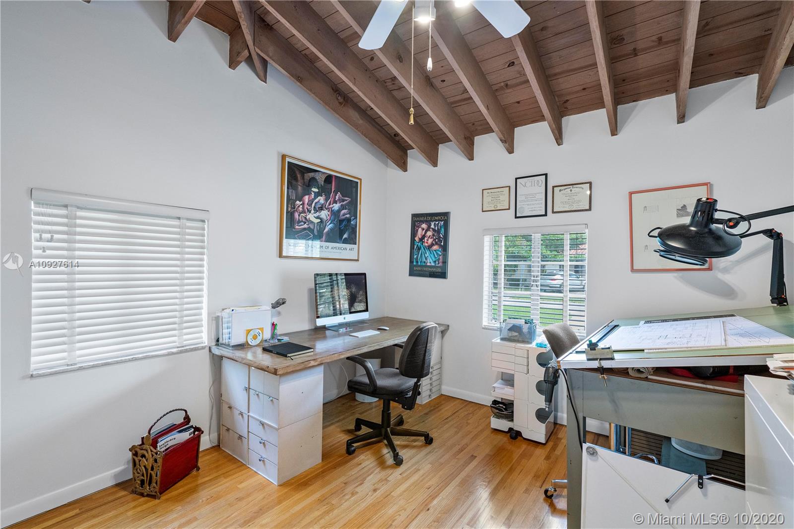 Situated in one of Miami-Dade County's most desirable neighborhoods, this oversized 10,500 SQ FT lot is nestled on a quiet street in Miami Shores Village. An open floor plan with 3 BDRMS, 2 BA, and a large Great Room consisting of Living, Dining, and Sun Room areas. Abundant natural daylight, cross ventilation, and large room volumes. Wonderful example of Mid-century Modern architecture built in 1952 and designed by famed Art Deco and MiMo architect, Gerard Pitt. Meticulously maintained by designer/owner/ author. Many original finishes abound: Oak slat floors, Cuban Tile floors, plaster walls and ceilings, ceramic mosaic tiles. Unique opportunity to own a MiMo classic with potential to renovate or expand.
