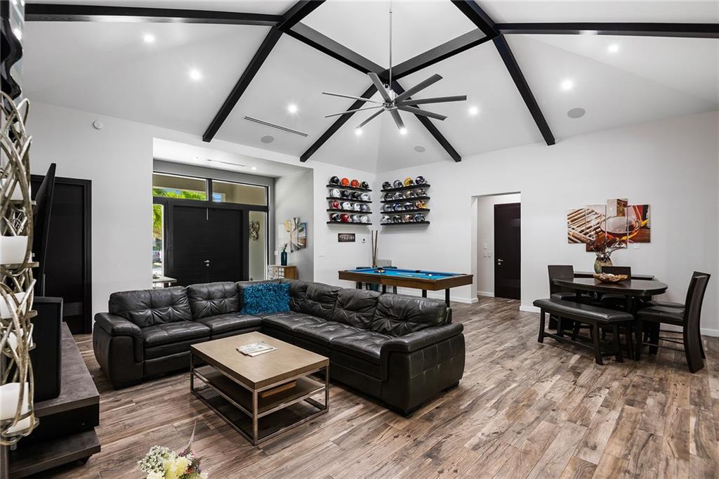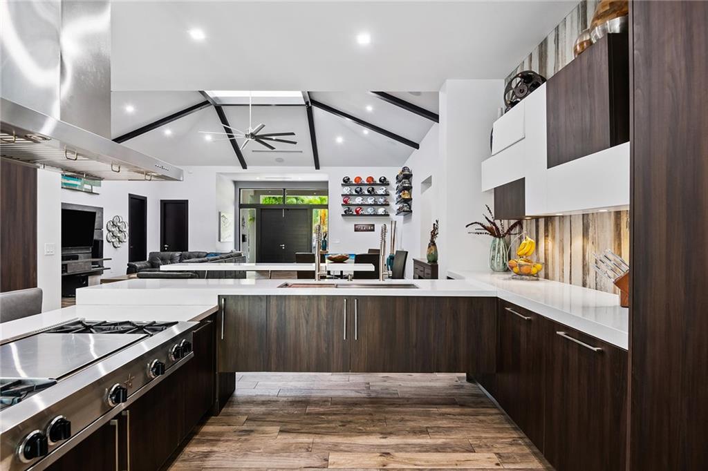 Refined contemporary with an authentic South Florida sensibility, this totally rebuilt (2015) deep water home offers single level living with a grand open concept floor plan. Enjoy the finest outdoor living with a salt water pool and sandy beach located right next to 75 ft of deep water in the secure, patrolled community of Seven Isles. Enter through double doors to a spacious great room with vaulted ceiling centered by an overhead cupola providing natural light. Kitchen with custom cabinets, quartz counters & natural gas cooking. Triple split bedroom floor plan, each with a full ensuite bath & custom closets, plus an office or 4th bedroom. Master bedroom with two walk-in closets & stackable glass doors to the backyard pool/waterway. Master bath with dual sinks, separate spa tub & shower.