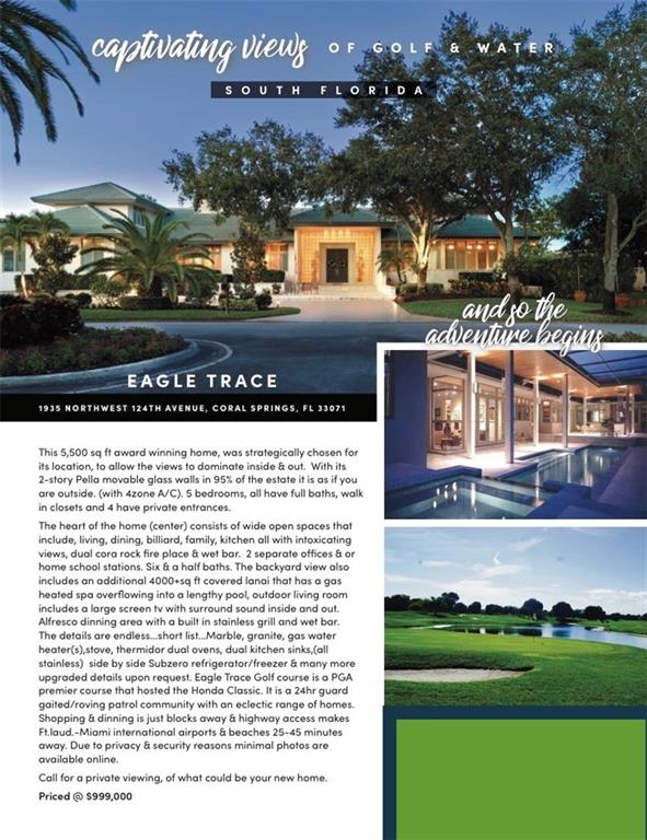 Tropical landscaping with coral, lead you inside where you are surrounded by 2story glass walls that, take advantage of the endless views. 5ooo+sq ft, 4/zone A/C, plenty of open spaces, 5 bed 6.5baths are strategically placed around the estate for family & guests to be comfortable & private. The home opens to a 4000+sq ft covered/screened lanai with a waterfall spa that spills into a refreshing lengthy pool. A stainless grill & wet bar are expecting alfresco dinning & the surround sound sets the mood. Add'l rooms: Formal living & dinning. 2 large offices, Family&billiard share, wet bar, dual fireplace. All open to the eat in kitchen/stainless appliances. FtLaud&Miami Int. airports mins. away.A complete list of details are available&photos are minimal 4 security reasons. Set an appointment!