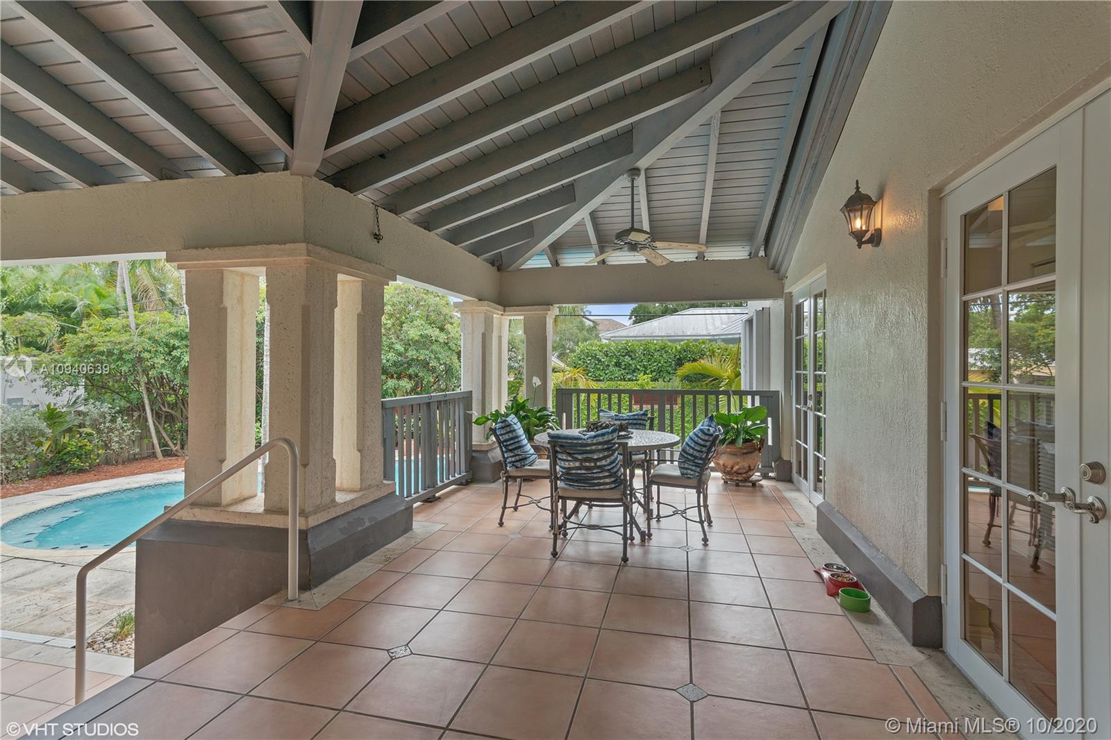 Tropical 2 story Key West style elevated Island home greets you with wood flooring throughout with cozy living and dining room with views to lush secret gardens. Some property features include integration of open kitchen with family room through a convenient pass through window. This residence offers numerous bedrooms with ample closet space plus an additional studio bedroom with bath. Second floor bedrooms open to a beautiful balcony. Luxury and spacious master suite have a wonderfully remodeled bath. All living areas lead to a double level terrace with a peaceful pool cascade, ready to enchant you with its serene landscaping. Property is completely fenced and easily accommodates parking for 3 vehicles. This home is the true epitome of Key Biscayne living. Photos are professionally staged
