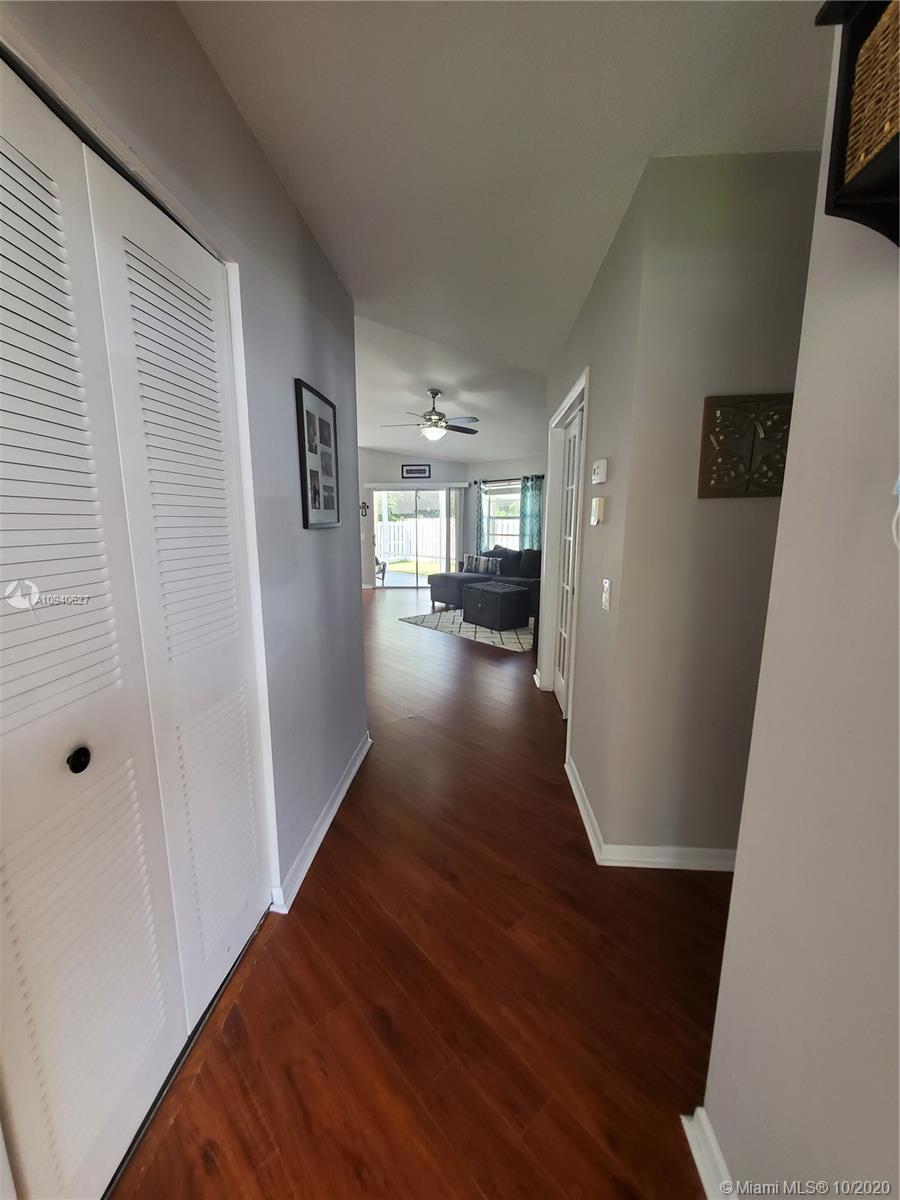 Beautiful, bright 3 bedrooms single family home sitting in a cul-de-sac. 1 car garage. Wood floors throughout the home, updated kitchen with granite countertop and stainless steal appliances. Bathrooms with updated cabinets. Very spacious backyard with screened patio and fenced. Accordion shutters. Community pool. Impeccable condition!