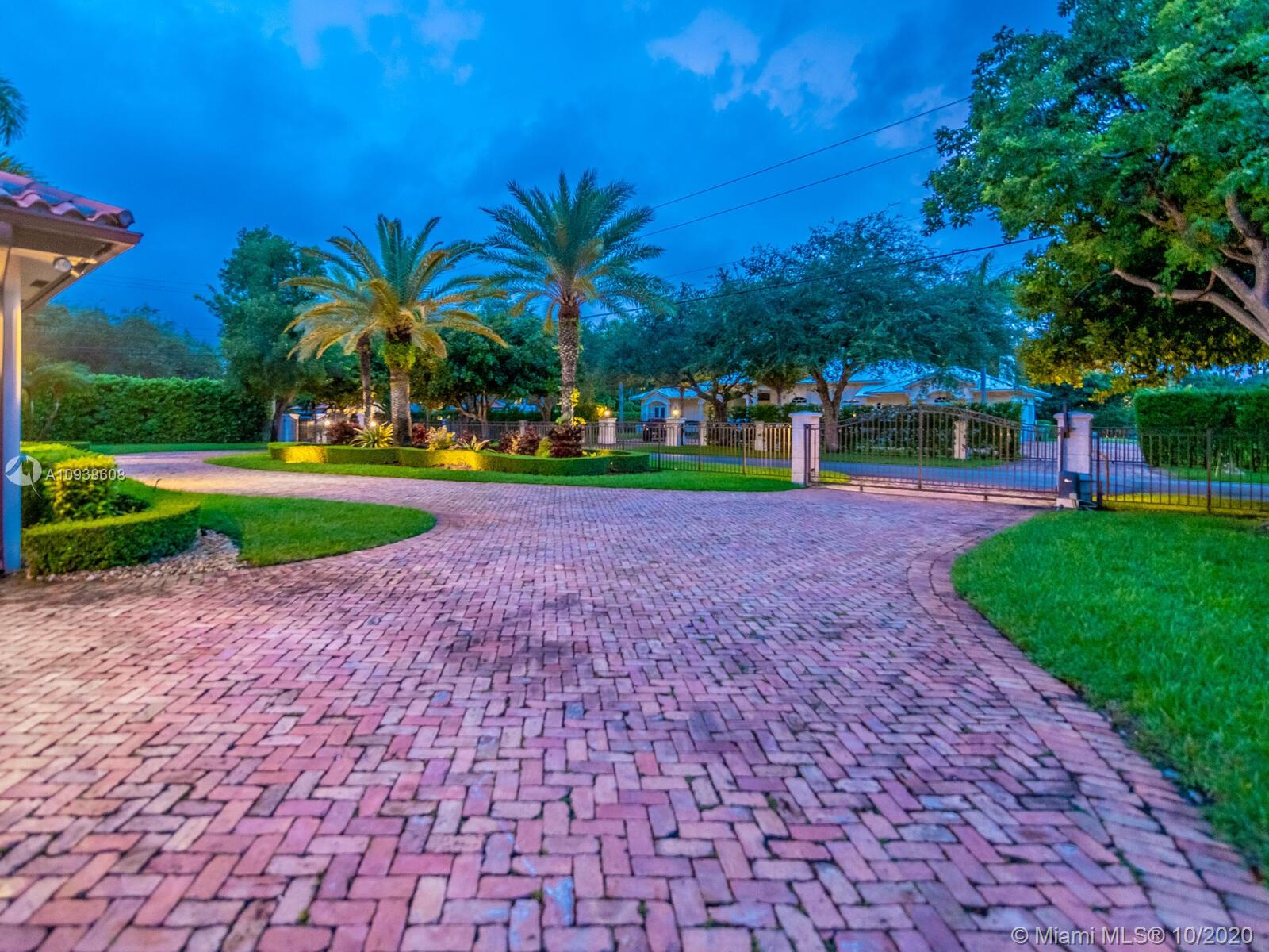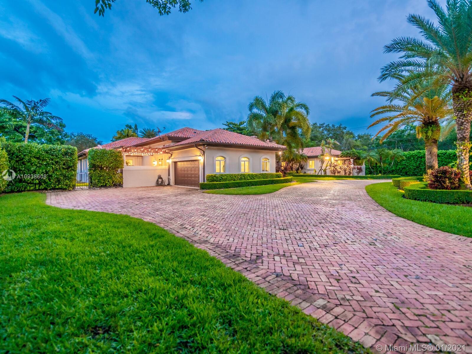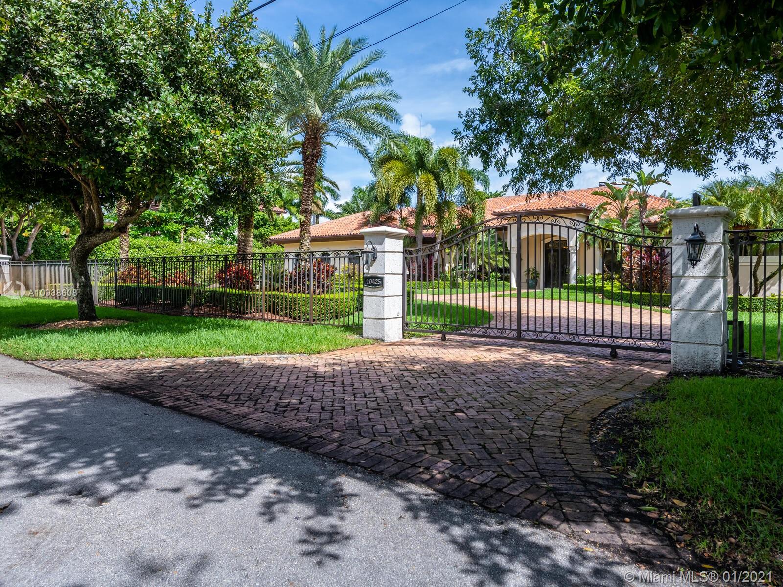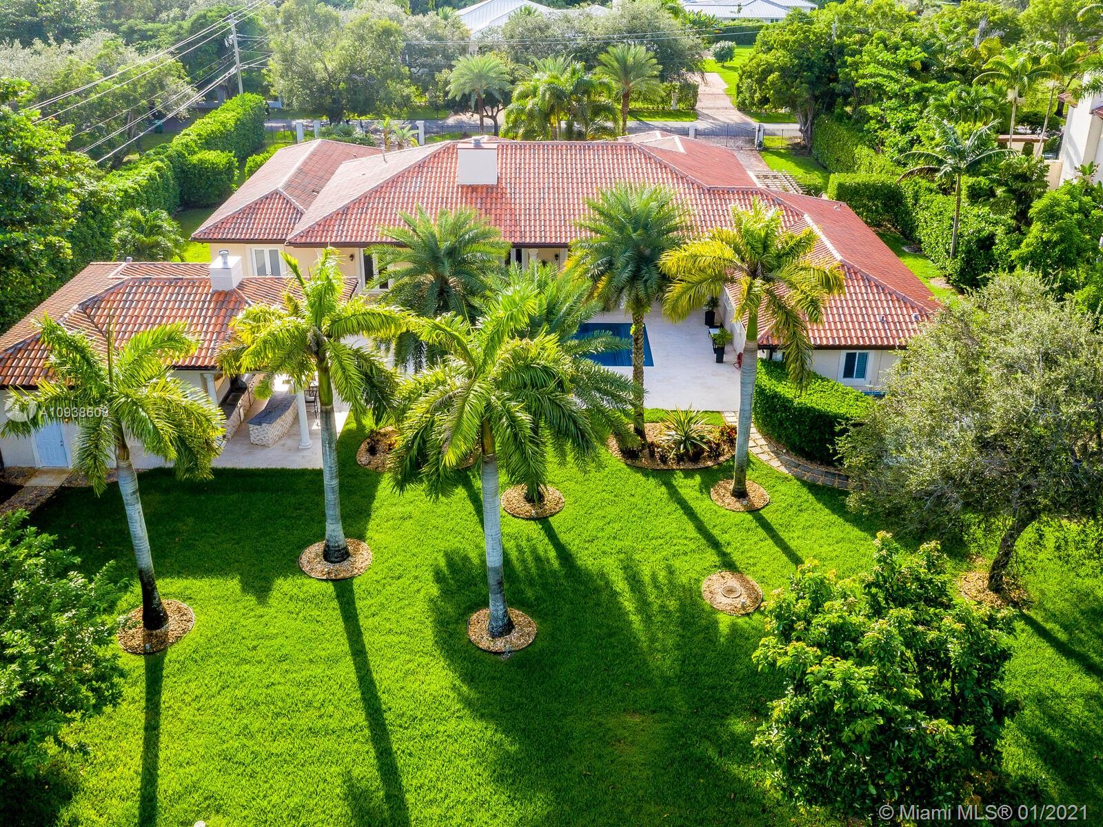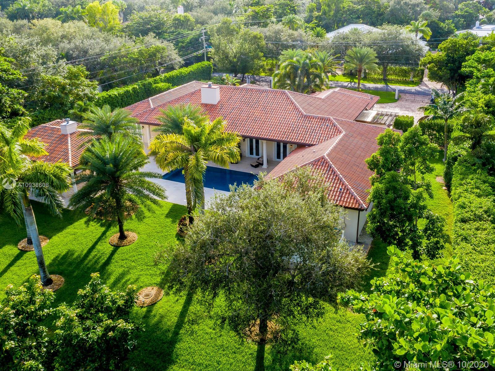Gated and gorgeous north Pinecrest private one-story acre estate with stunning palms positioned on huge backyard. Enjoy family gatherings with sonos surround sound and televisions while soaking in the sumptuous saline heated pool. Full summer kitchen and 830 sf apartment-sized poolside guest house with full cabana bath. Impact glass, marble floors, generously high ceilings, chef’s kitchen w/gas and full house 2-tank generator. Chicago brick paver motor court entry with 2-car garage offers ample space for guests and any size event. Top rated Pinecrest Schools.