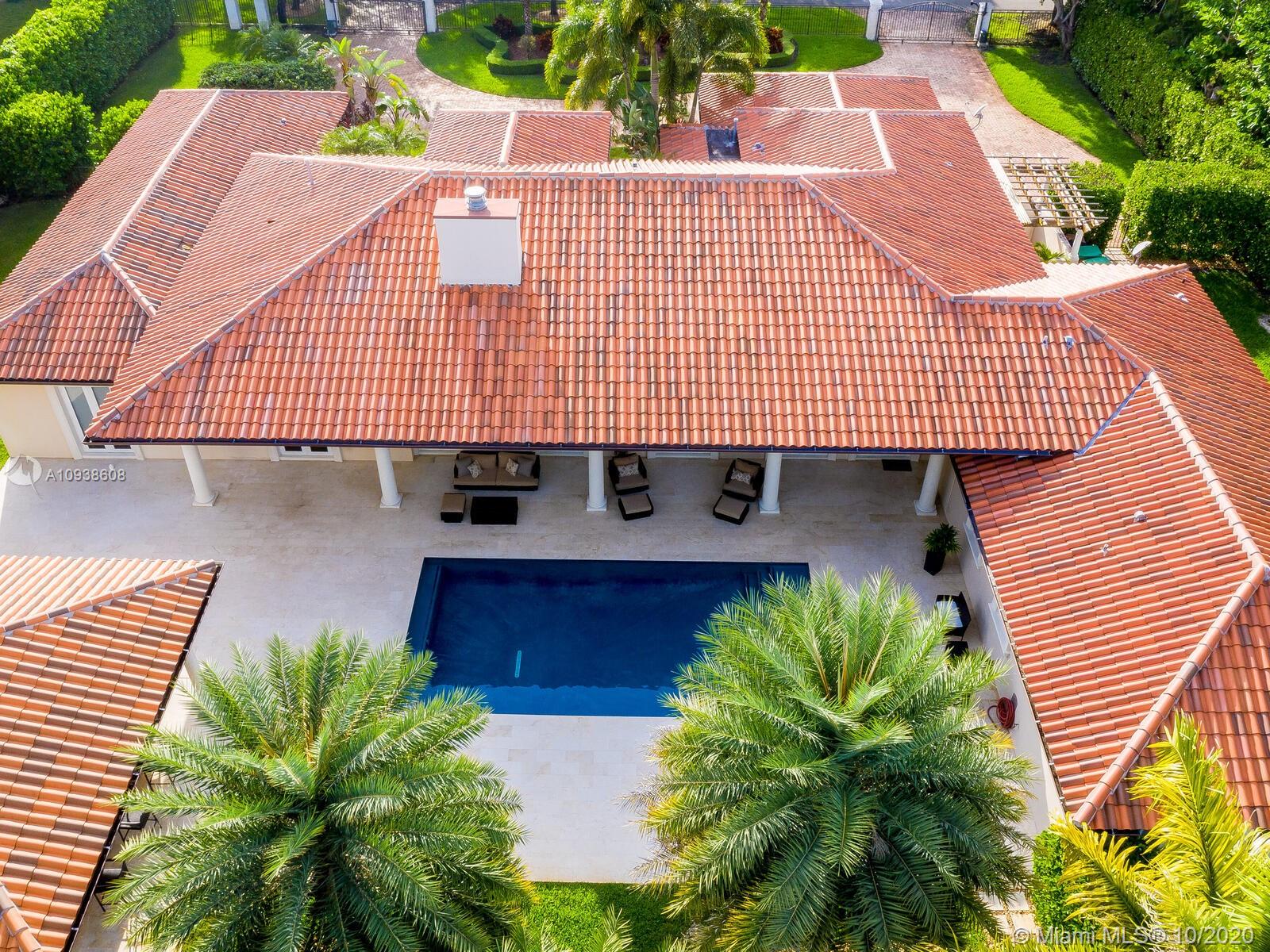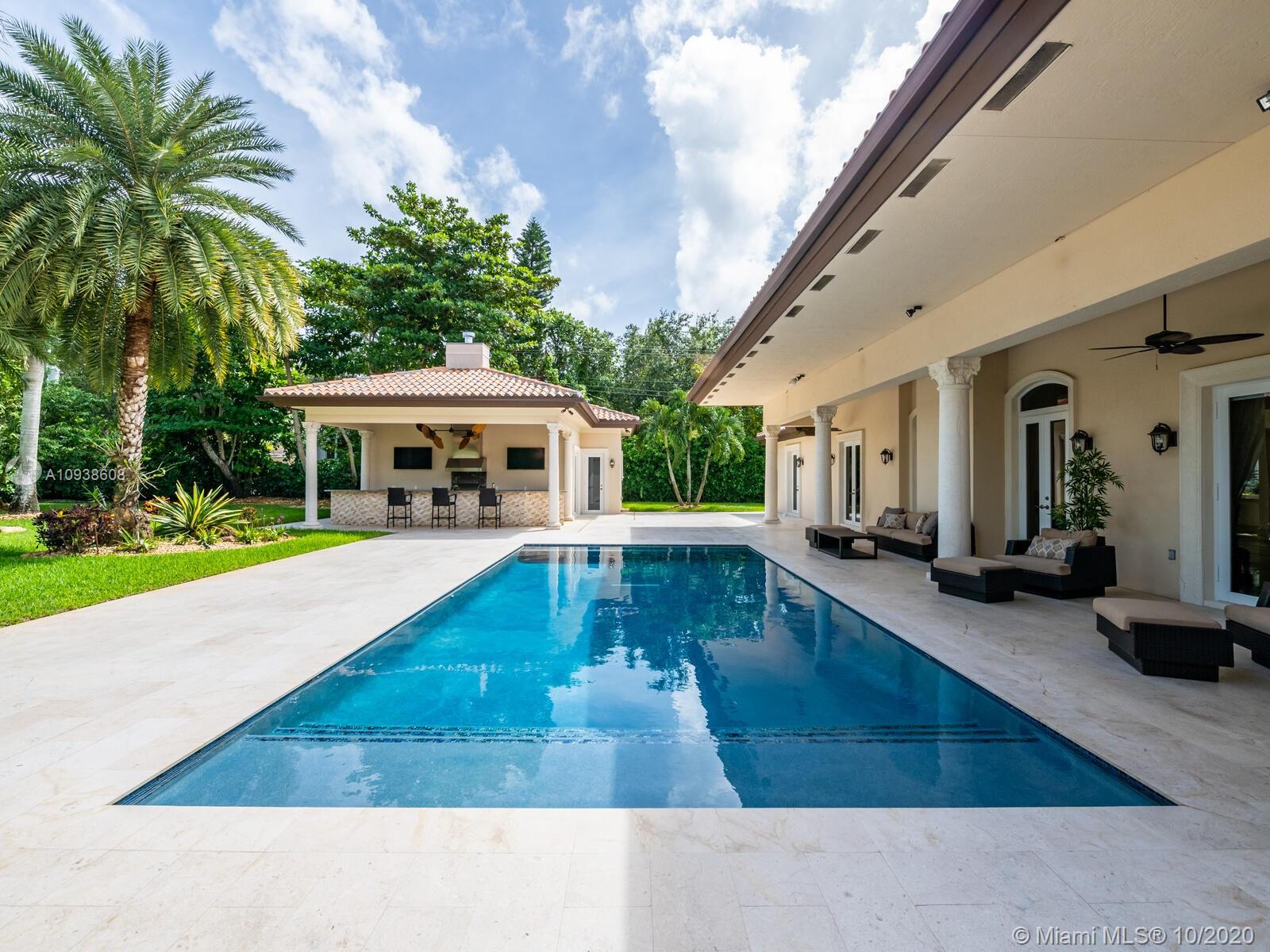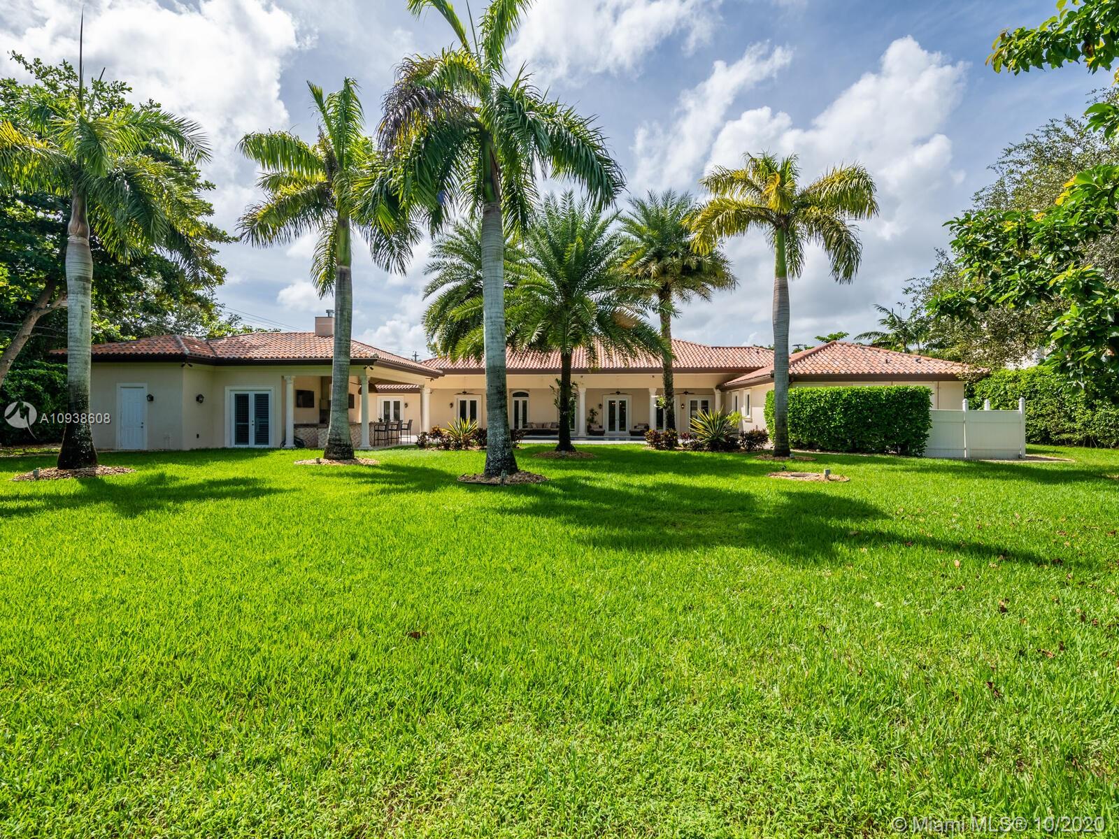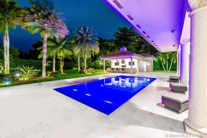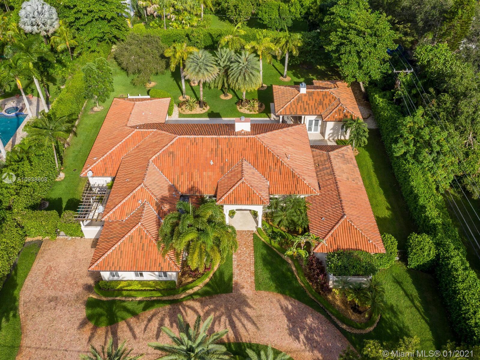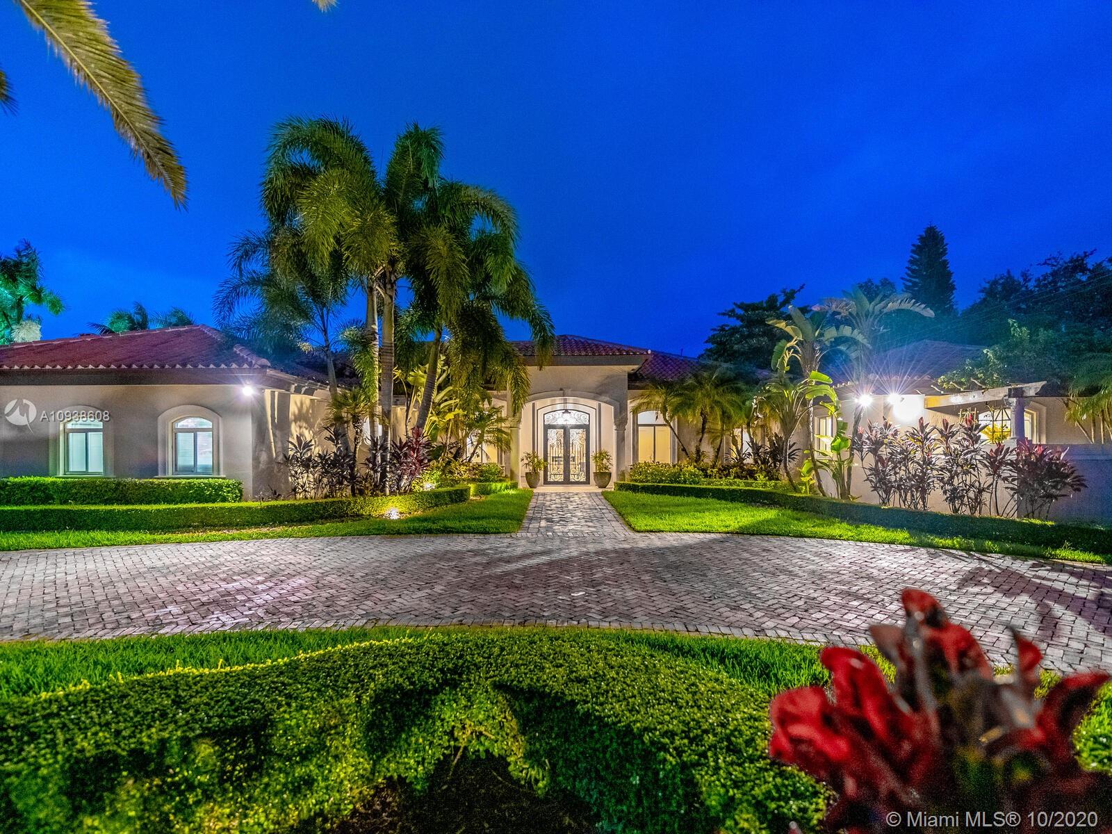 Gated and gorgeous north Pinecrest private one-story acre estate with stunning palms positioned on huge backyard. Enjoy family gatherings with sonos surround sound and televisions while soaking in the sumptuous saline heated pool. Full summer kitchen and 830 sf apartment-sized poolside guest house with full cabana bath. Impact glass, marble floors, generously high ceilings, chef’s kitchen w/gas and full house 2-tank generator. Chicago brick paver motor court entry with 2-car garage offers ample space for guests and any size event. Top rated Pinecrest Schools.
