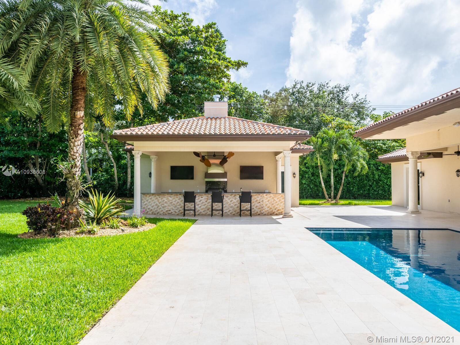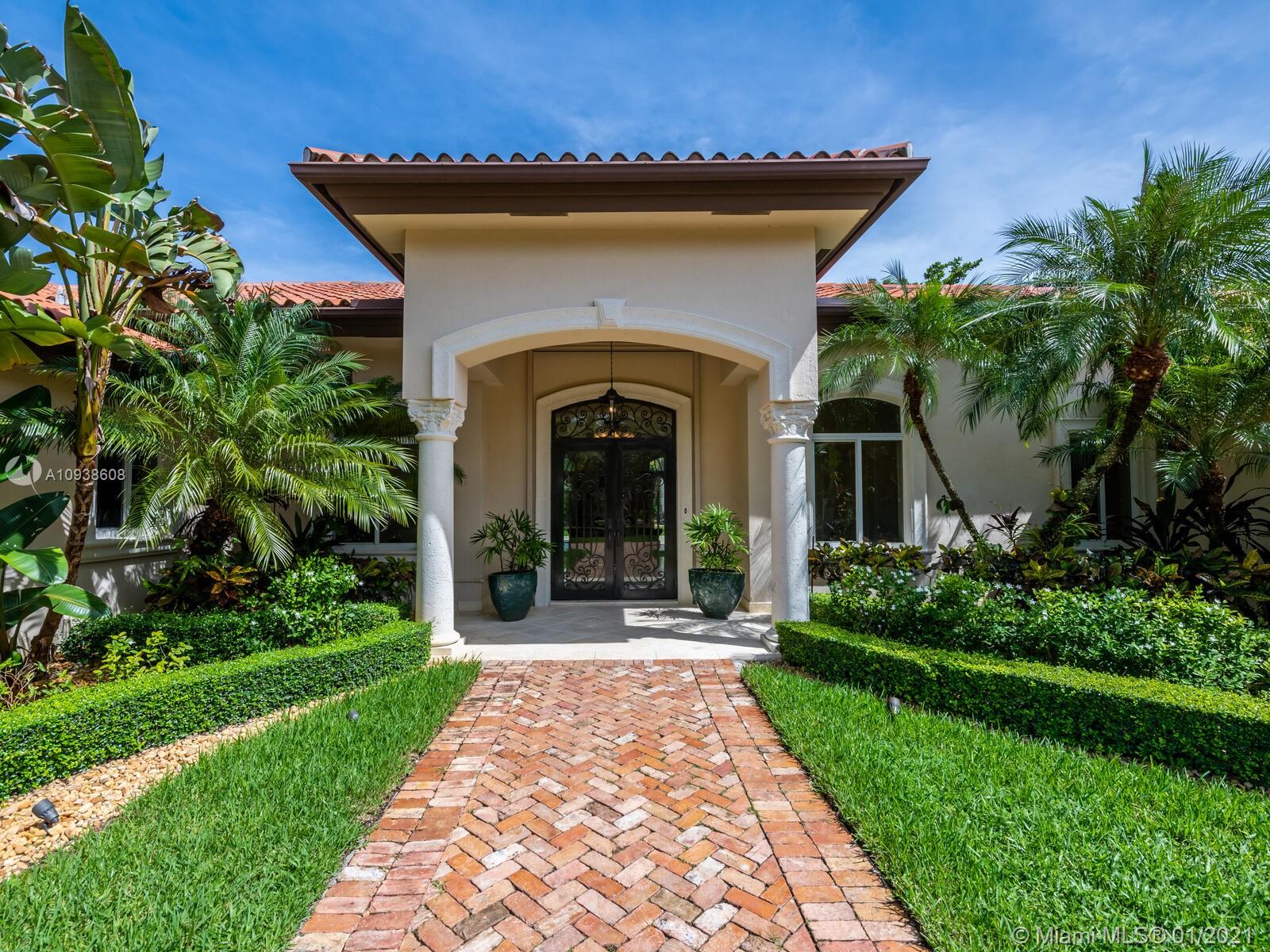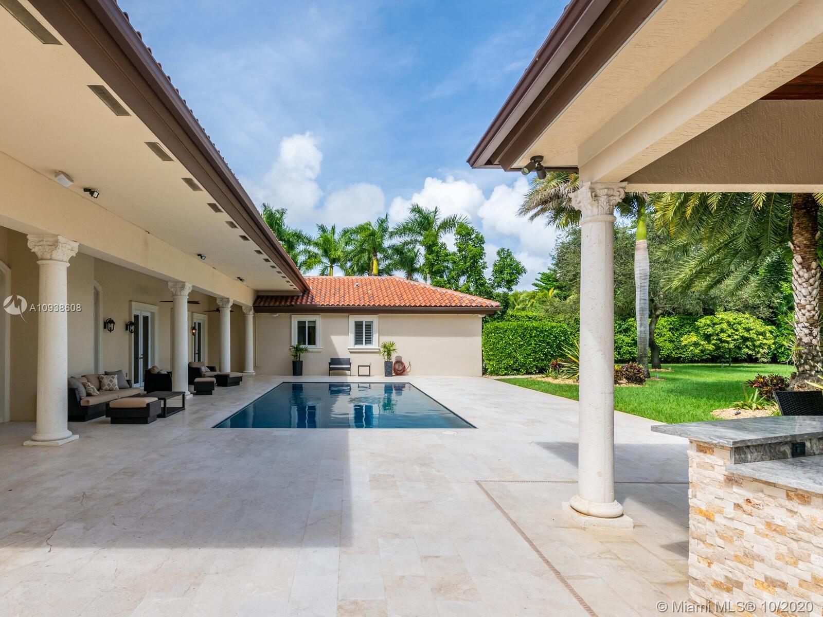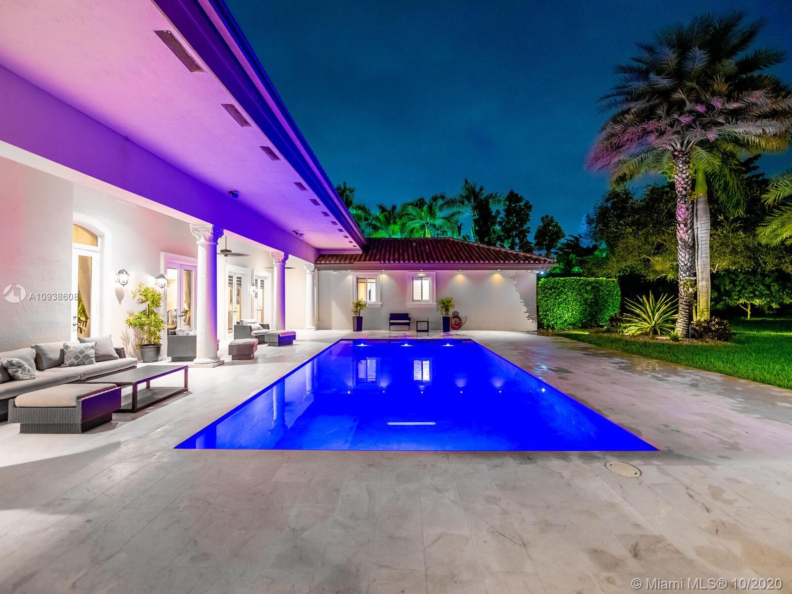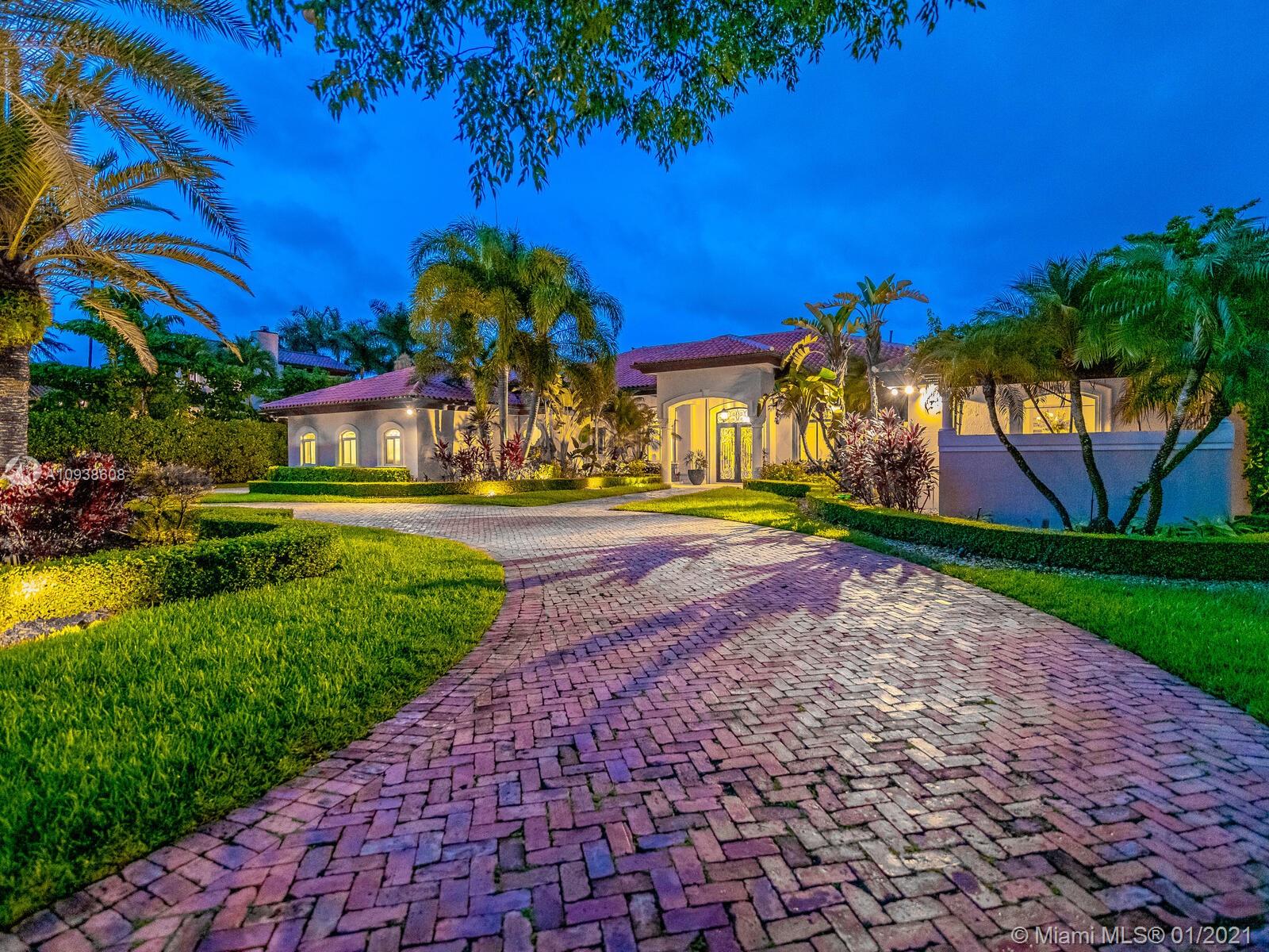 Gated and gorgeous north Pinecrest private one-story acre estate with stunning palms positioned on huge backyard. Enjoy family gatherings with sonos surround sound and televisions while soaking in the sumptuous saline heated pool. Full summer kitchen and 830 sf apartment-sized poolside guest house with full cabana bath. Impact glass, marble floors, generously high ceilings, chef’s kitchen w/gas and full house 2-tank generator. Chicago brick paver motor court entry with 2-car garage offers ample space for guests and any size event. Top rated Pinecrest Schools.