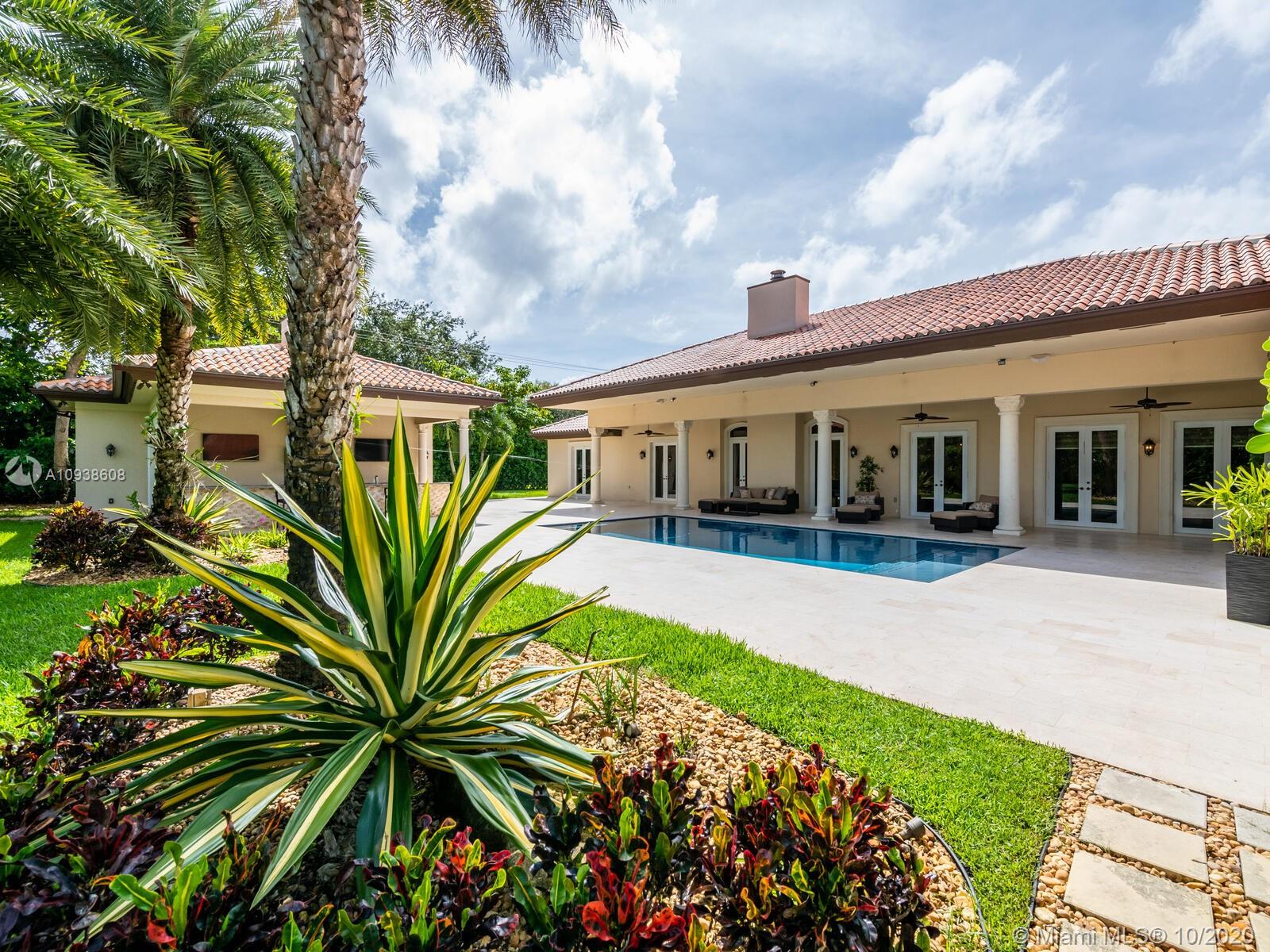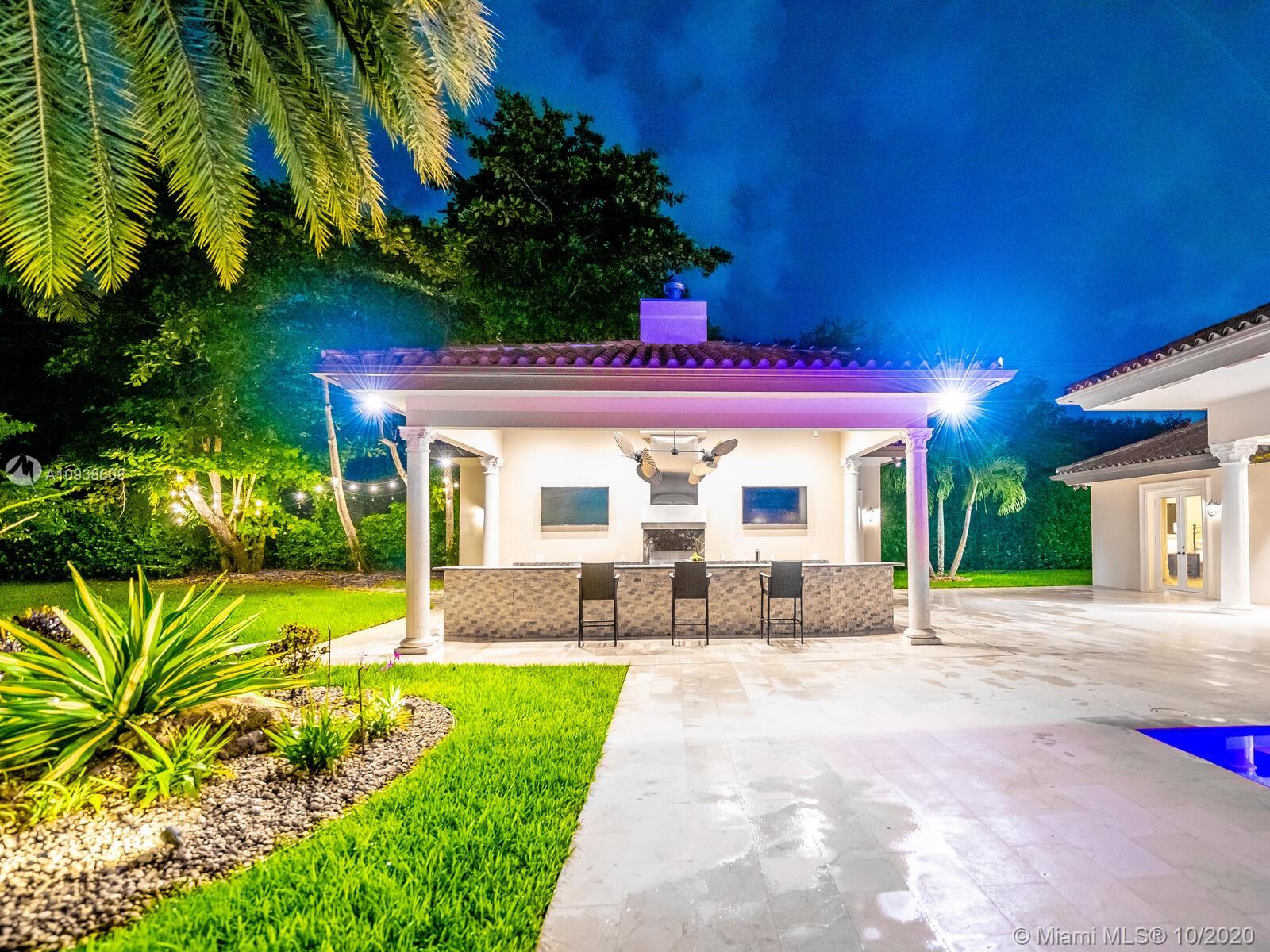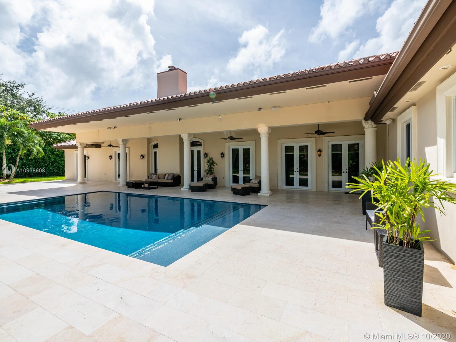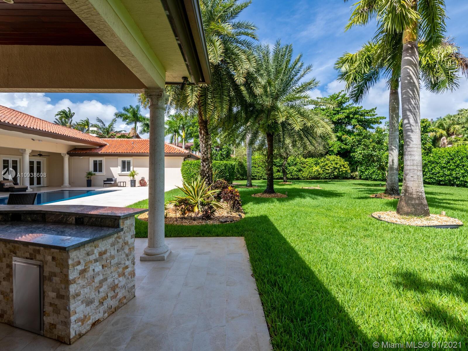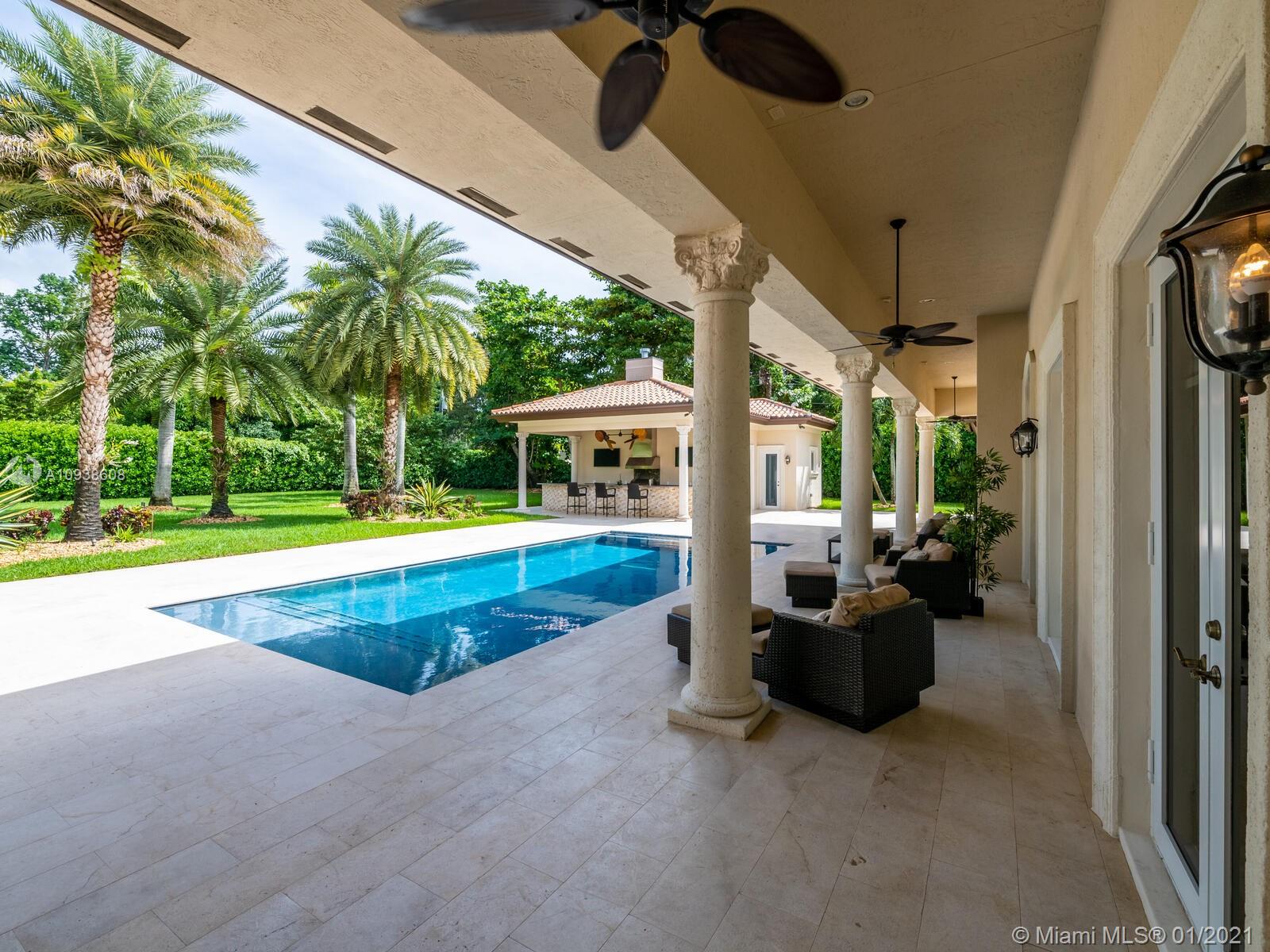 Gated and gorgeous north Pinecrest private one-story acre estate with stunning palms positioned on huge backyard. Enjoy family gatherings with sonos surround sound and televisions while soaking in the sumptuous saline heated pool. Full summer kitchen and 830 sf apartment-sized poolside guest house with full cabana bath. Impact glass, marble floors, generously high ceilings, chef’s kitchen w/gas and full house 2-tank generator. Chicago brick paver motor court entry with 2-car garage offers ample space for guests and any size event. Top rated Pinecrest Schools.