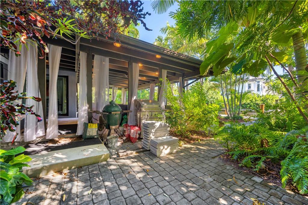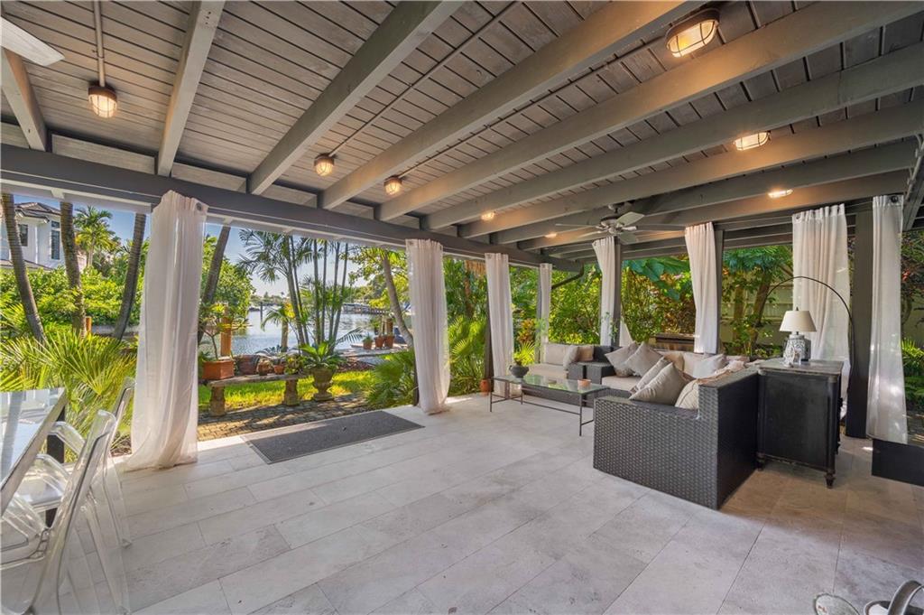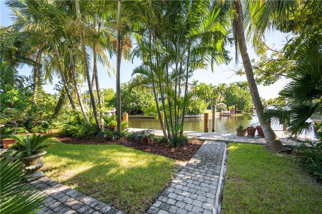 Island location on a 75 foot wide lot with extended views and five foot side setbacks, this home lives like a sophisticated summer lake house - perched above the water beneath mature foliage overlooking a peaceful canal with wide views down Rio Navarro. A central living space open to the outdoors with hurricane impact rated sliding doors onto a covered patio. The white modern kitchen has honed granite and professional series stainless appliances. The living area also has a wood burning fireplace and dark stained Ketchum tile flooring. Two guest bedrooms with hall bath are located off the living area while a third bedroom suite and office niche are located opposite. The 50' x 4' dock has a 10,000 lb boat lift with easy access to the Intracoastal.