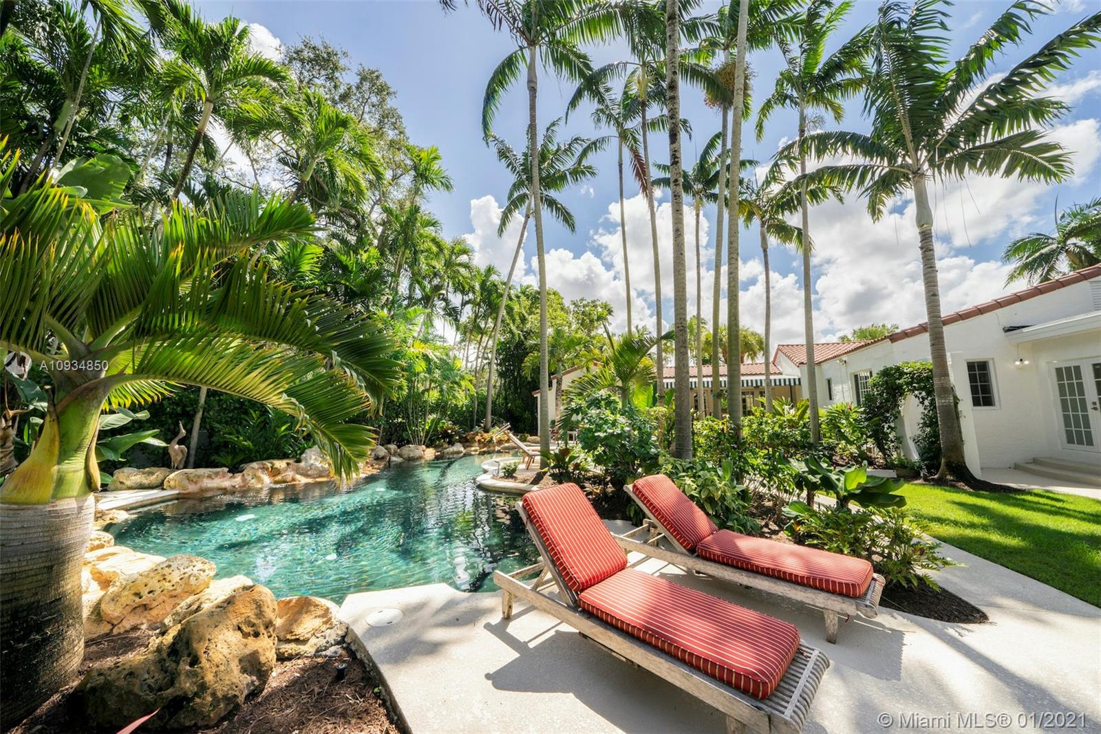 Welcome to "Deux Jardins!” An immaculate 4bd/3ba pool home situated on an expansive half acre corner lot. Enjoy lush landscaped gardens w/abundant palm & fruit trees, lagoon pool w/waterfalls, perfect for private, grand entertaining. Single story private gated estate features a spacious living room w/vaulted ceilings & covered exterior terrace offering seamless blend of indoor/outdoor living. Fall in love w/its charm & architectural details: pecky cypress ceilings, fireplace, archways & wood floors. New gas kitchen includes Thermador appliances, Woodmode cabinets & quartz counters. Residence also features a porte-cochere, 2-car garage, all impact glass, laundry room, & smart home technology. Located just minutes from great schools & Miami Shores Country Club, your new home is here!