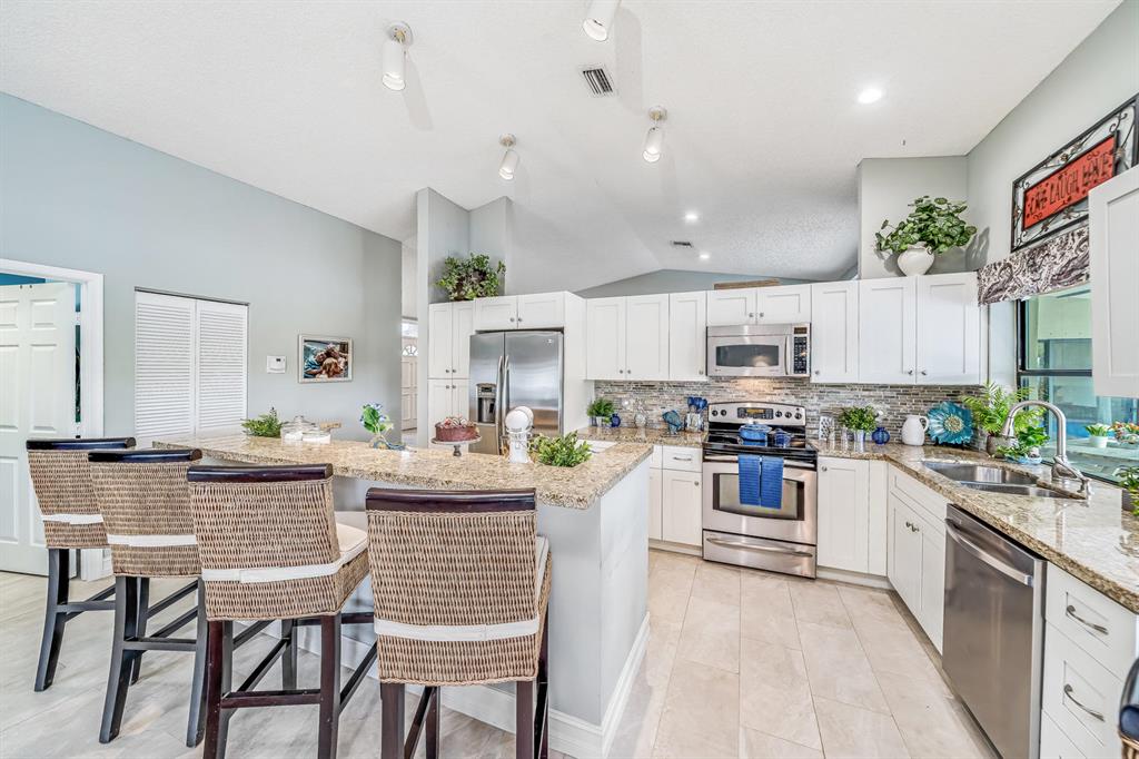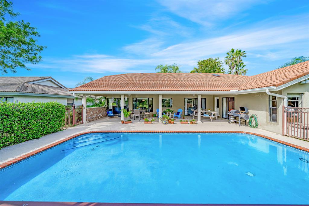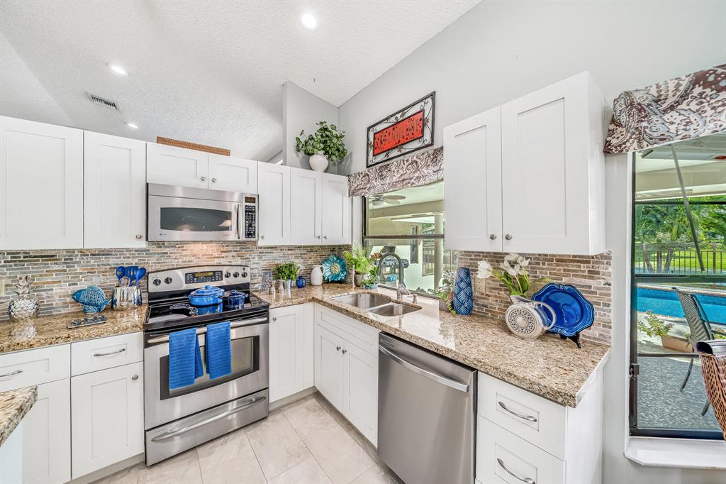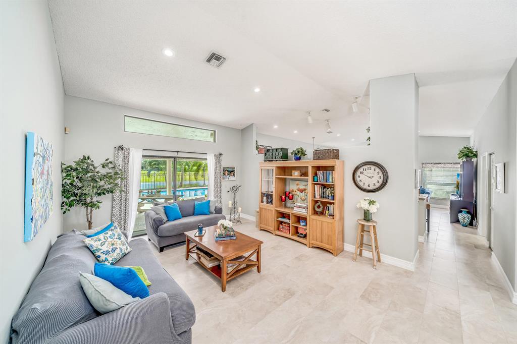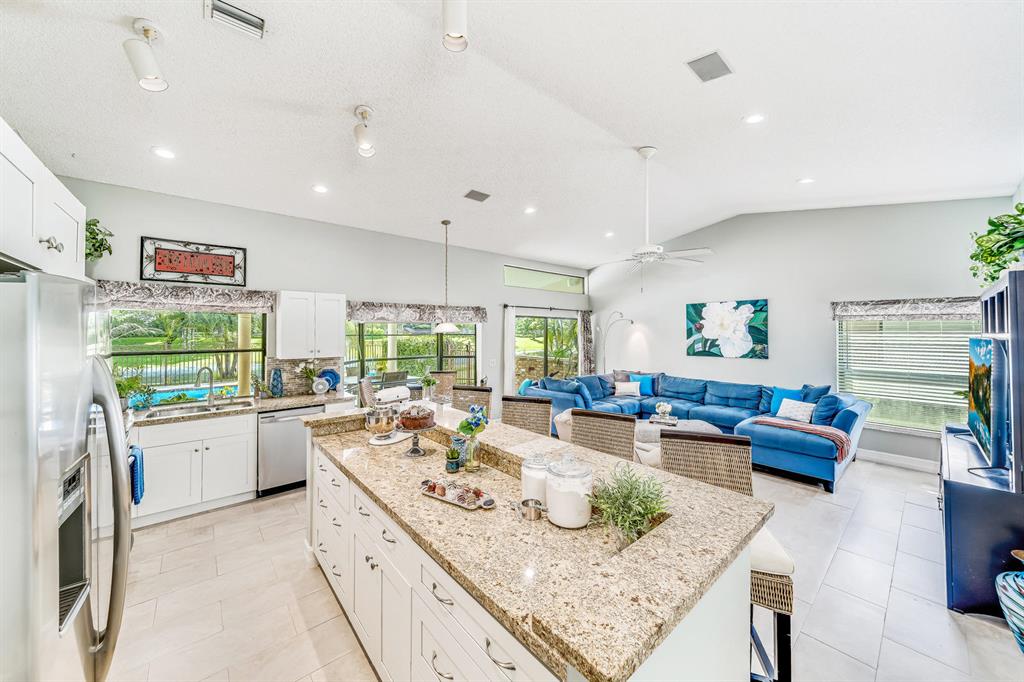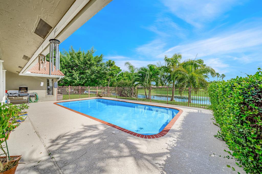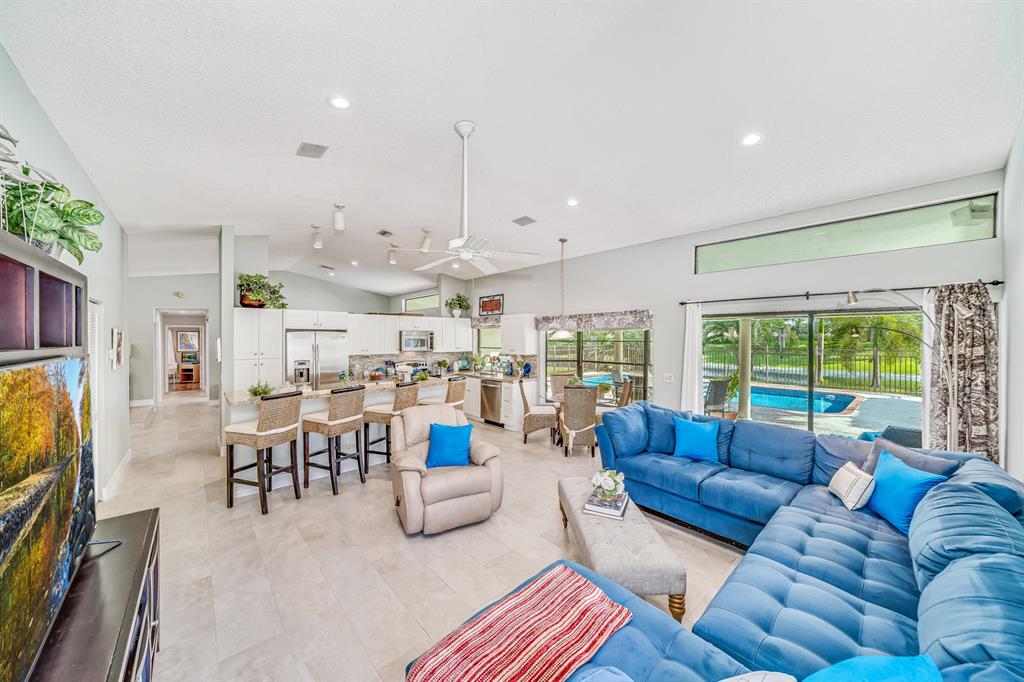 Island Lakes Waterfront Pool Home on a Huge Lot! Spacious 4 bedrooms, 2.5 baths & 2 car garage, pool & lakefront home w/ soaring cathedral ceilings, open floor plan w/tile flooring throughout living area & wood/laminate flooring in all the bedrooms. Gourmet kitchen features granite counter tops & stone tile backsplash plus an Island, SS appliances, white wood shaker cabinetry w/pull out drawers, pantry, plenty of cabinet storage, an eat in area & so much more. Expansive family room off the kitchen. Large Living and dining room as well. Master suite features 2 huge his and hers walk in closets. Tons of sliders that all lead to the amazing tropical oasis private back yard. Covered patio overlooks the sparkling pool and canal. Surprise visitors include Blue Heron birds, Egrets and more!