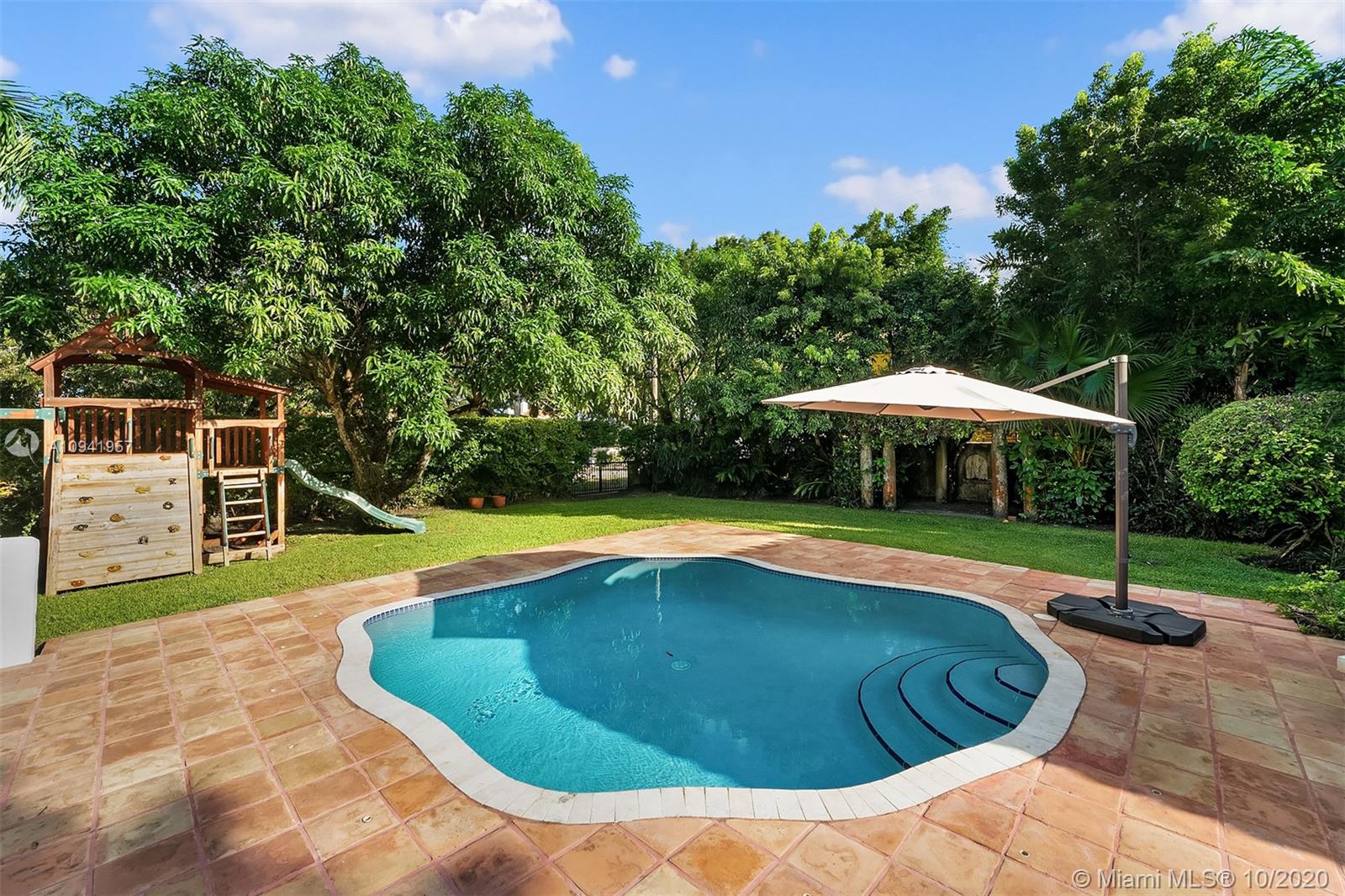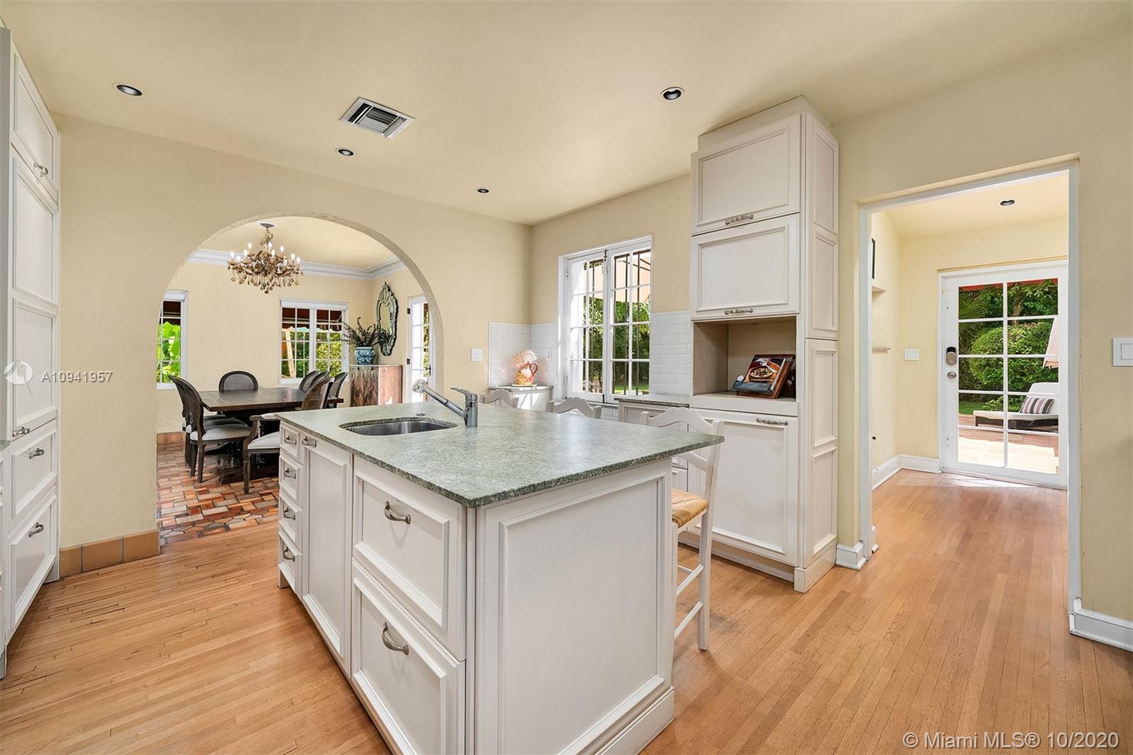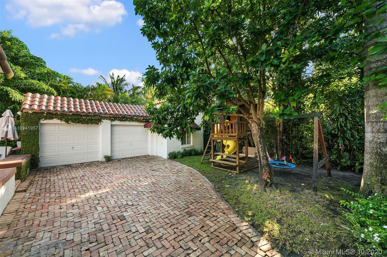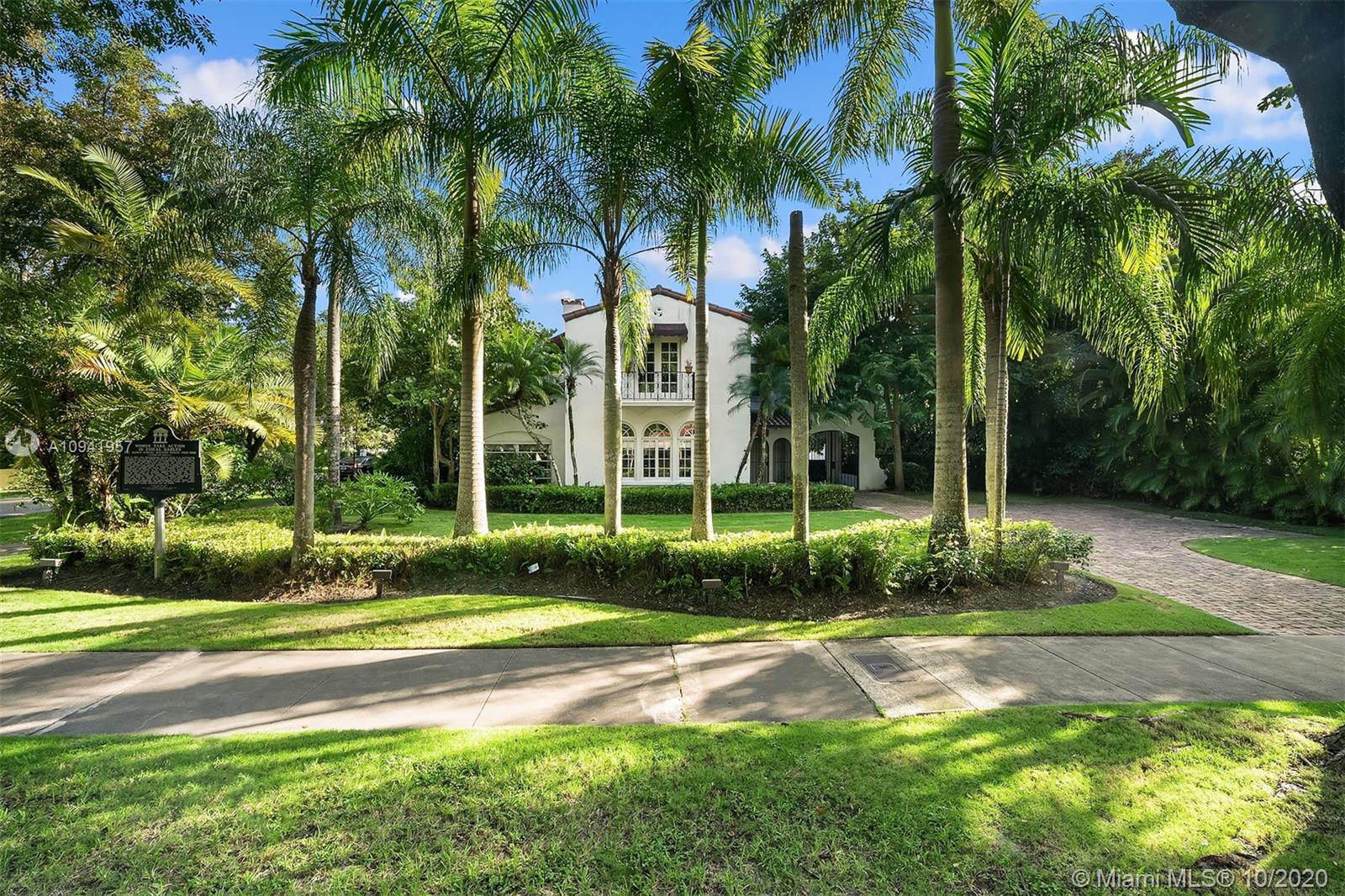 Embrace the history and lifestyle of Coral Gables with this two-story Mediterranean Revival residence. Stepping inside this beautiful home is like stepping back in time, with its arched windows, iron railing staircase, Spanish and terracotta tile, and original Dade County Pine floors. The main home includes three bedrooms with balconies, two bathrooms, a chef's kitchen with antique white cabinets and high-end appliances, and a living room with a gas-fueled fireplace for additional comfort. Nestled in a lush, leafy garden with fruit trees are a 1/1 guest suite, lagoon-style pool, patio, children's playground and garage. This home is minutes away from cafes, restaurants, shops and a selection of premier schools.