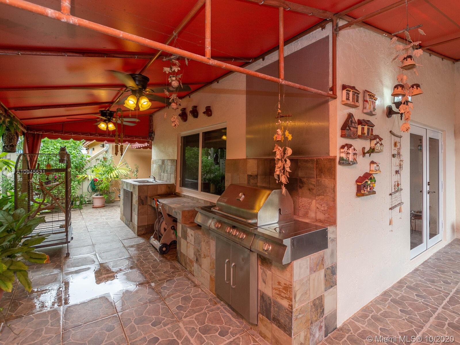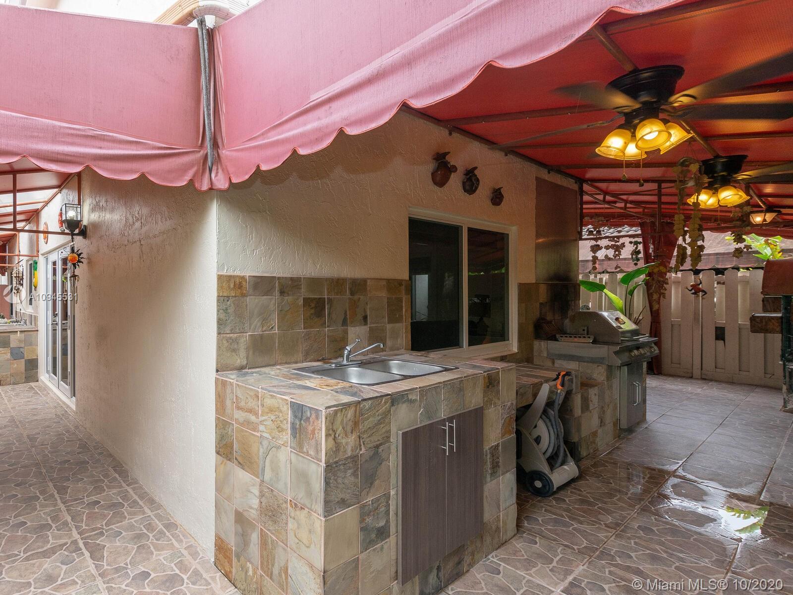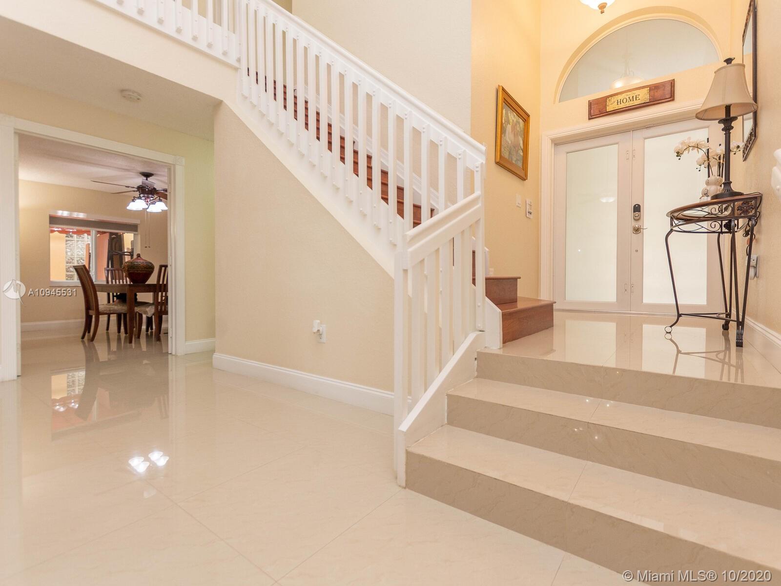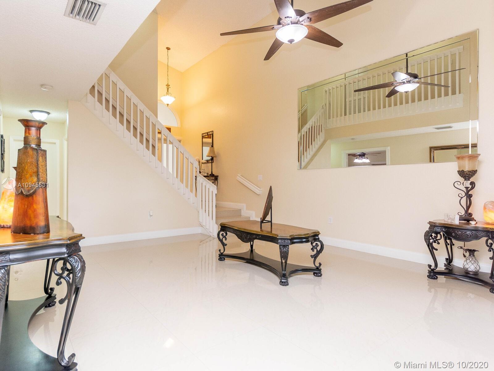 Outstanding single family home with 4 bedrooms and 2 1/2 bathrooms. Ceramic tiles on first floor, laminated wood on second floor. Wrap around terrace. Water heater and A/C with just 3 years of use. Blinds, two freezers, gas BBQ, separate gas burner, outside kitchen, ceiling fans all included. Impact doors and windows. Marble counter top. Six security cameras with 2 TV monitors. Back yard with lots of trees. Home was painted two years ago. Association includes cable, alarm and lawn.