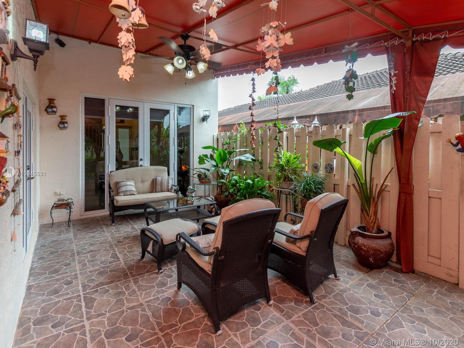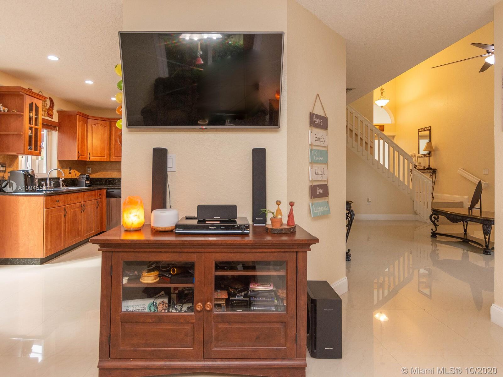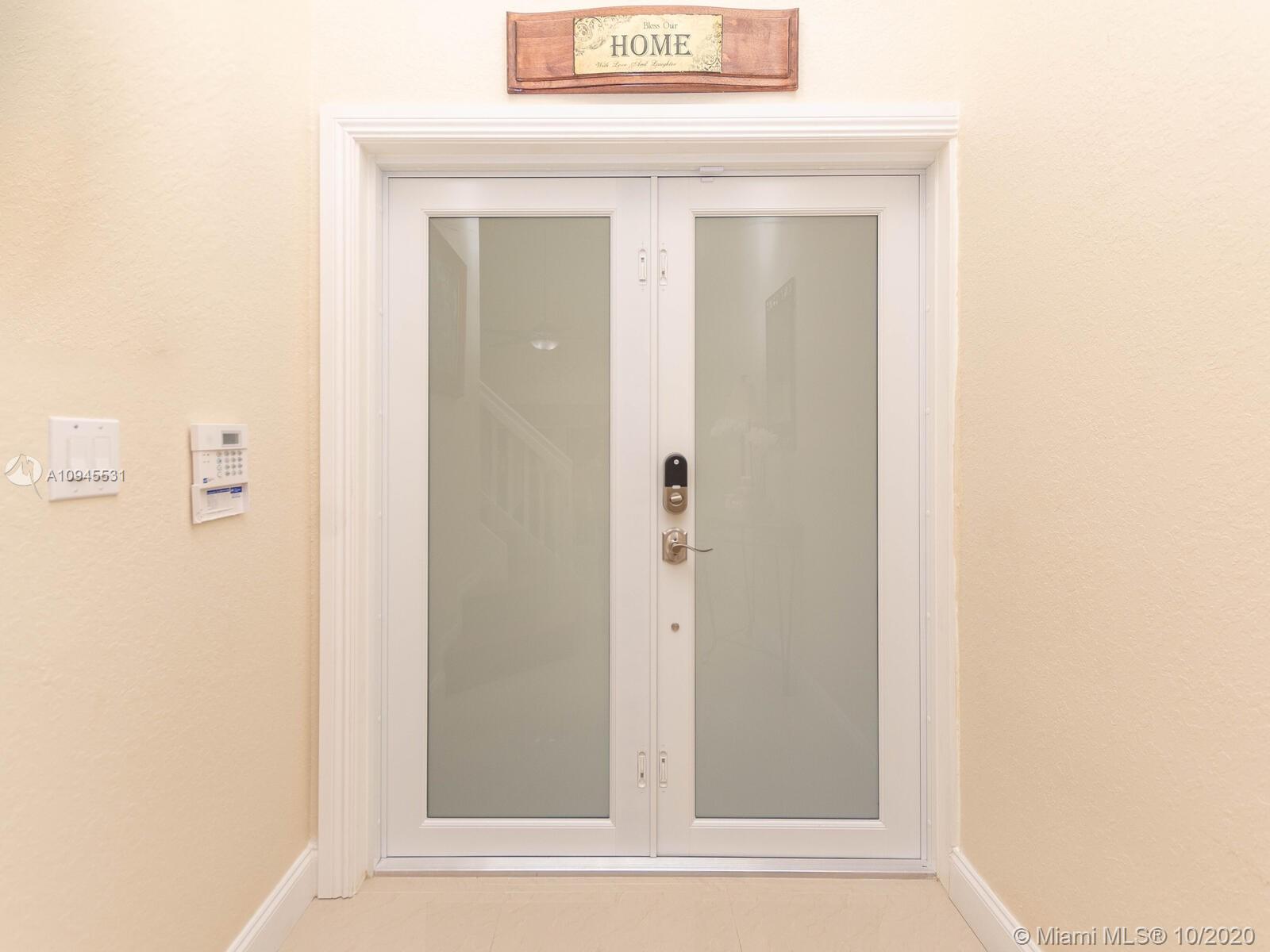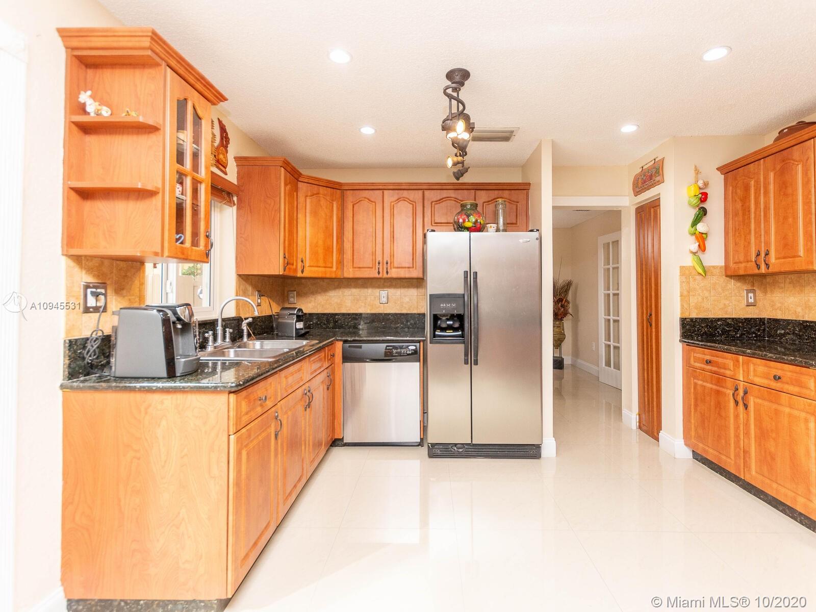 Outstanding single family home with 4 bedrooms and 2 1/2 bathrooms. Ceramic tiles on first floor, laminated wood on second floor. Wrap around terrace. Water heater and A/C with just 3 years of use. Blinds, two freezers, gas BBQ, separate gas burner, outside kitchen, ceiling fans all included. Impact doors and windows. Marble counter top. Six security cameras with 2 TV monitors. Back yard with lots of trees. Home was painted two years ago. Association includes cable, alarm and lawn.