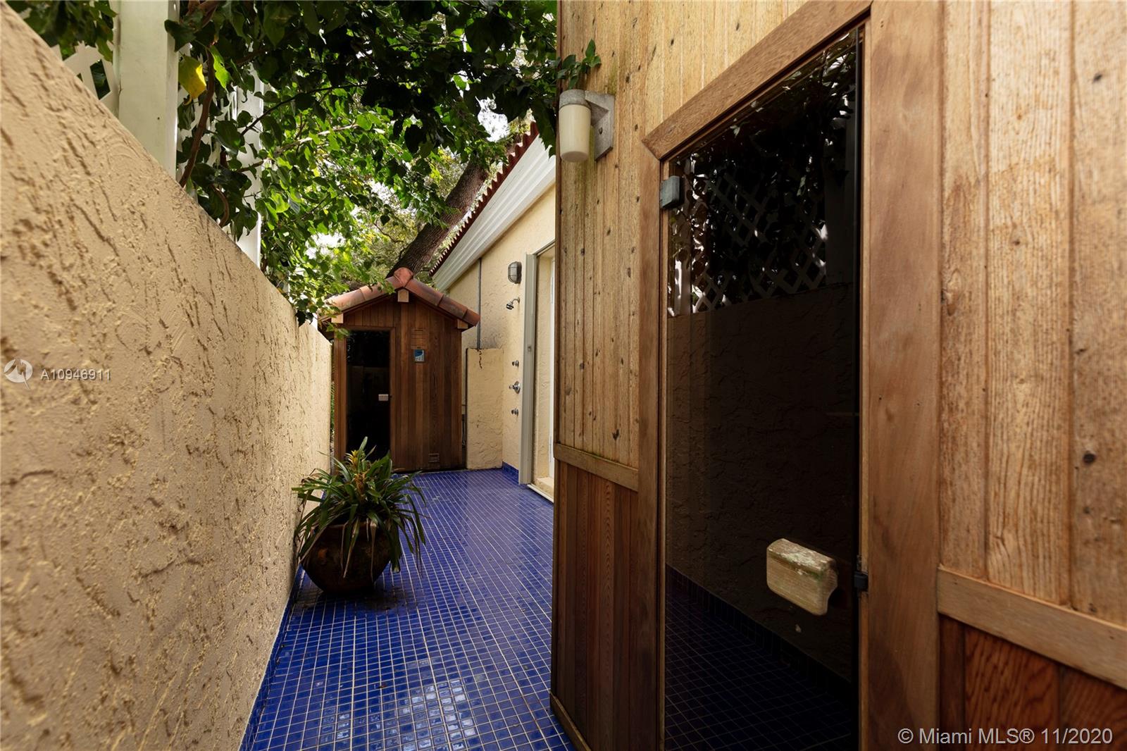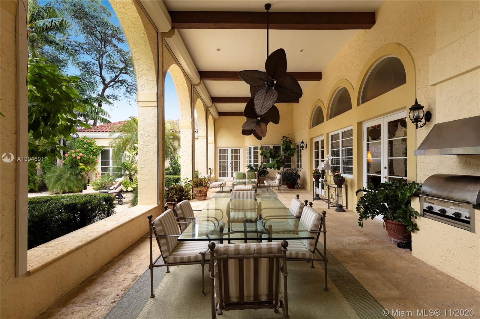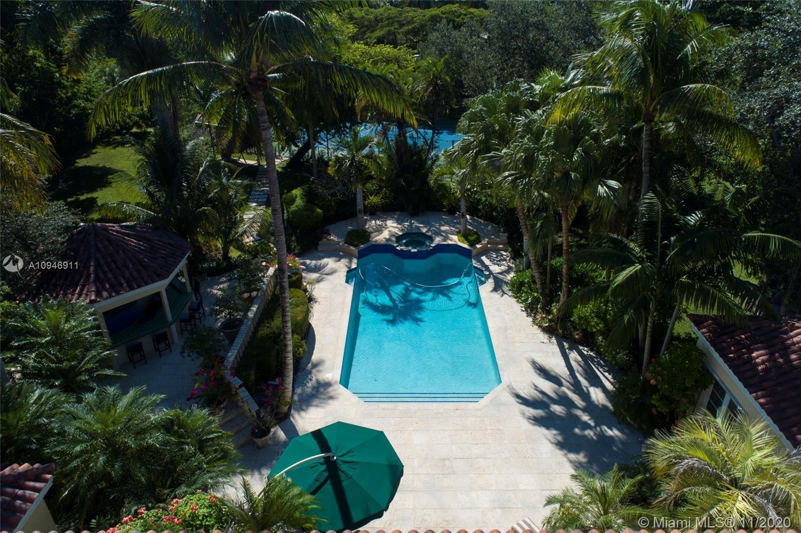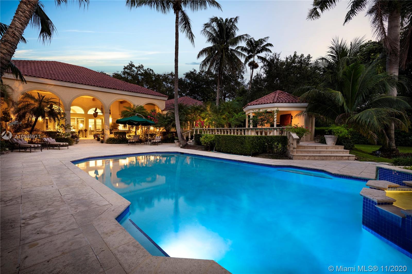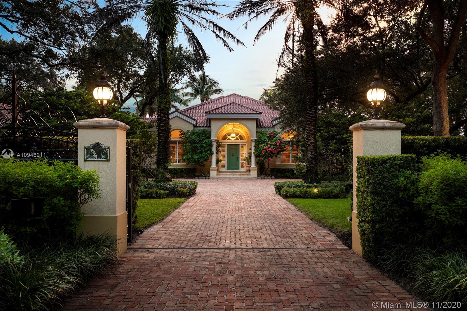 Rare opportunity to own an expansive gated estate on almost 2 acres in the prestigious Village of Pinecrest. A blend of elegant and traditional styles, this spacious home with grand ceilings unites in the light-filled great room. A wet bar connects the oversized chef's kitchen equipped with top of the line appliances and skylight. Split floor plan separates 4 bedrooms and library from the opulent master wing, complete with home office, gym, outdoor sauna and steam room. Abundant outdoor entertainment spaces featuring loggia, pool/spa, pavilion with summer kitchen and cabana bath, chickee hut, tennis court and canal access encompassing a serene tropical garden paradise; 3-car garage and ample space for guest parking. Superb private and public schools nearby. A private haven awaits you here!