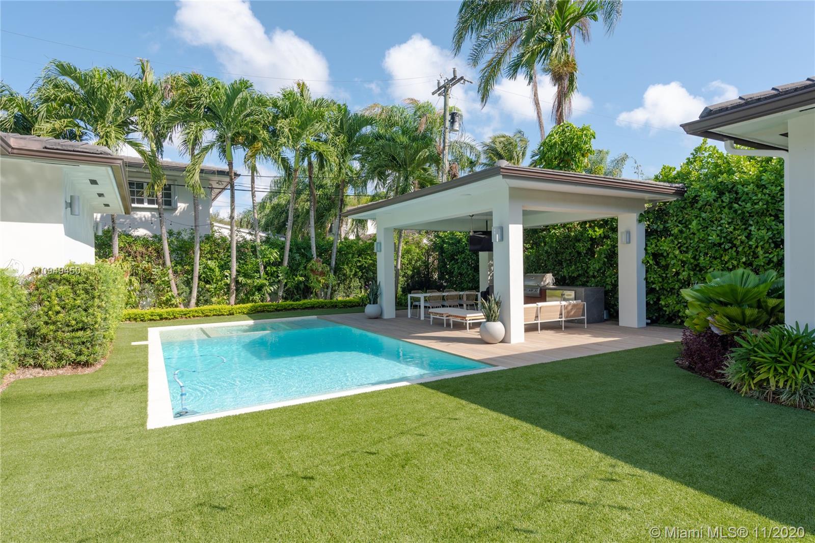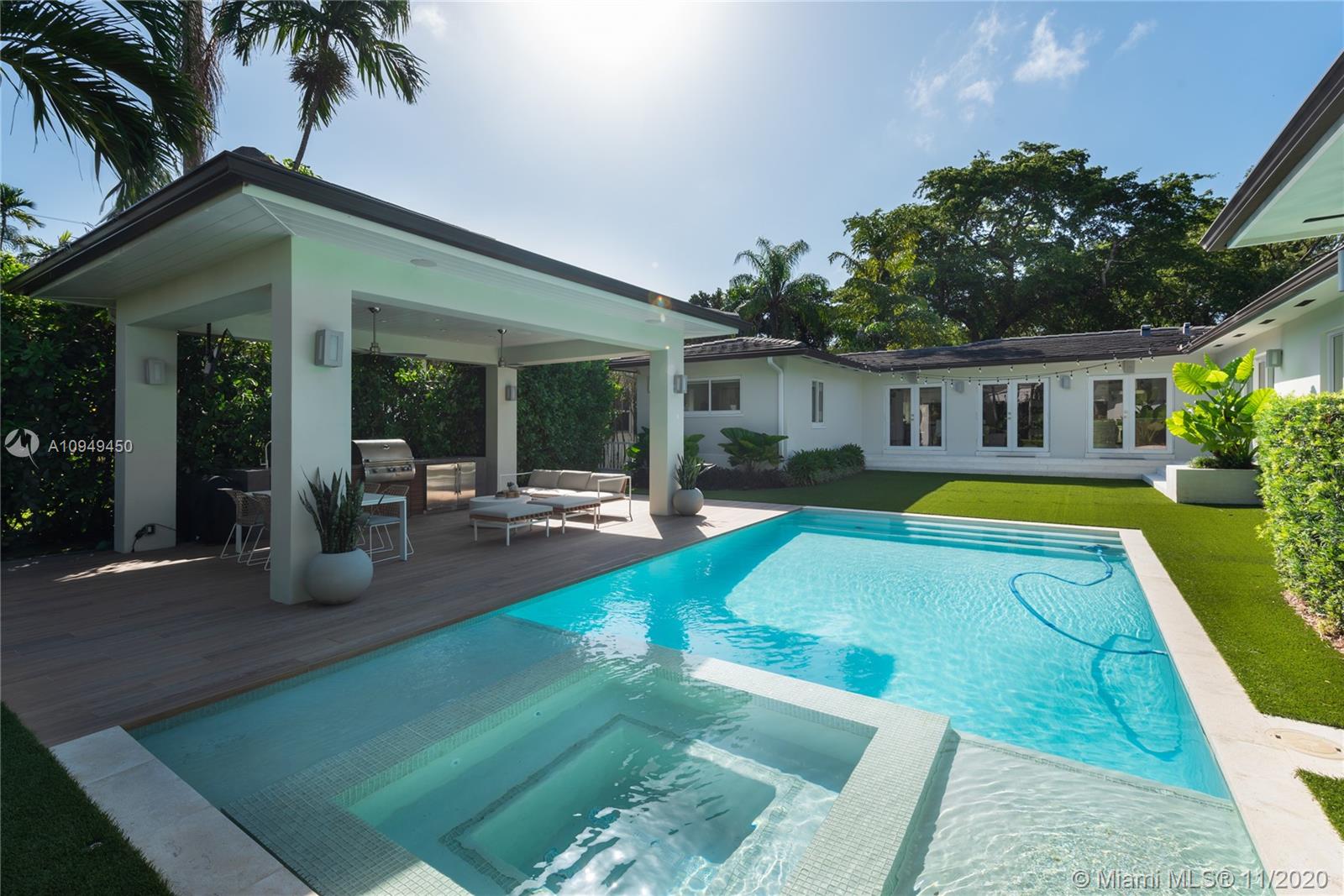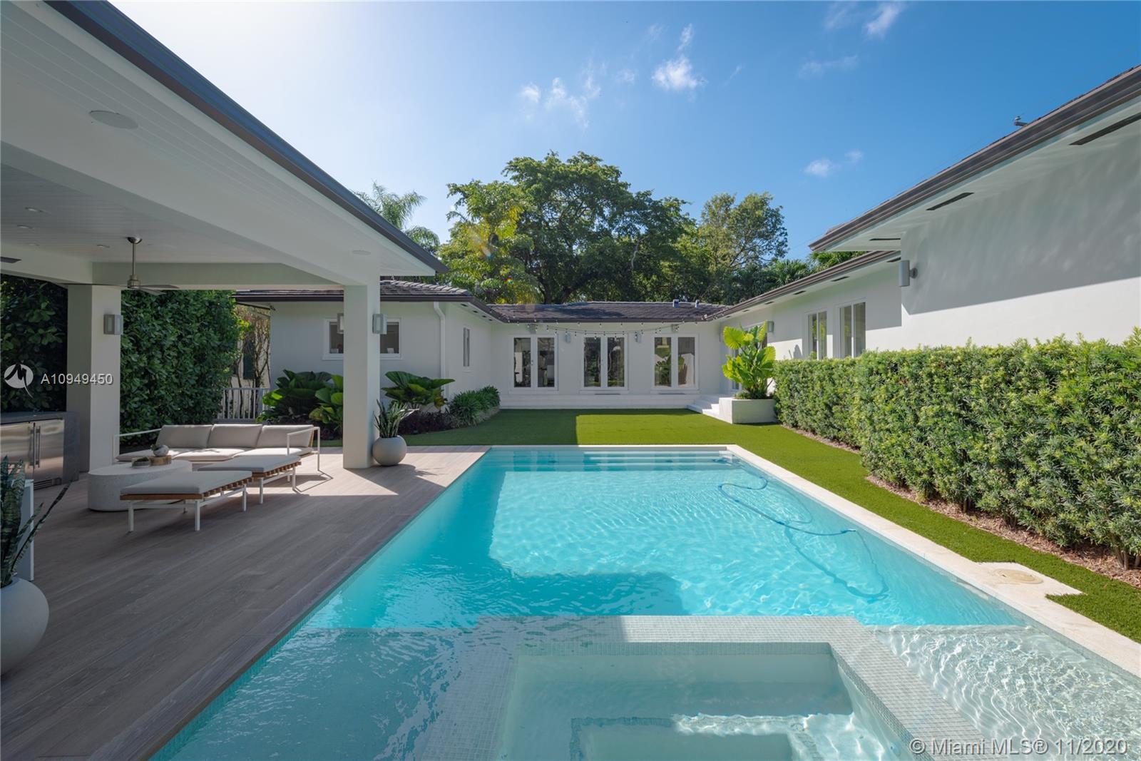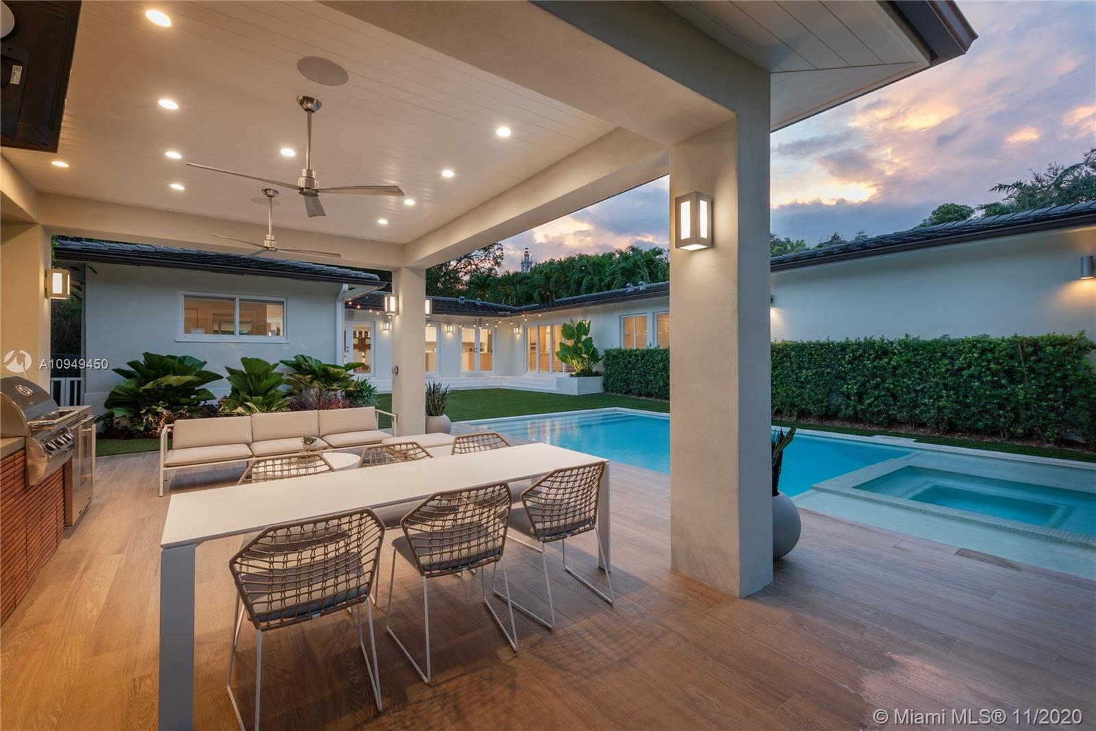 Beautiful home in Coral Gables, completely remodeled to the studs with an amazing back yard, perfect for entertaining. Living areas are built around the pool and the rooms are filled with natural light. A covered patio was recently added to enjoy al fresco living/dining with a fully integrated barbecue outdoor kitchen! Oversize pool with a new built-in spa/jacuzzi for your enjoyment. Inside you are greeted by a beautiful living/dining area with brand new Lube kitchen overlooking the spectacular pool area. Four-bedroom split plan layout: master on one side, guest suite at the back of the house and two bedrooms on the other side for total privacy. Two blocks from the Biltmore and some of the best tennis in Miami and minutes from the shops at Miracle Mile. 15 minutes from Miami airport.