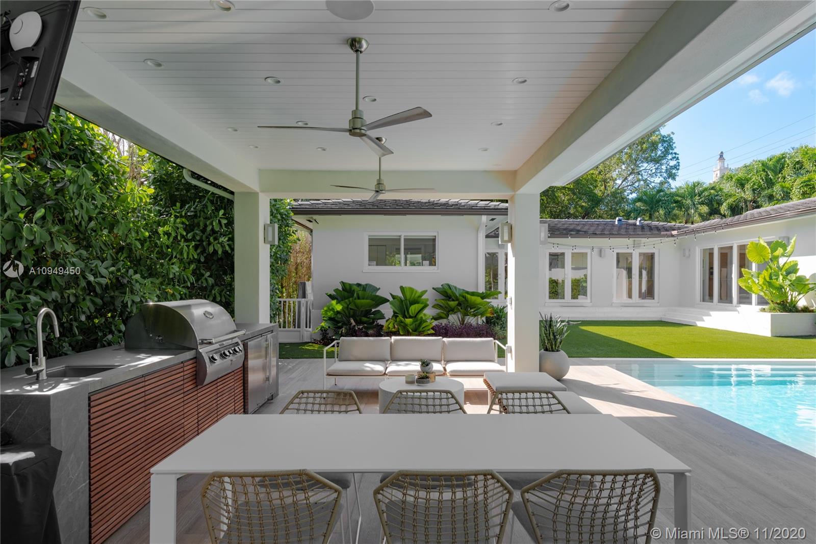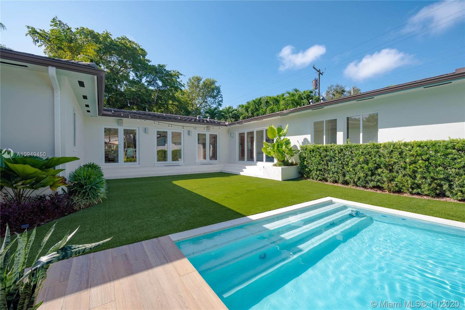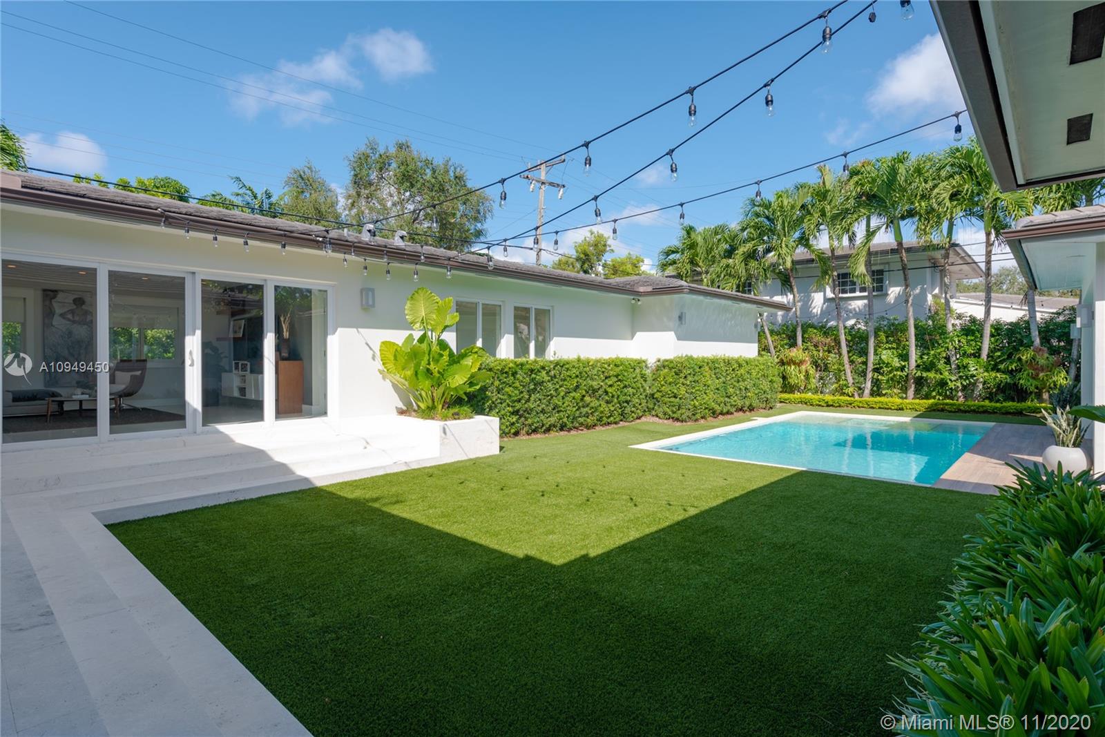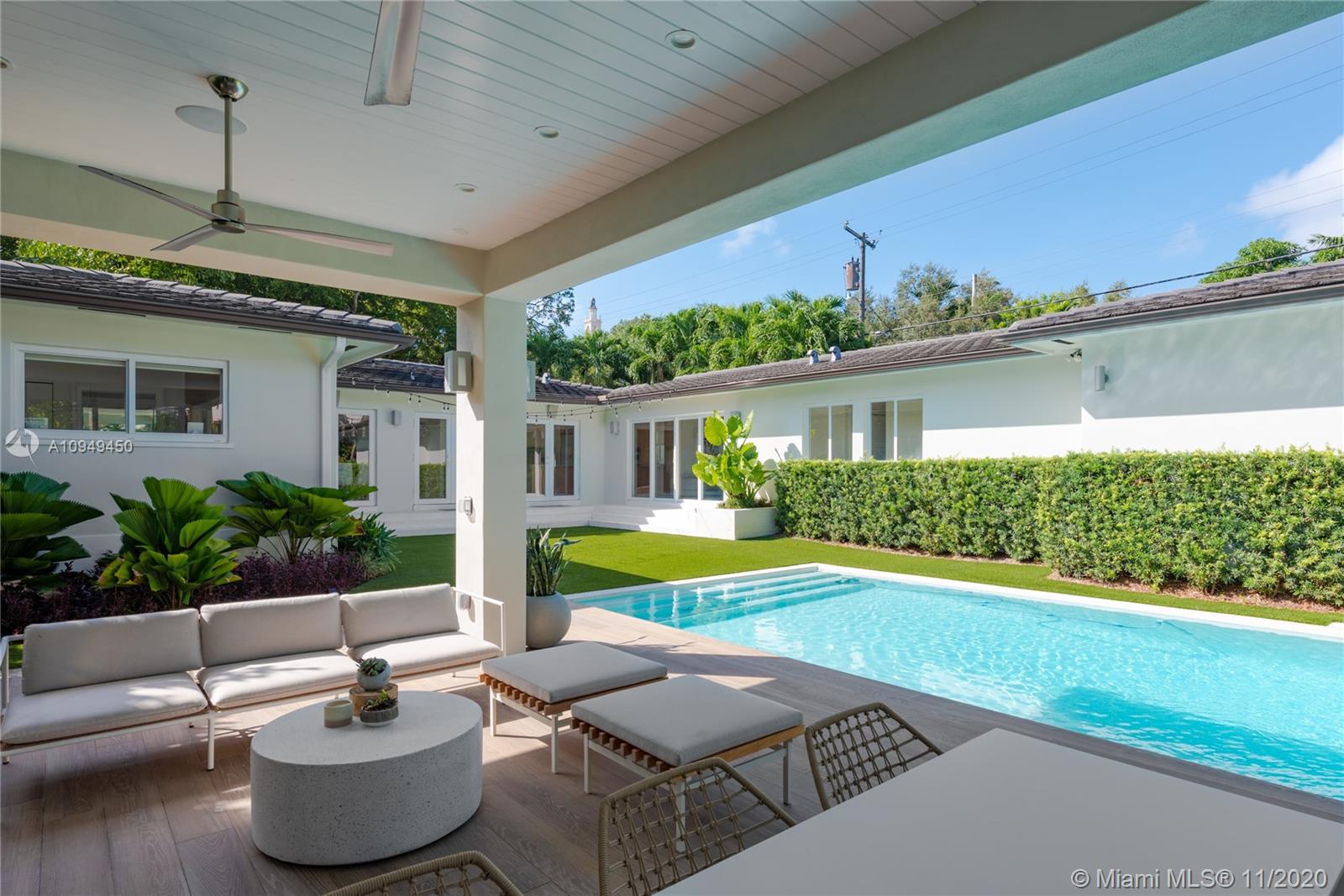 Beautiful home in Coral Gables, completely remodeled to the studs with an amazing back yard, perfect for entertaining. Living areas are built around the pool and the rooms are filled with natural light. A covered patio was recently added to enjoy al fresco living/dining with a fully integrated barbecue outdoor kitchen! Oversize pool with a new built-in spa/jacuzzi for your enjoyment. Inside you are greeted by a beautiful living/dining area with brand new Lube kitchen overlooking the spectacular pool area. Four-bedroom split plan layout: master on one side, guest suite at the back of the house and two bedrooms on the other side for total privacy. Two blocks from the Biltmore and some of the best tennis in Miami and minutes from the shops at Miracle Mile. 15 minutes from Miami airport.
