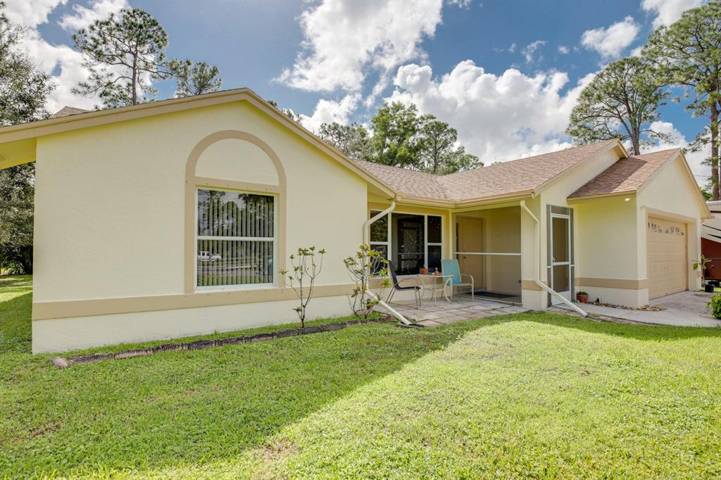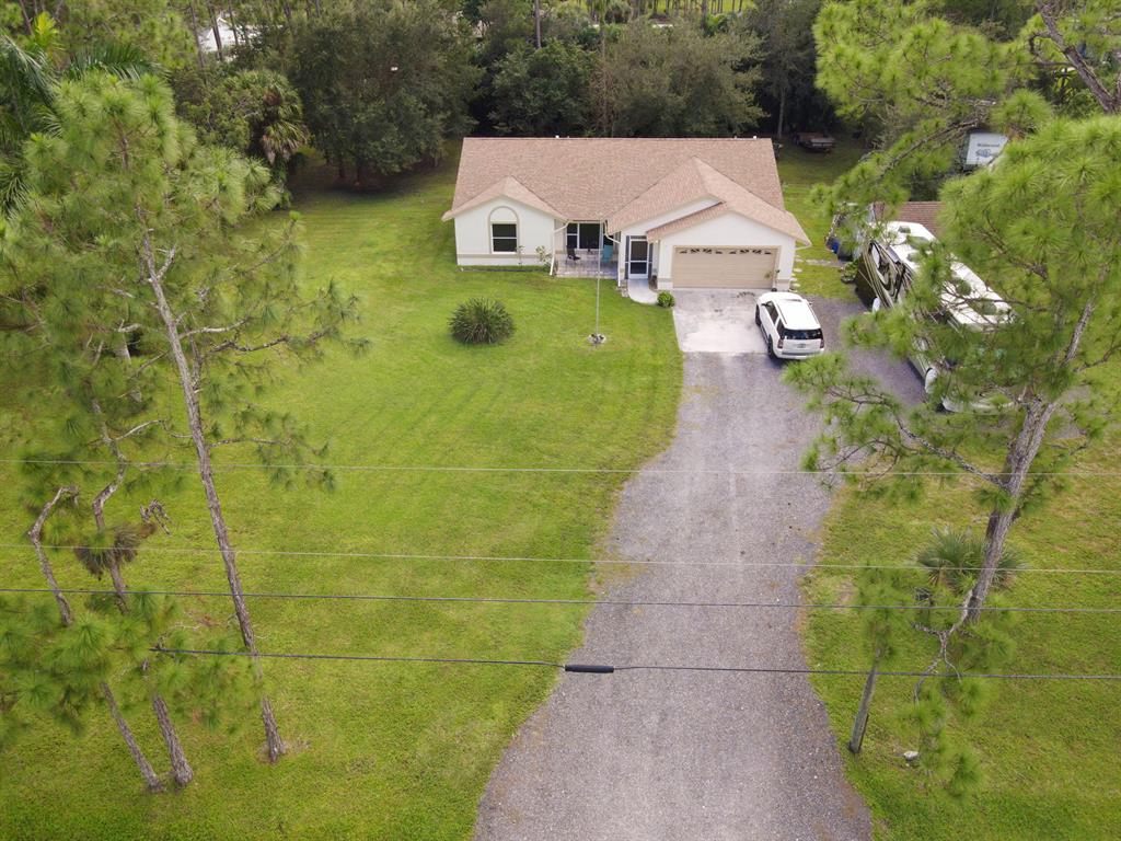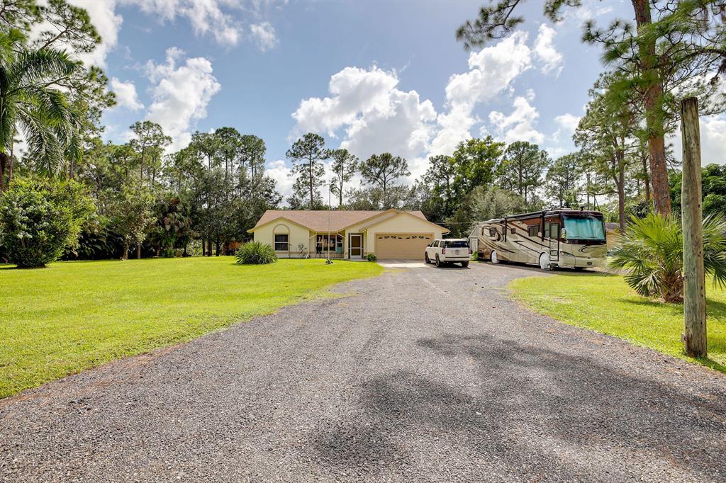 Close to Royal Palm 3 Bedroom, 2 bath, 2 car garage home. Beautiful fully sodded yard on over an acre. Features include two pole barns-one is 30x14 with 16x8 stall behind with water. Second pole barn 20x14 & is great for entertaining. It has concrete floor, electric and water. The kitchen boast new range, dishwasher, & disposal. Front loading washer & dryer are only two years old. Master bedroom & bathroom remodeled and include waterproof vinyl plank floors, crown molding, 5 -1/4'' baseboards, dual sink vanity, oval mirrored medicine cabinets, new tile shower. Additional features include new verticals & sunshades throughout, ceiling fans, high hat lighting, plant shelves & more. There is a termite bond on the home until May 2021. AC is 2014. **FREEZER IN GARAGE DOES NOT CONVEY.