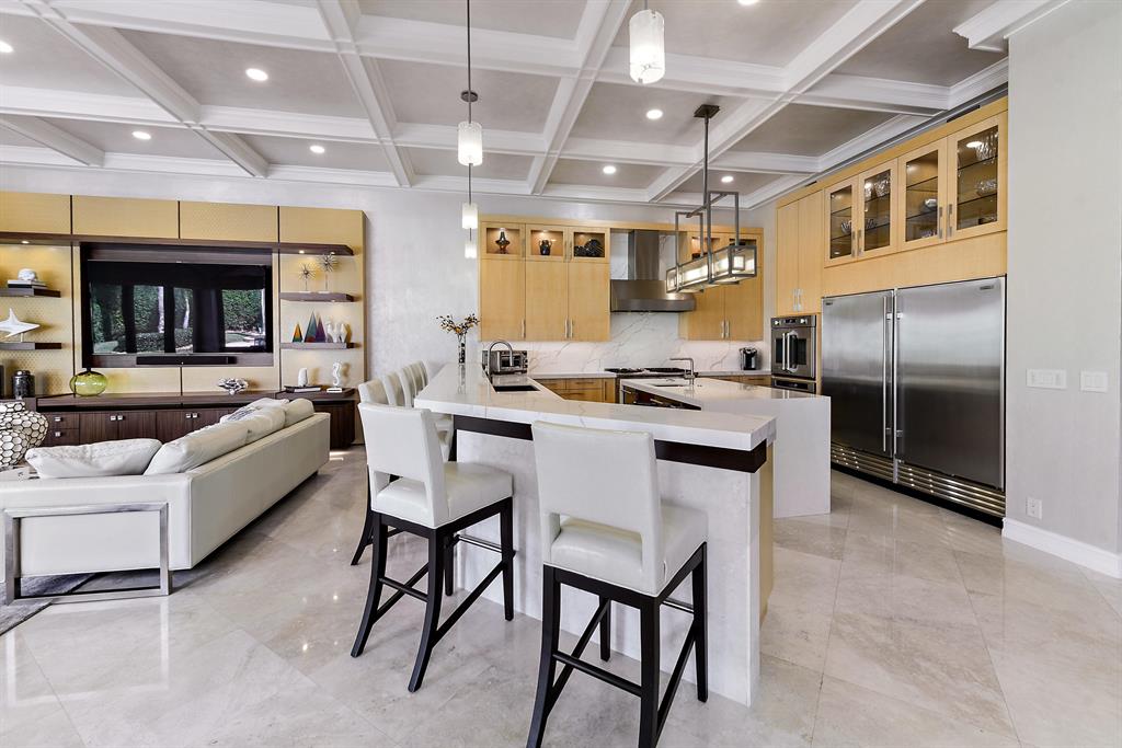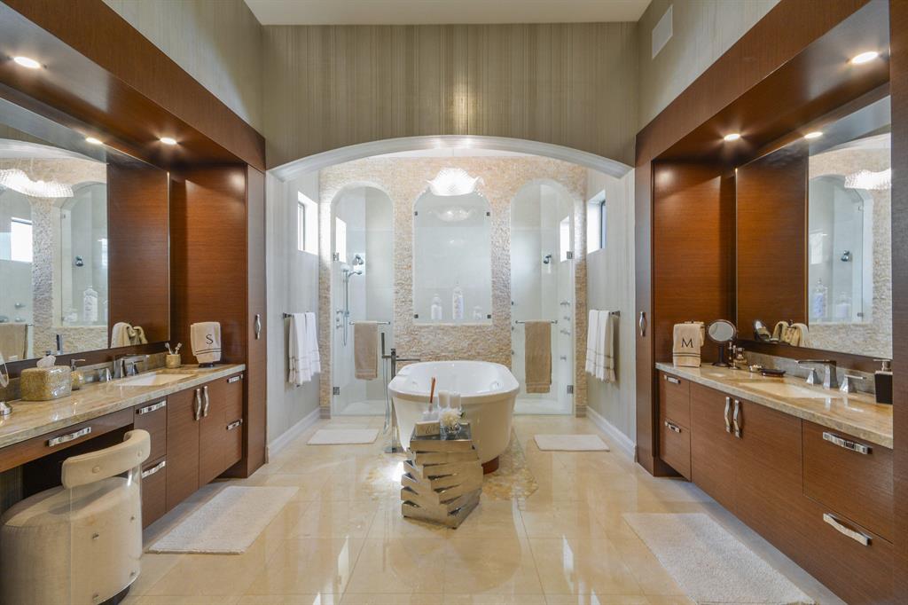 Completely renovated 5 bedroom, 6.1 bath 2 story home with open floor plan, upgrades throughout with incredible quality of decorator finish work and magnificent attention to detail. The first floor features a formal living room with large bar, formal dining room, gourmet kitchen with stainless steel appliances, breakfast bar, and wine room and a large family room are designed for effortless entertaining or casual living. Also on the first floor are a two tier library and a large master suite with sitting area and his and her walk-in closets and an en suite guest bedroom. 3 additional en suite bedrooms including a large private VIP suite with balcony plus gym complete the upstairs. New lushly landscaped lot with lake and golf course views features a dramatic resort style pool and spa,