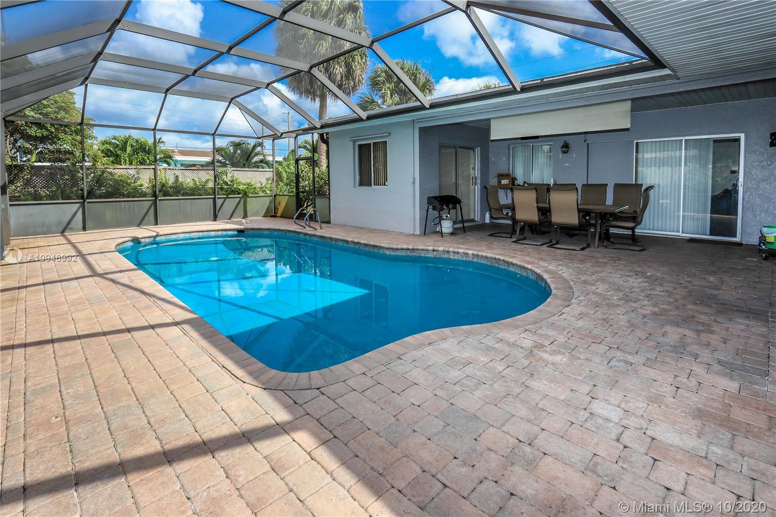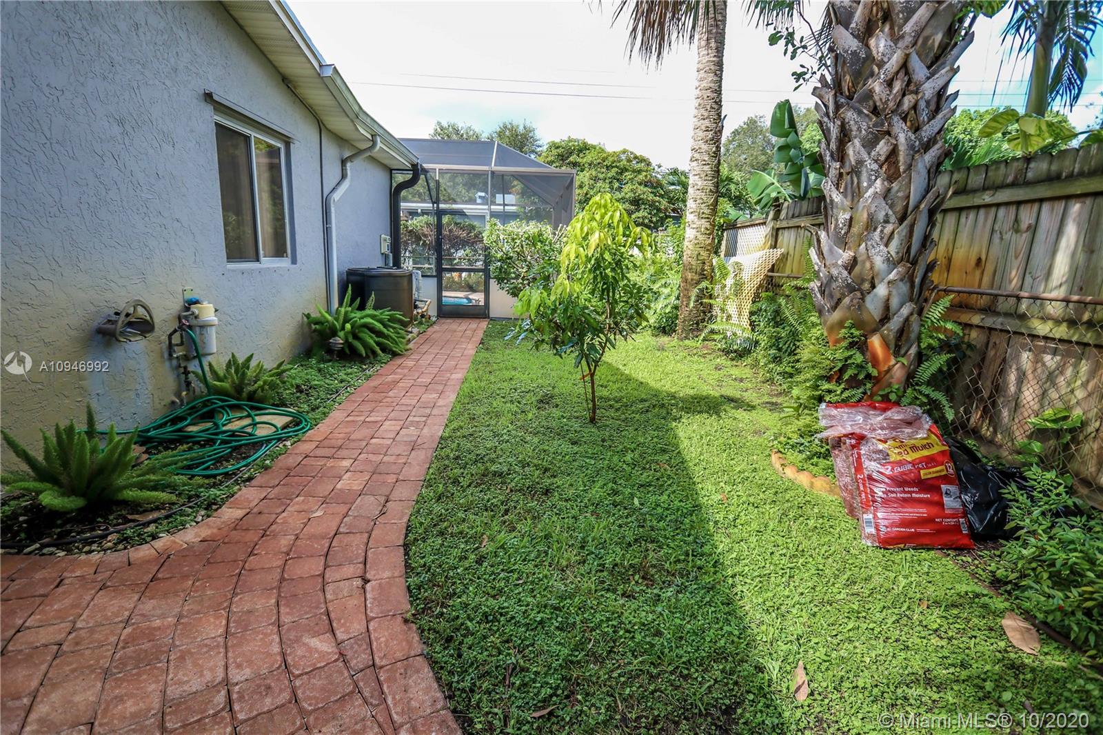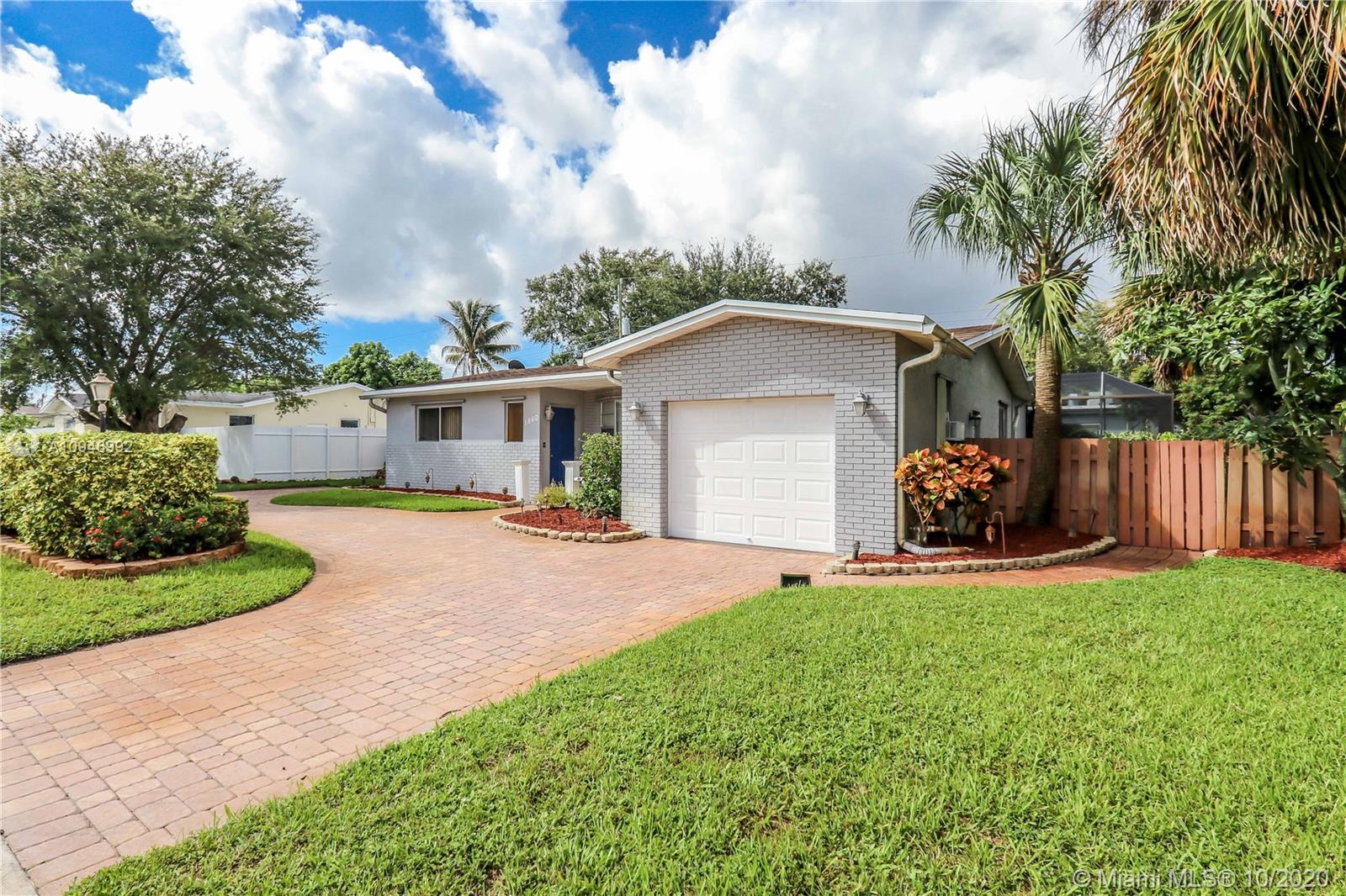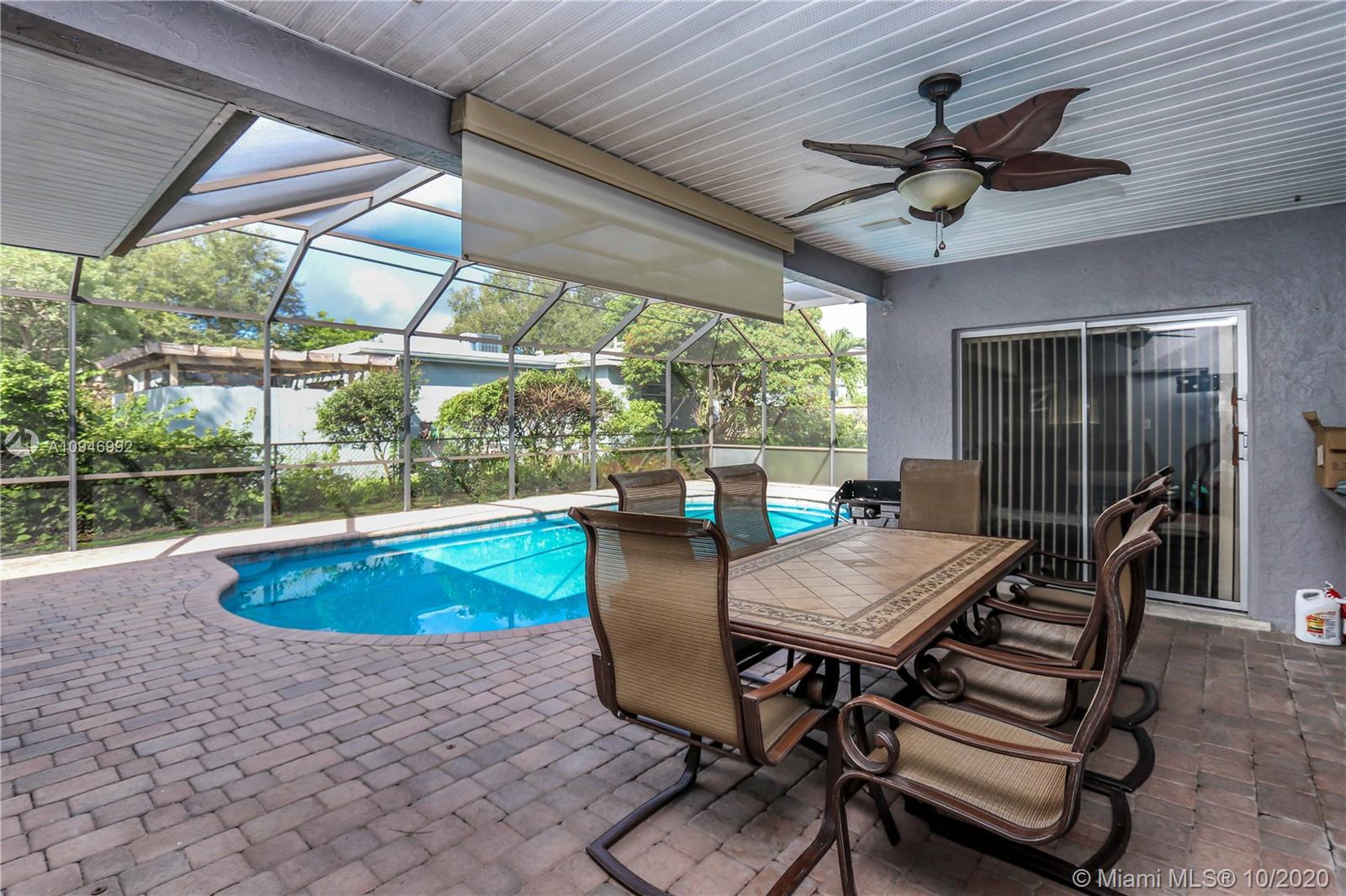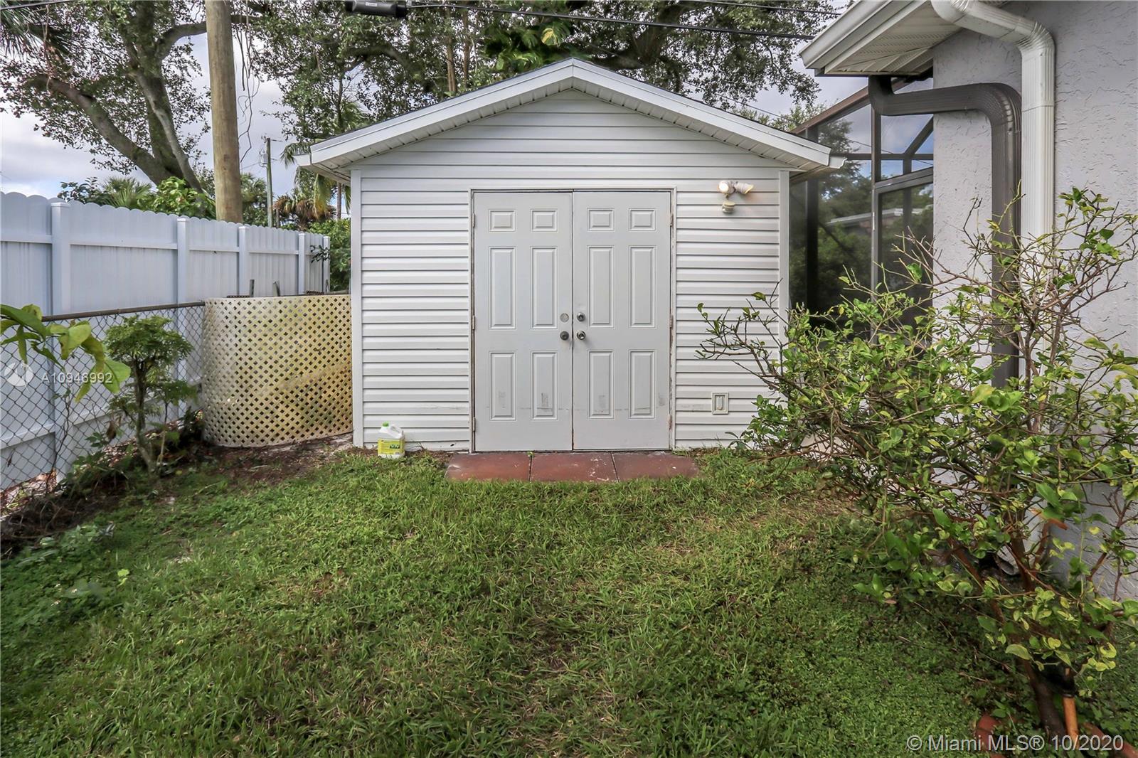 Beautiful 3 BR, 2 BA, 1 car garage, salt water Pool. Home features spacious kitchen w/granite countertops, SS appliances/pass thru window to pool. Large formal dining room & spacious living room w/bay window & sliding glass doors access to pool & patio. Large Master BR has walk in closet, sliding glass door to pool/cabana bathroom access to pool. Large Screened in Heated salt water pool / patio area perfect for entertaining. Updated guest bath. Laundry room has plenty of storage, utility sink & newer washer & new dryer. Circular Brick paver driveway & front porch. Tankless water heater. Hurricane panels. Mango, lemon & banana tree. Completely fenced in backyard w/large large shed. Auto Garage door opener w/ window a/c. Tenant Occupied need notice for showings they will be moving upon sale