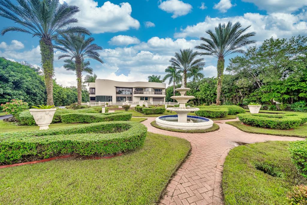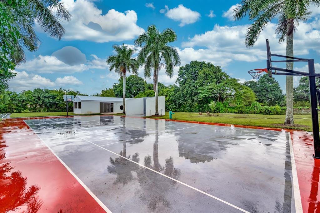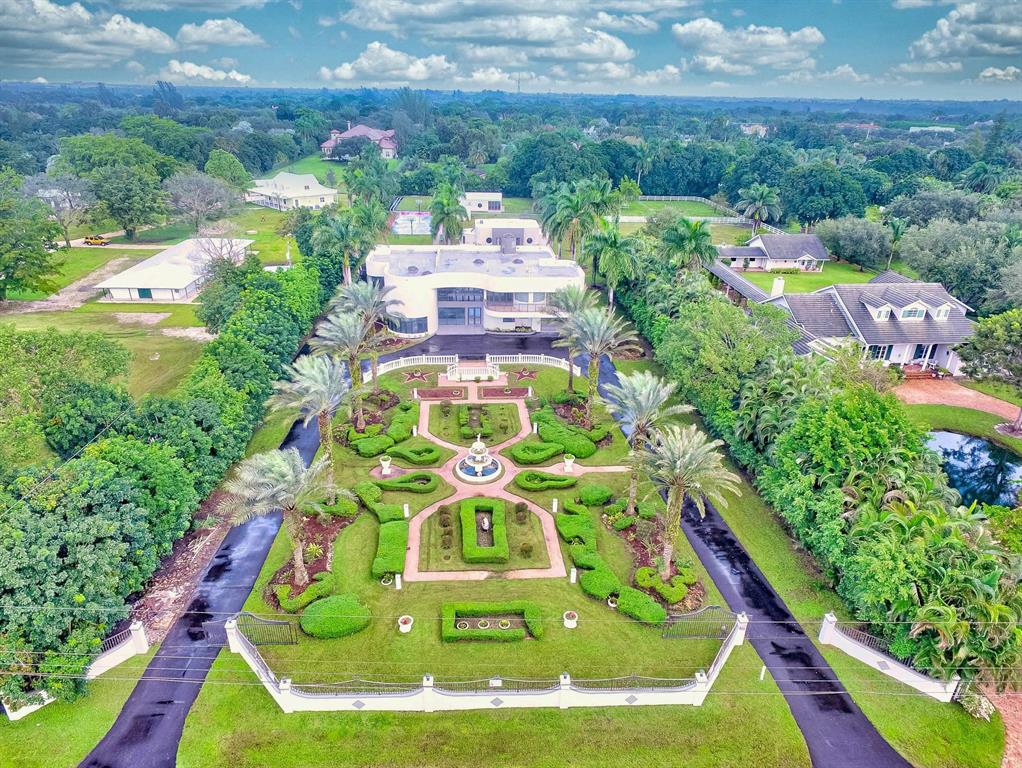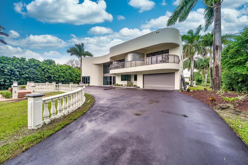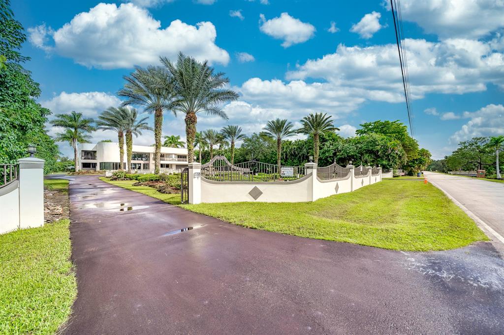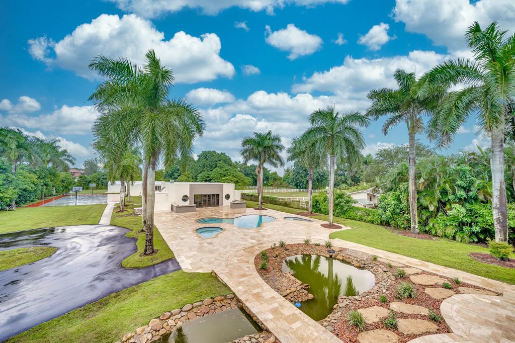 Contemporary masterpiece with 5 bed, 5.5 baths perfectly placed in the heart of Sunshine Ranches, a privately gated estate with circular driveway which sits on 2.34 acres and features the main home with over 7400 sq/ft, guest home with 1569 sq/ft and a private gym with 1306 sq/ft overlooking the pool and waterfall, tennis court and basketball court, racquet ball, running track and so much more. It is beautifully appointed with quality custom woodwork, ultra-high ceilings, porcelain floors, modern kitchen, family room, home theater, impact glass, 2 car garage and most impressive tropical landscaping