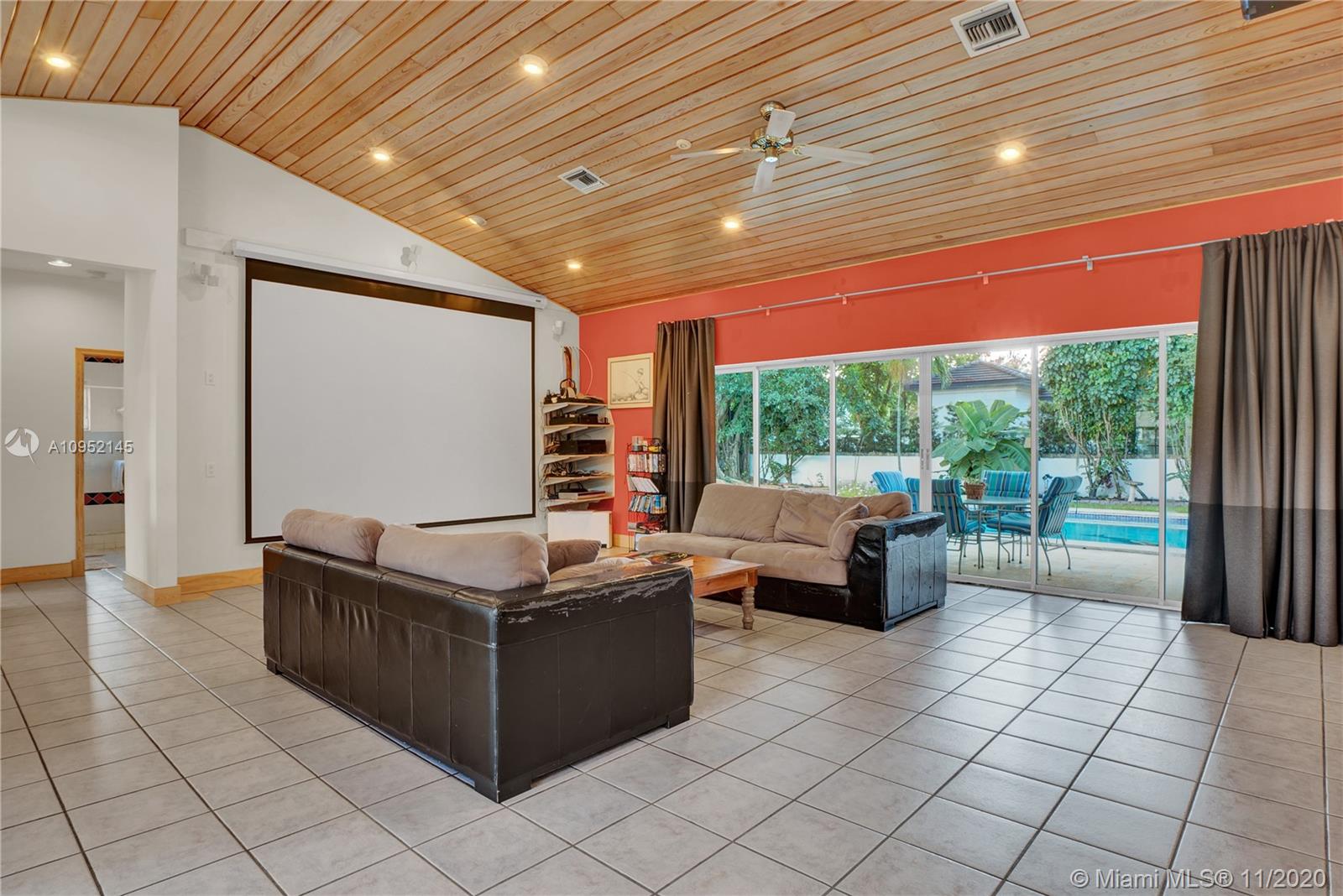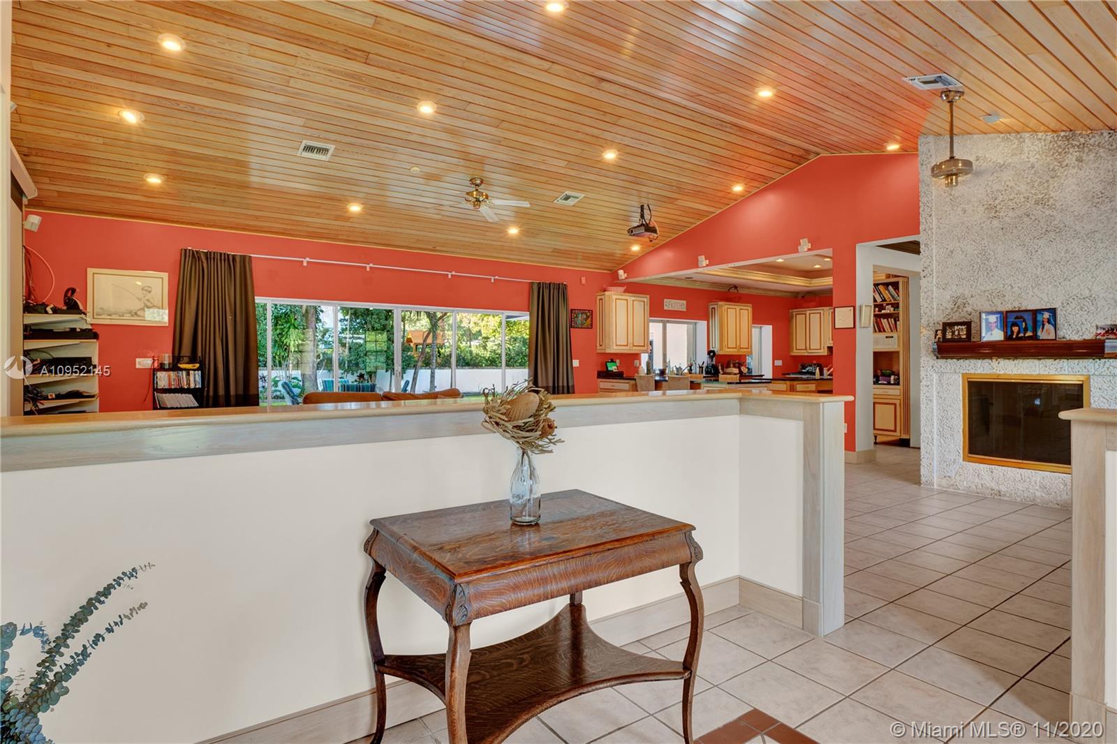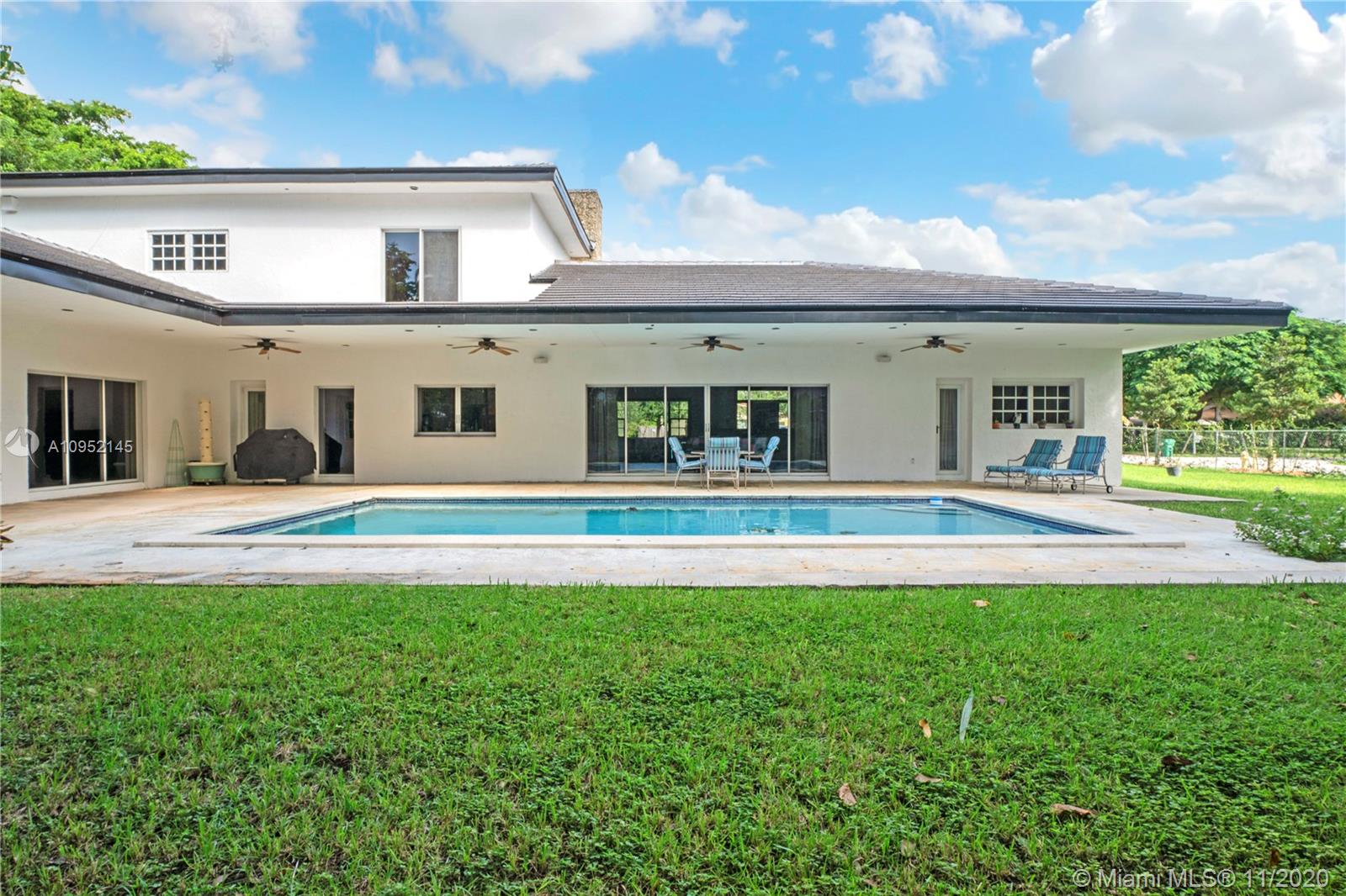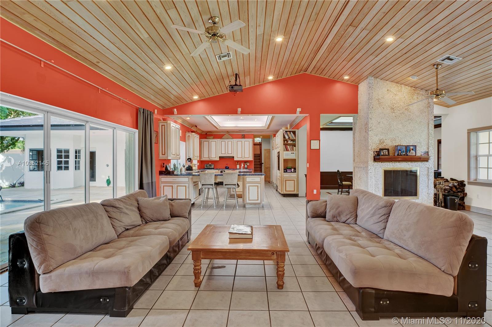 Lowest priced 6 bedroom/6 bath pool home in North Pinecrest. A few small tweaks and updates will turn this sleeping beauty into your new dream home. Features: new flat concrete tile roof, large open spaces including great room, kitchen w/wood cabinets and Island, three -way bedroom split perfect for multi generation family. Master plus two downstairs, three additional oversized bedrooms plus bonus upstairs. Also, Miami Oolite limestone used for exterior walls and chimney, Cypress wood ceilings, double sided wood burning fireplace, formal dining, large corner lot, views to open pool from every part of the house, oversized terrace perfect for outdoor entertaining, 2.5 car garage, indoor laundry and more. Home was totally rebuilt in 1993 with pride by owner/architect.