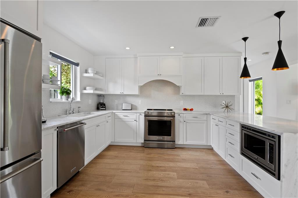 Stunning, completely rebuilt Imperial Point pool home! Open concept floor plan with wood flooring throughout. Primary suite w/ sliding doors to patio on one side and two guest bedrooms on other side of home. Bright, spacious kitchen with white cabinetry, stainless steel appliances, quartzite countertops w/ waterfall edge and bar seating. The home was completely rebuilt in 2018 including new plumbing, electrical, HVAC system, roof, impact windows, pool, etc. Enjoy the patio and pool with sunshelf in the lushly landscaped, private backyard. Additional features include an energy efficient tankless water heater, Nest thermostat, Ring doorbell and hookup in garage for an electric car charger. Meticulous and move-in ready!