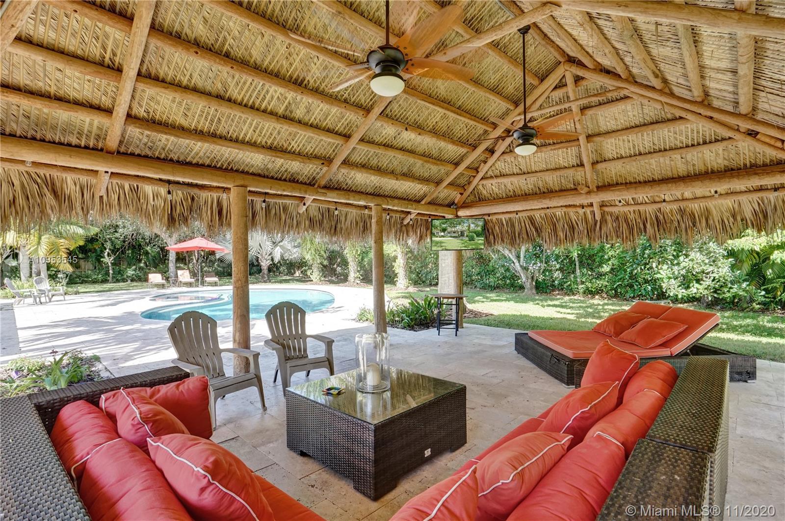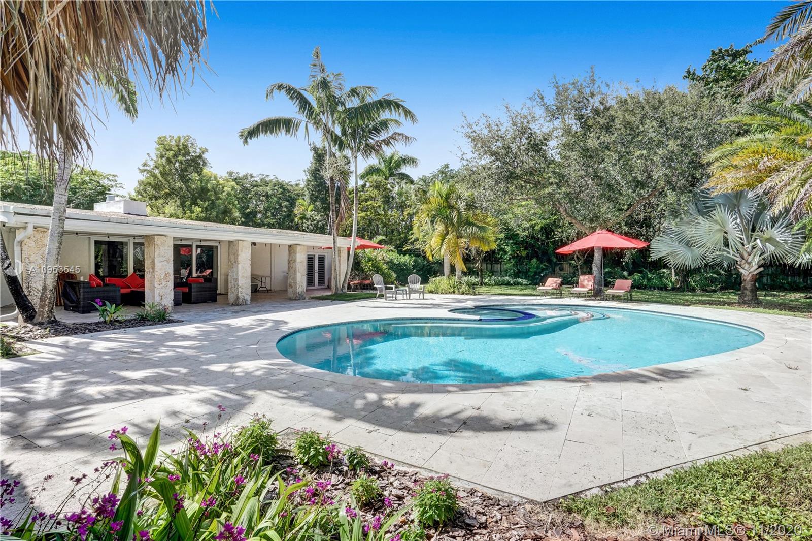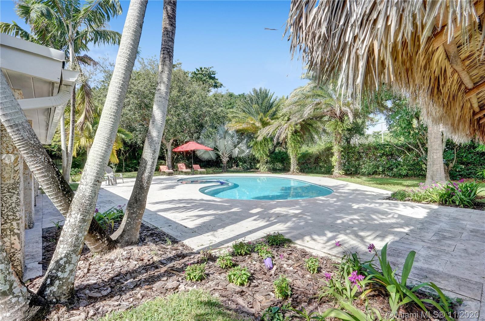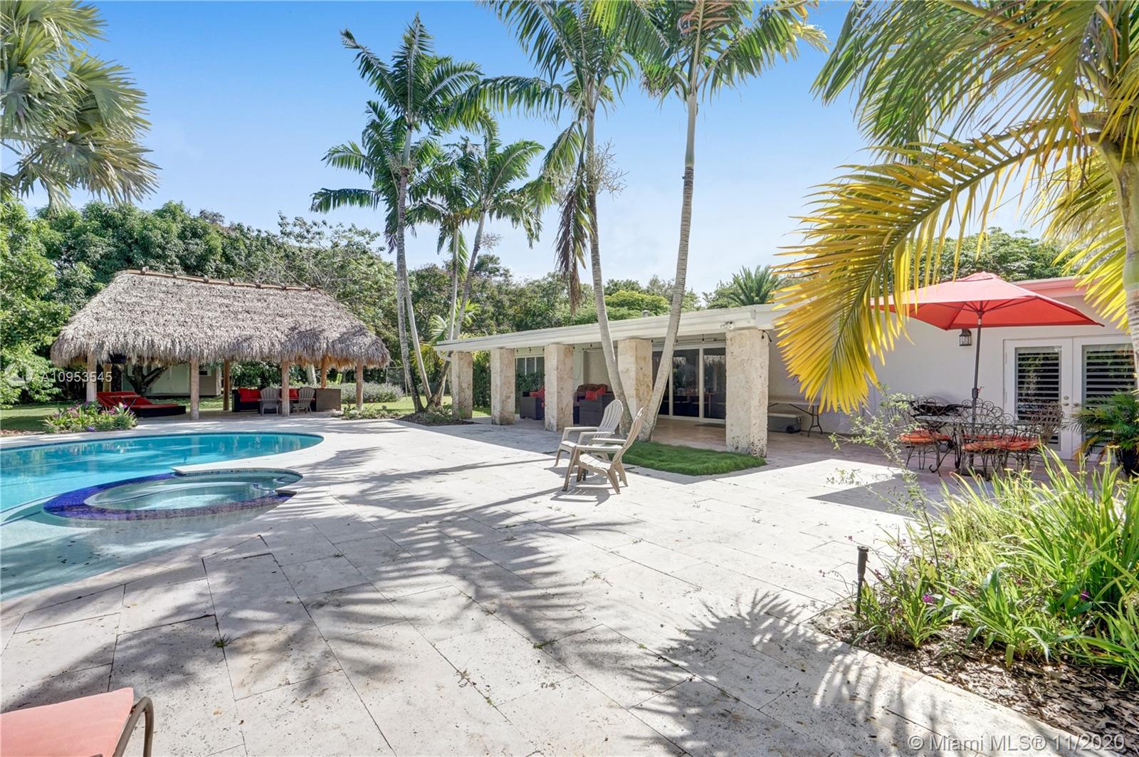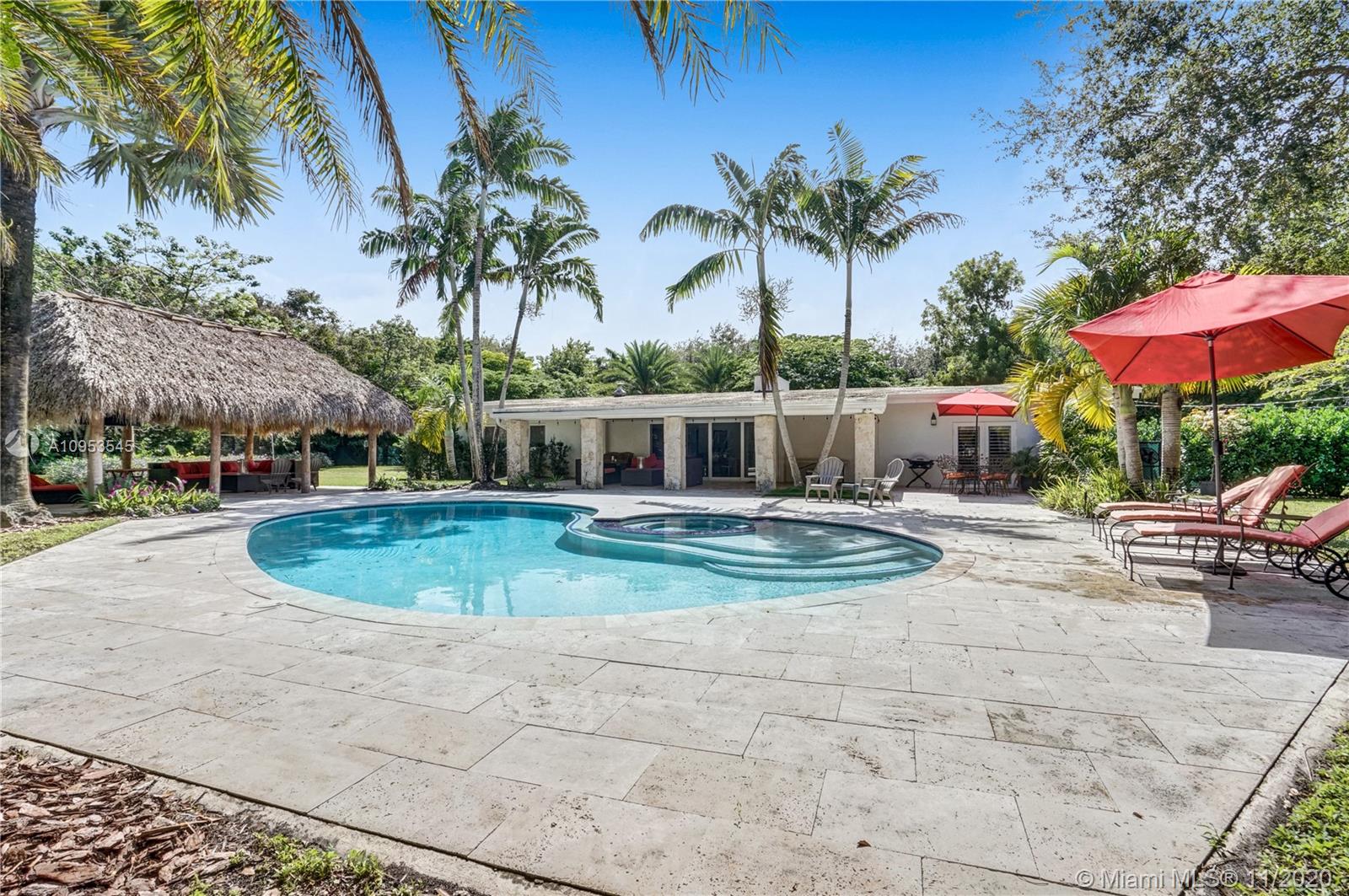 Resort living in Pinecrest! Tranquil courtyard framed by keystone columns invites you into this lovely 4 bed 3 bath home. Sitting on a lush builder's acre of fruit trees and flowering palms, this charmer has it all. Light and bright and tastefully updated, the 2,869sf home has wood-beamed cathedral ceilings, stunning keystone fireplace, Saturnia marble floors, updated contemporary kitchen and plenty of space for entertaining. Sliding doors open to outdoor living space and spectacular resort style backyard with free form pool, 500sf Tiki Hut, and loads of yard. The split plan provides three bedrooms and two baths on one side, and the 4th bed/office, bath, laundry and large family/game room on the other. Gorgeous landscape lighting and invisible fence for dogs are bonus amenities.