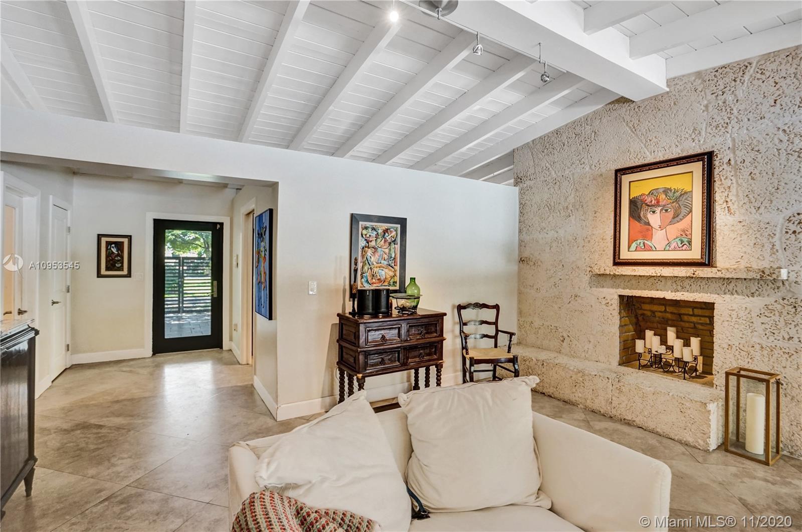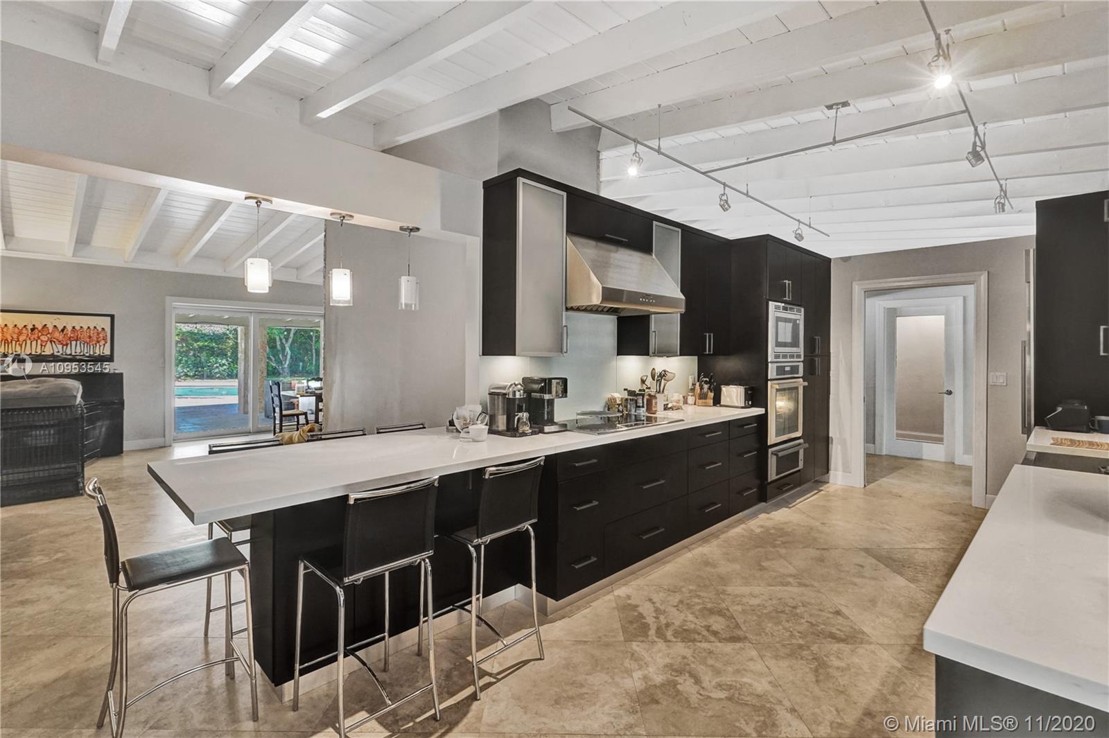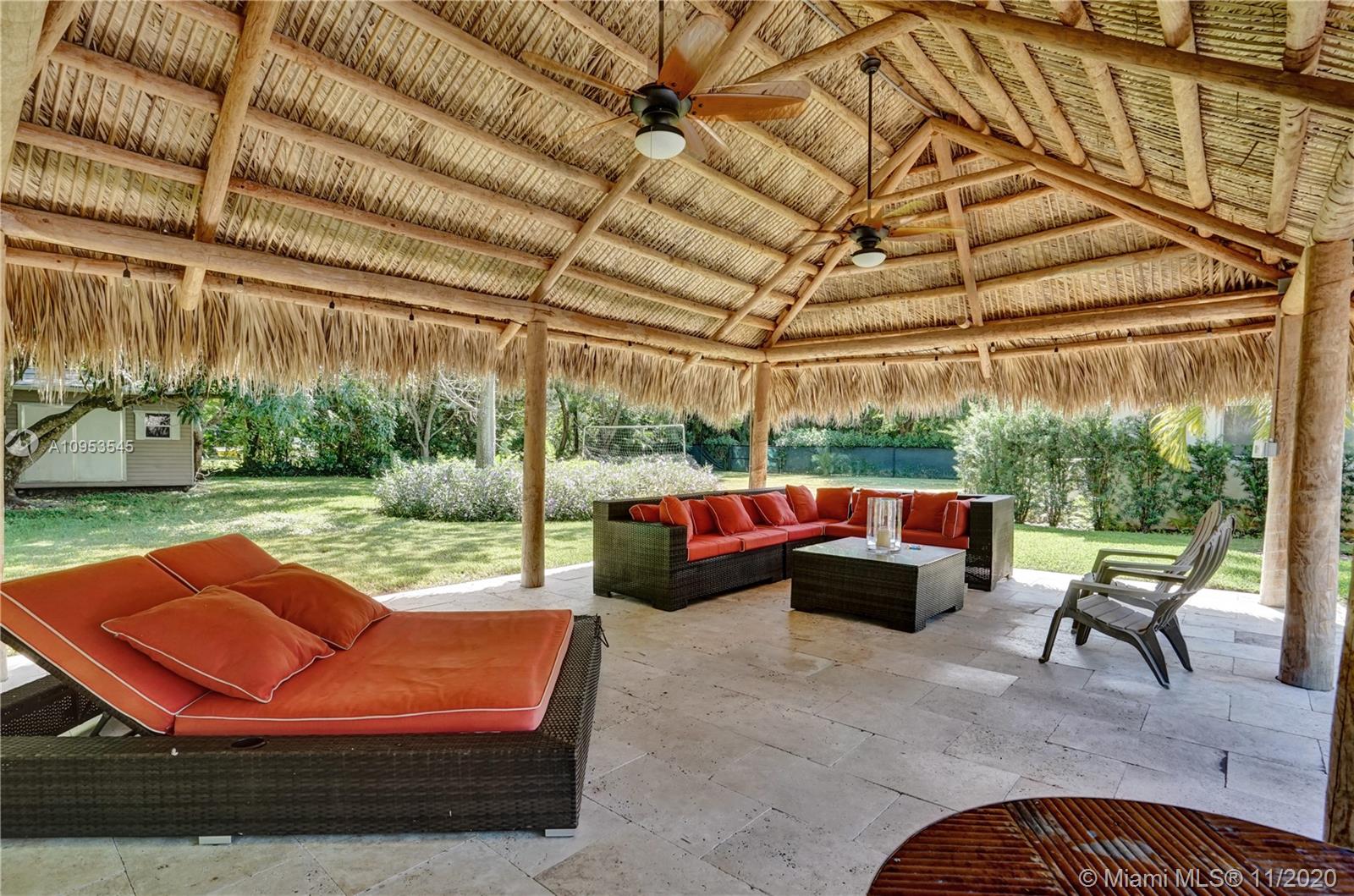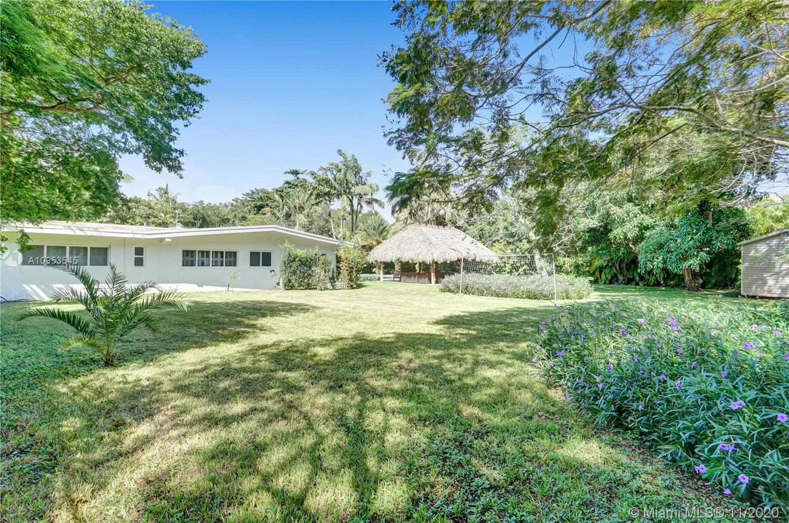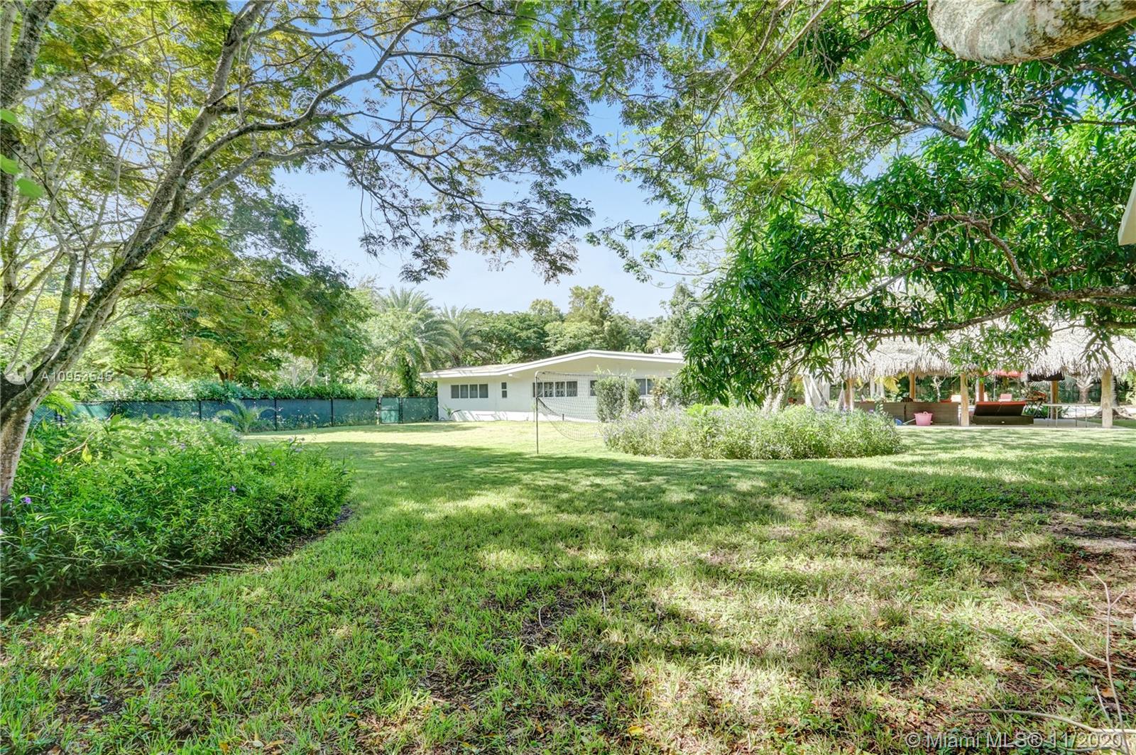 Resort living in Pinecrest! Tranquil courtyard framed by keystone columns invites you into this lovely 4 bed 3 bath home. Sitting on a lush builder's acre of fruit trees and flowering palms, this charmer has it all. Light and bright and tastefully updated, the 2,869sf home has wood-beamed cathedral ceilings, stunning keystone fireplace, Saturnia marble floors, updated contemporary kitchen and plenty of space for entertaining. Sliding doors open to outdoor living space and spectacular resort style backyard with free form pool, 500sf Tiki Hut, and loads of yard. The split plan provides three bedrooms and two baths on one side, and the 4th bed/office, bath, laundry and large family/game room on the other. Gorgeous landscape lighting and invisible fence for dogs are bonus amenities.