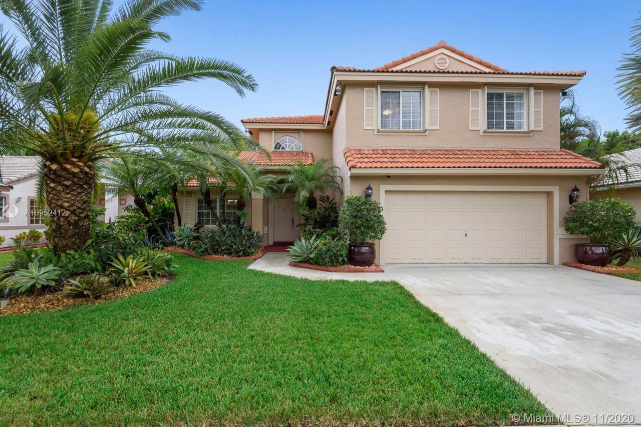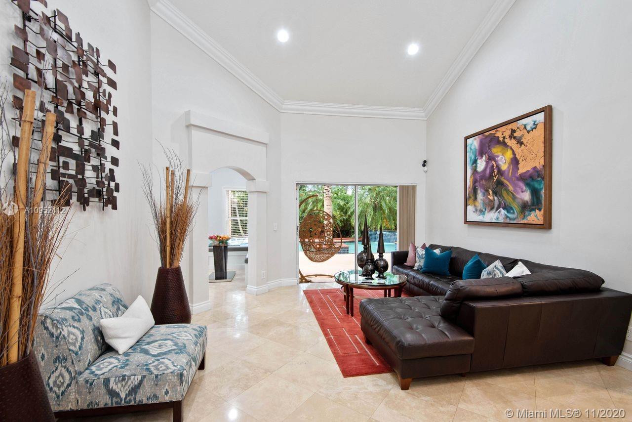 SUPER DEAL! Elegantly updated 4 bedroom, 2 ½ Bathroom pool home with a delightful backyard oasis. Open, bright and meticulously maintained. Crown moldings and recessed lighting throughout. This beautiful home also boasts spacious living areas with travertine tile on the diagonal, rich wood floors in the bedrooms, stunning volume ceilings, Roman tub, granite counters, 42” wood cabinets, quality SS appliances, covered patio, accordion hurricane shutters, exterior garden lighting, etc. Private fenced yard with exotic lush landscaping and a solar heated pool with inviting waterfall feature and new pool pump. Nest security system included. Perfect place to entertain inside and out! Desirable guard-gated community. Centrally located. Perfect place to call home!