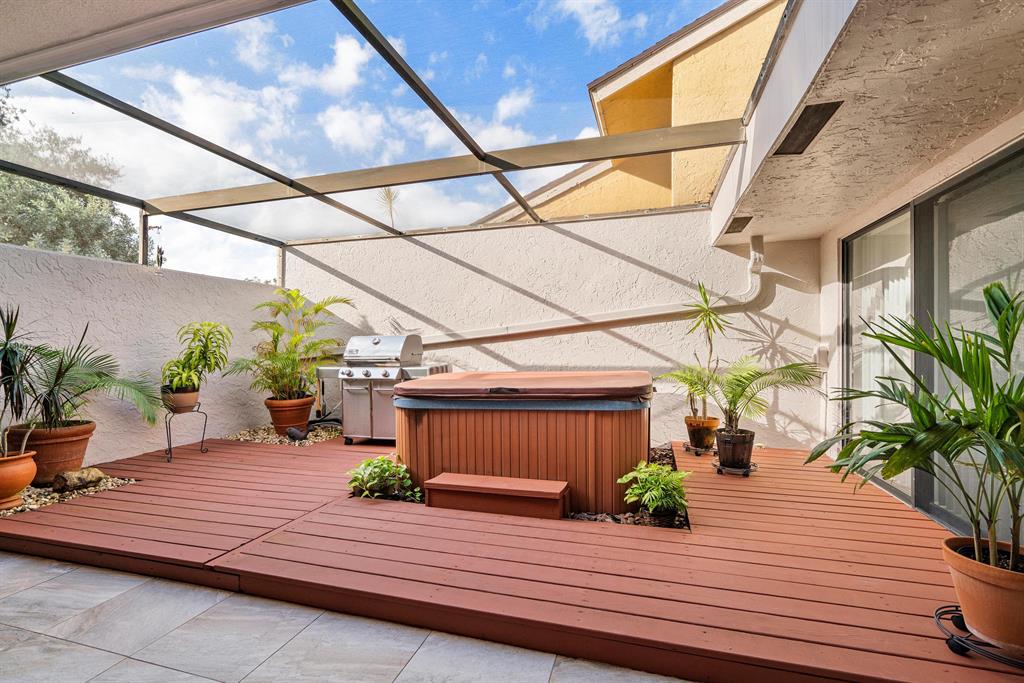 West Boca Raton Townhome in all-age 'Timberwalk' of Logger's Run. Featuring beautiful waterproof vinyl plank flooring, High cathedral ceilings, recessed lighting, 3 sky lights, a surround sound system, 2 Spacious Bedrooms, bright and updated Kitchen cabinets, countertops and Appliances, 2 sparkling clean and sleek bathrooms, Wet bar area, and phenomenal Bonus outdoor living space; which is totally screened in. The front patio area also includes the Hot tub, BBQ Grill, Outdoor Dining set and Flat Screen TV with Sound-bar, plus ceiling fans & sunshade. Great local schools, parks, shopping and restaurants make this home an excellent choice for any financing Buyers, while rates are still so Low. 1 Year Buyer's Protection Warranty Included from Cinch Home Services.