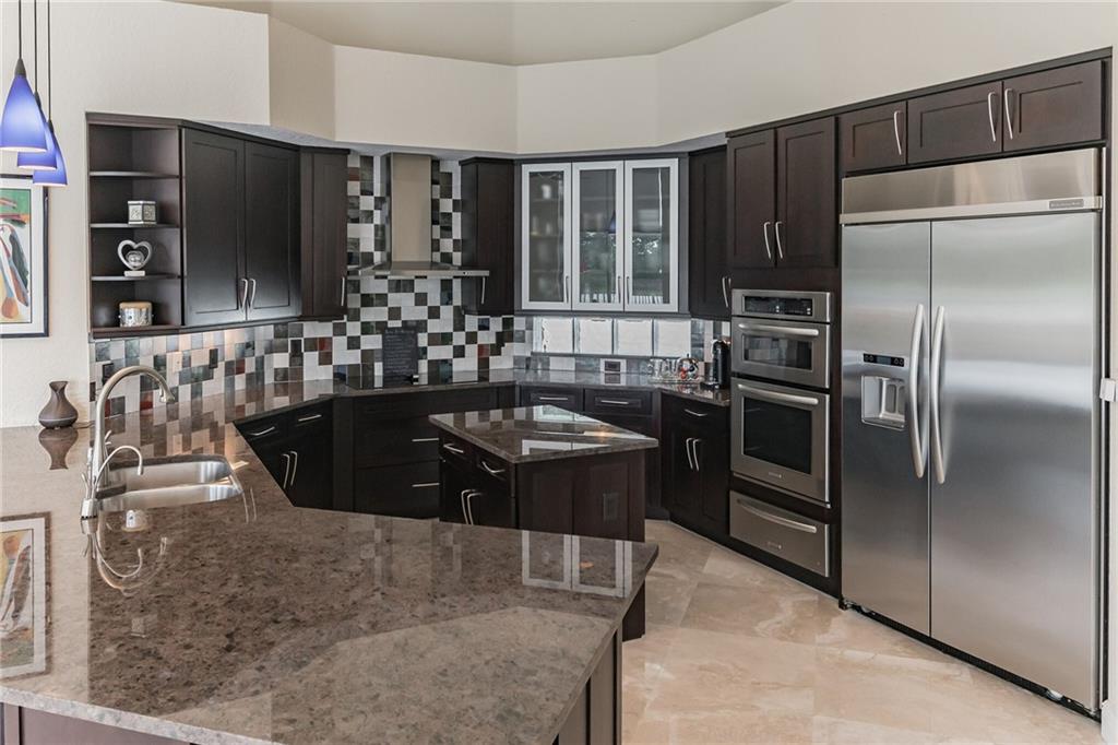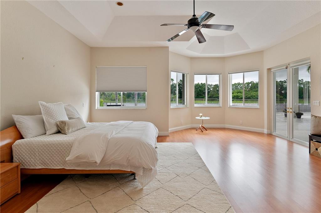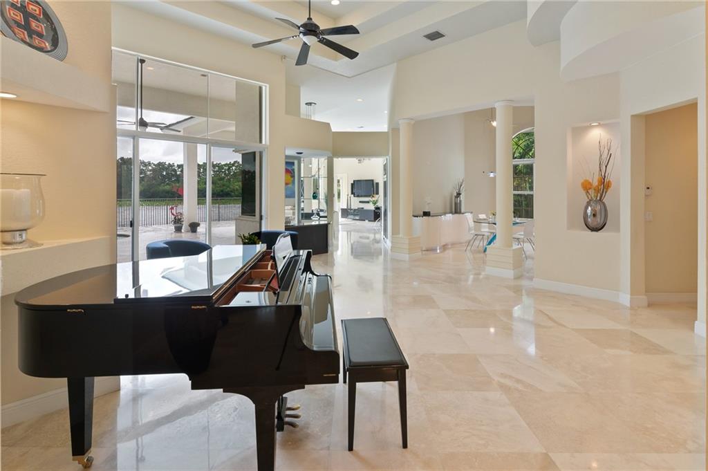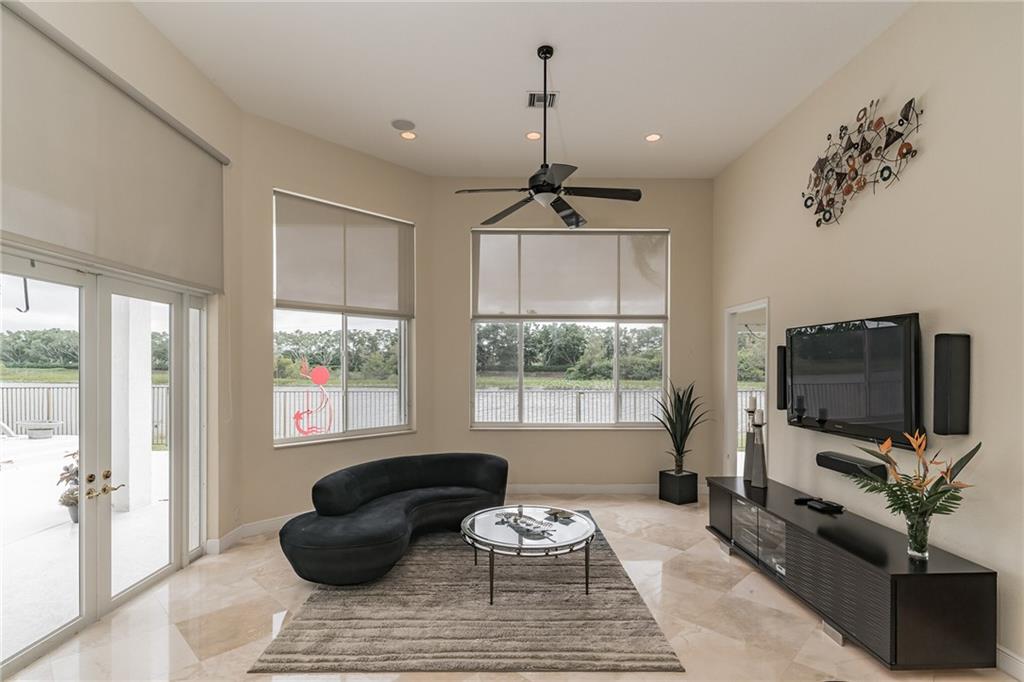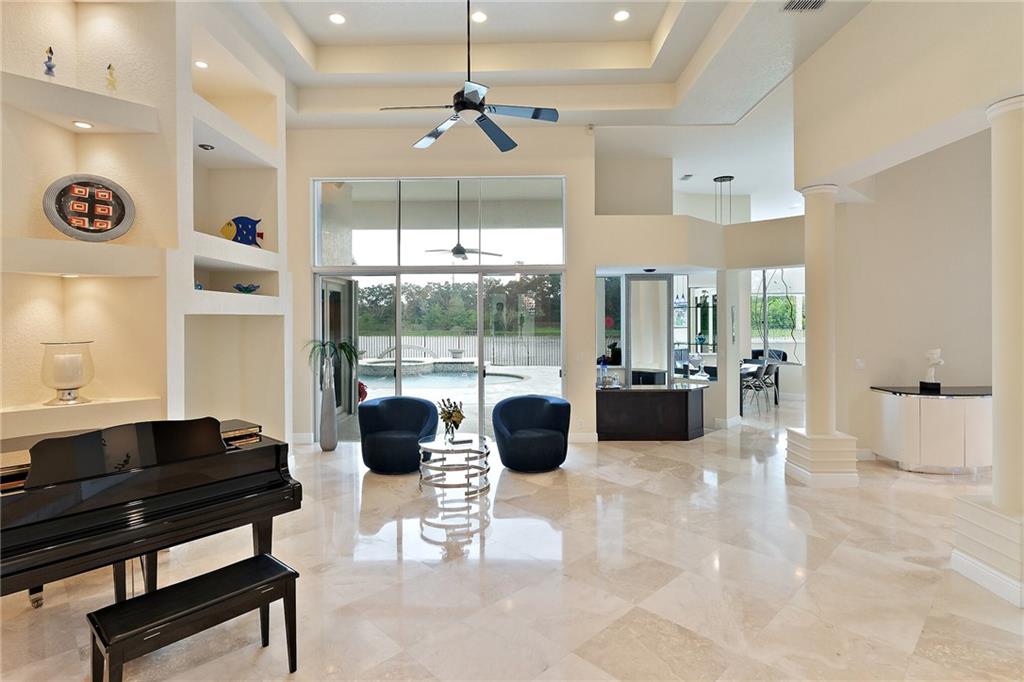 Gorgeous front Porte-cochere welcomes you to this beautifully detailed 5B/6BA single story home with serene pool/patio and expansive lake views. Significant upgrades over the past year include: brand new roof, new floors, travertine marble throughout, new pool with jacuzzi, designer Master Bath with custom steam and two oversized custom closets in Master Bedroom. Master Suite also reveals a private sitting area. Designer Kitchen has real wood cabinetry w/some glass fronts, upgraded SS appliances, dazzling granite counters & breakfast bar plus upgraded lighting. Electric water heater provides big monthly savings, custom In-law bedroom, private courtyard, extended patio and exercise room. Great for entertaining with wine closet & built in bar. A+ schools with private park in development.