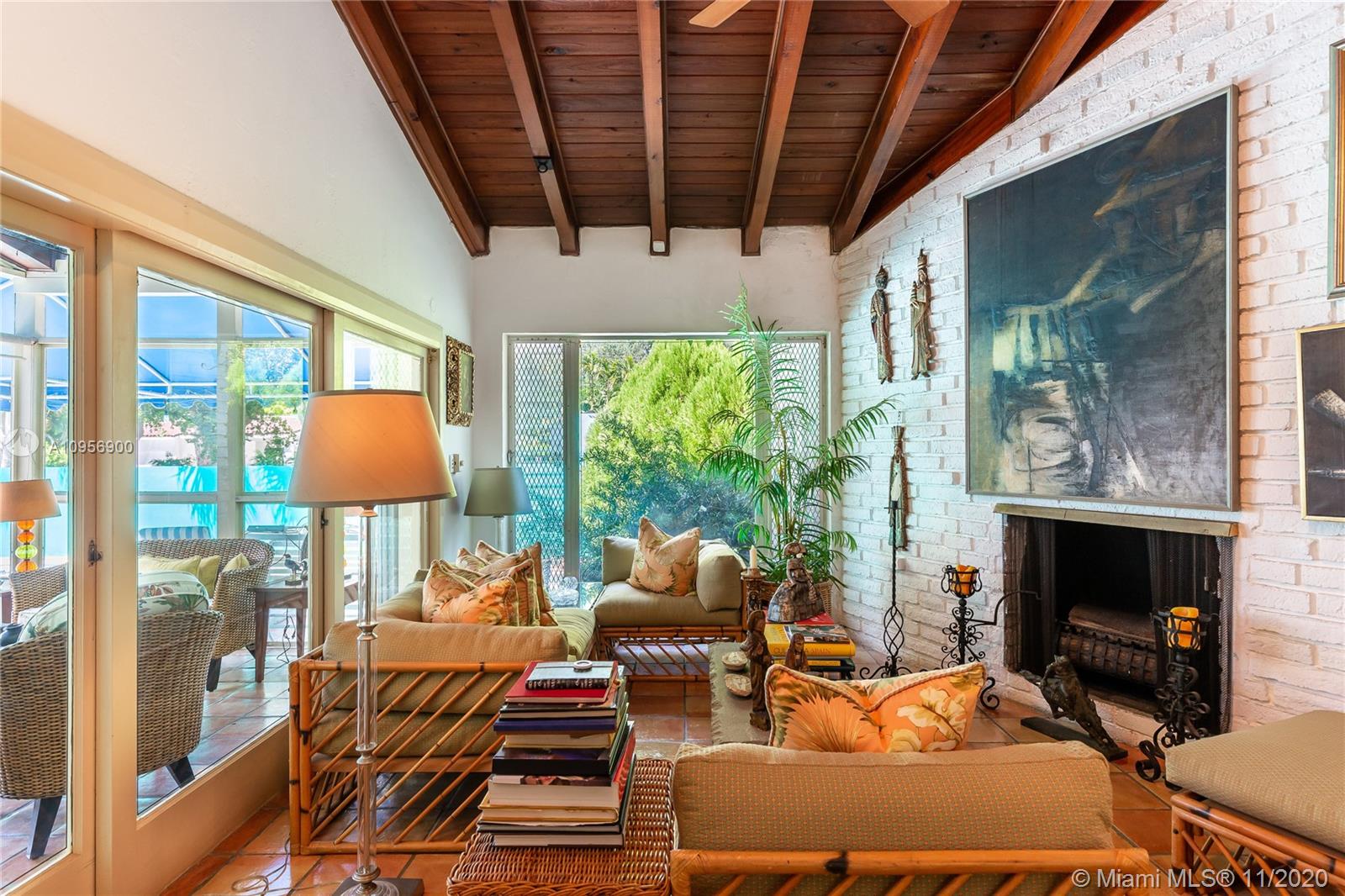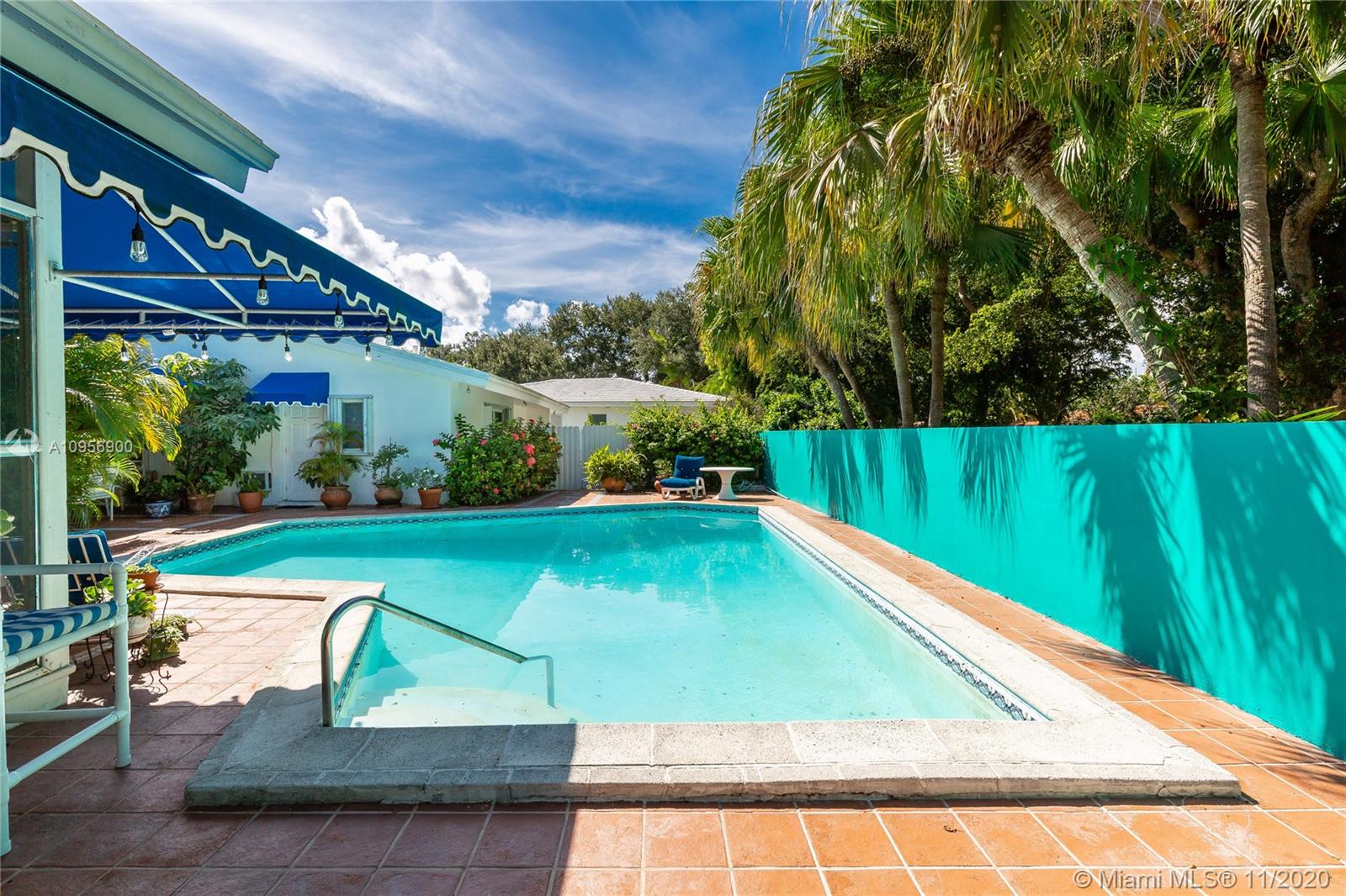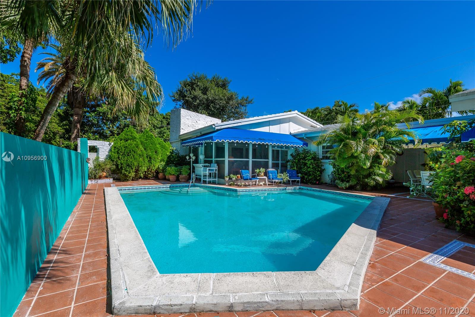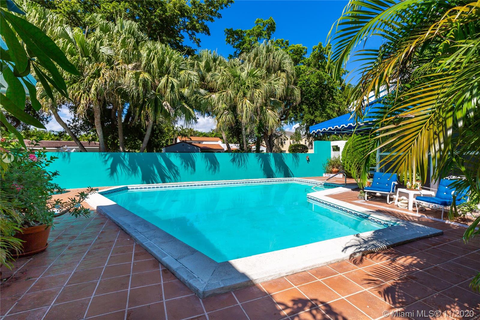 Live & lavishly entertain in this beautifully landscaped & designed compound in Coral Gables half a block from Merrie Christmas Park. Situated on an ample 15,000 sf lot. Property consists of a main home with 3 beds/2 baths, renovated kitchen, large great room & living room with vaulted ceilings, fireplace, dining area & an enclosed patio facing the pool area. Features a spacious 2 car garage connected with adjoining guest/staff quarters which has a bedroom and full bath plus living room which can also be another bedroom. The two structures surround pool with covered areas for dining and enclosed by a wall ensuring privacy. Has Mexican tiles with hardwood floors in the bedrooms. Great opportunity to update and expand. Roof at end of life & windows original. Hurricane shutters. As Is.