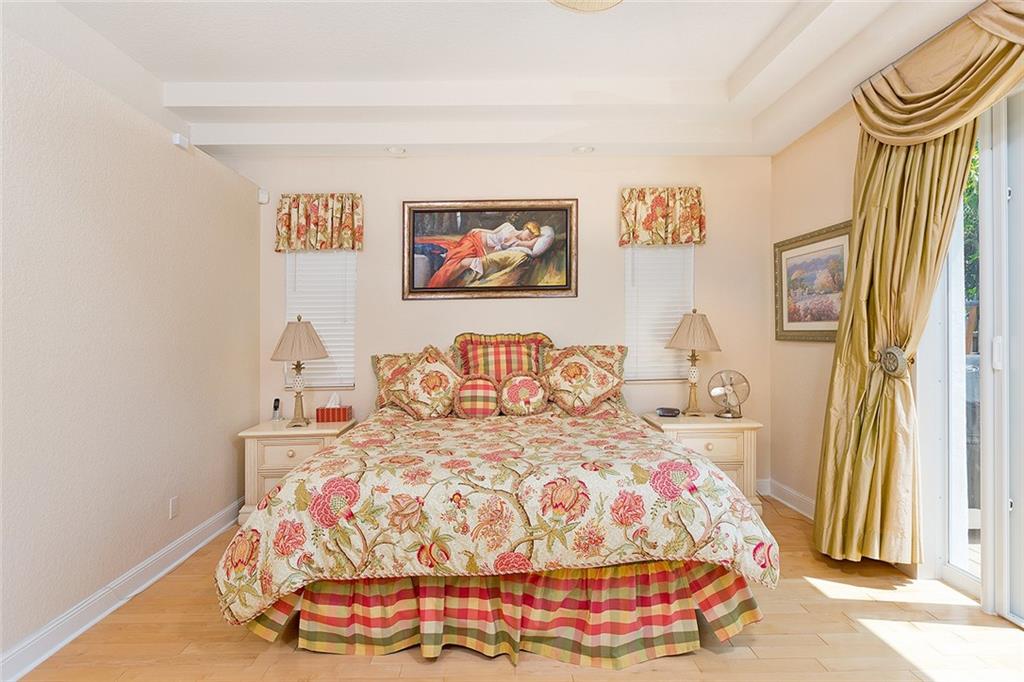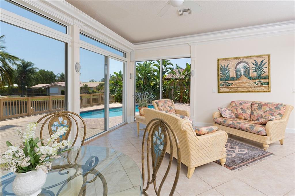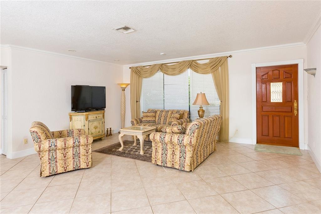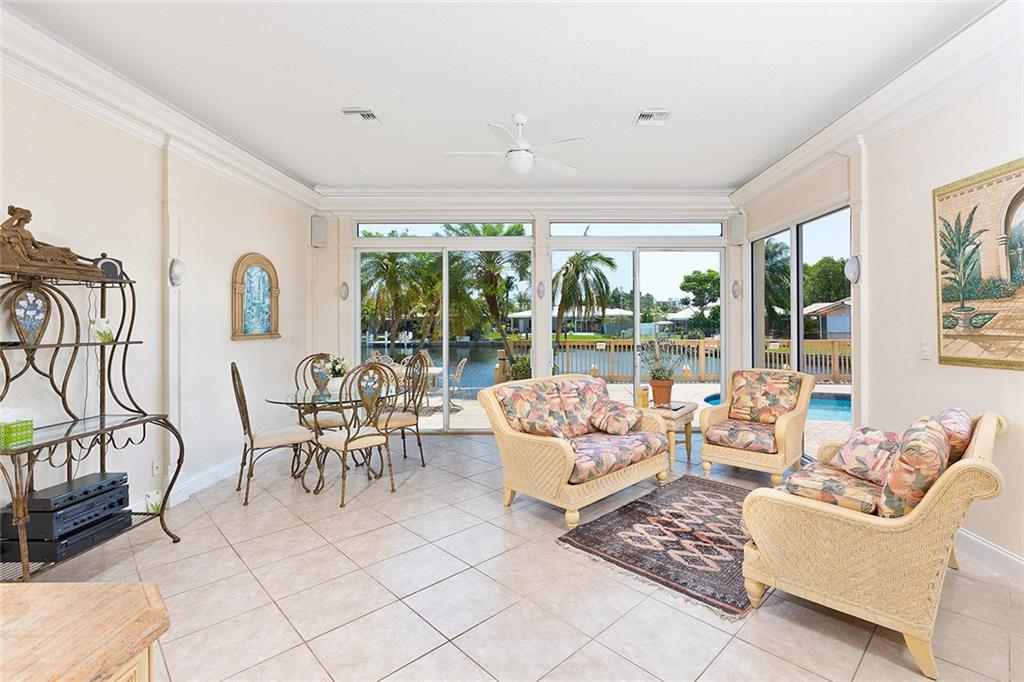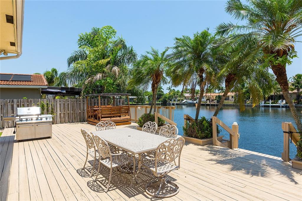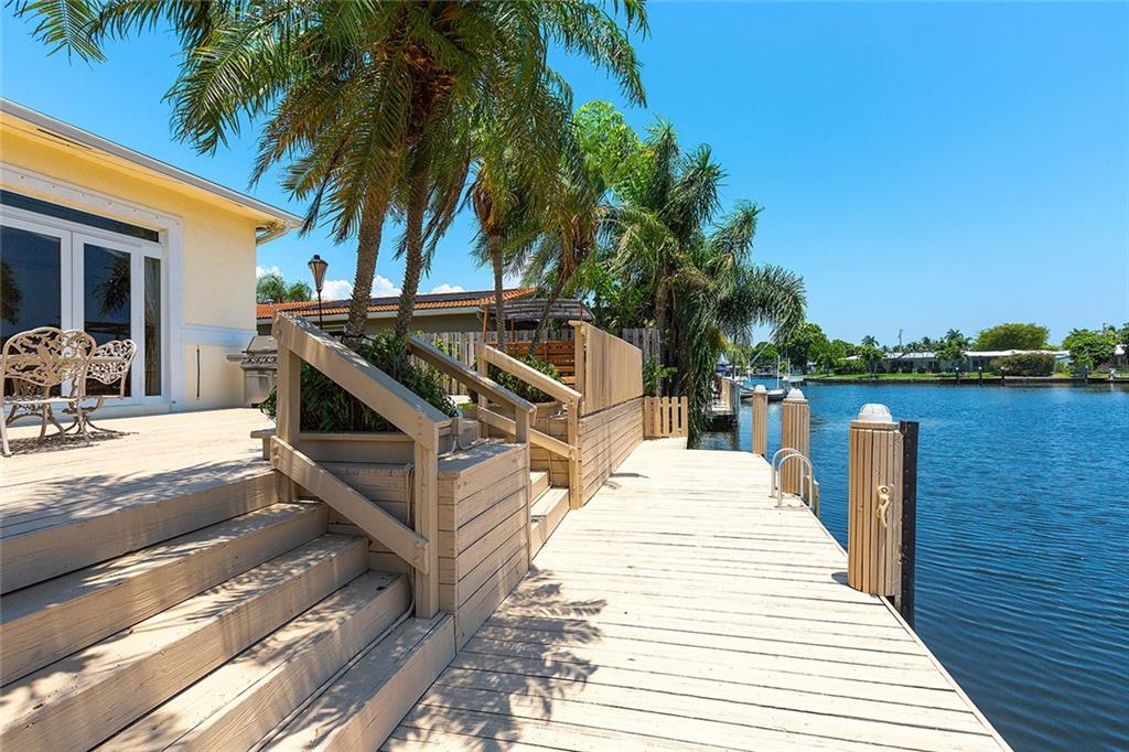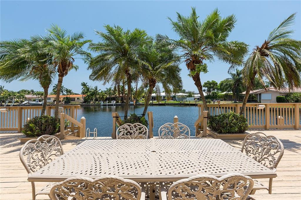 This spacious wide view waterfront home with one 11.5ft fixed bridge. Open floor plan, family and living spaces, center Chef's kitchen and formal dining area. Walls of sliding doors open to large terrace 50'x19' deck and heated pool. Quiet neighborhood, beautiful views and a lot of privacy. The full-service dock below measures 62'x 8'. Split floor plan offers a private master suite and access to terrace while the two guest bedrooms share a hall bath one enjoying it's own covered patio with waterway views. Well-landscaped with a circular driveway. Only blocks to shopping & cafes. Fifteen minute walk to the beach, close to all amenities. No association fees.