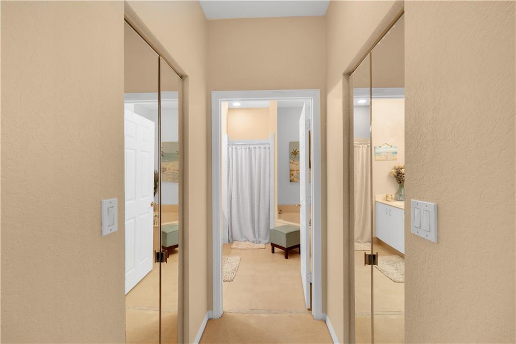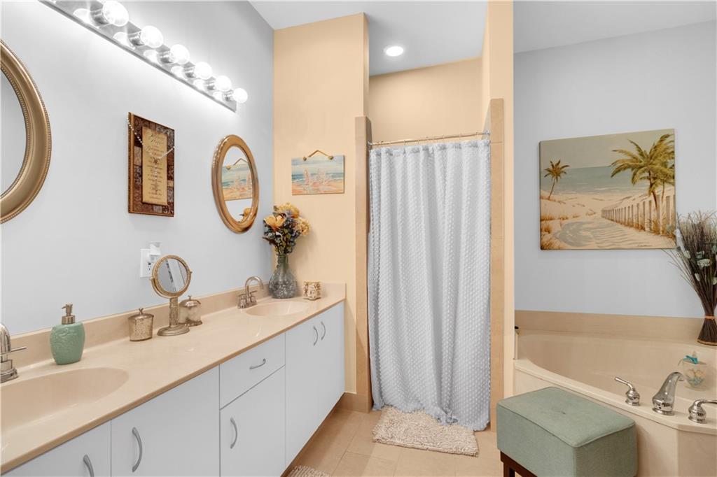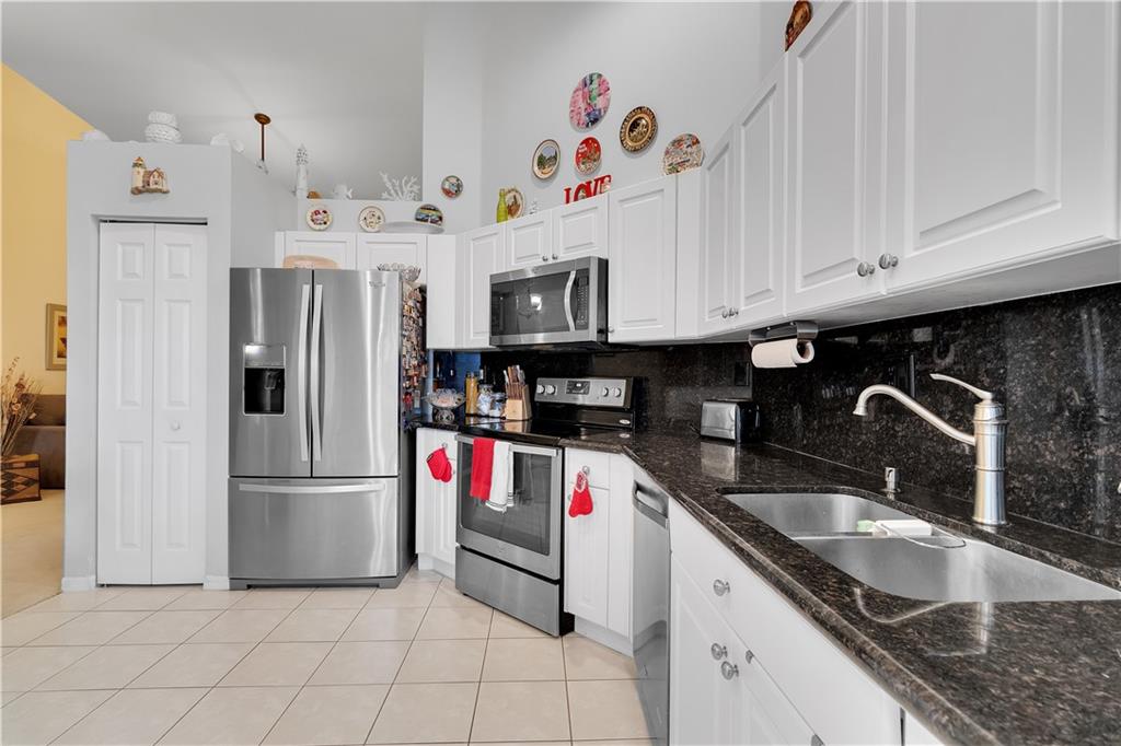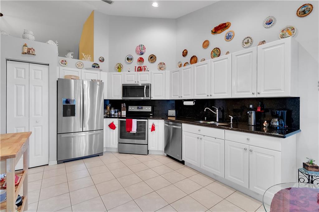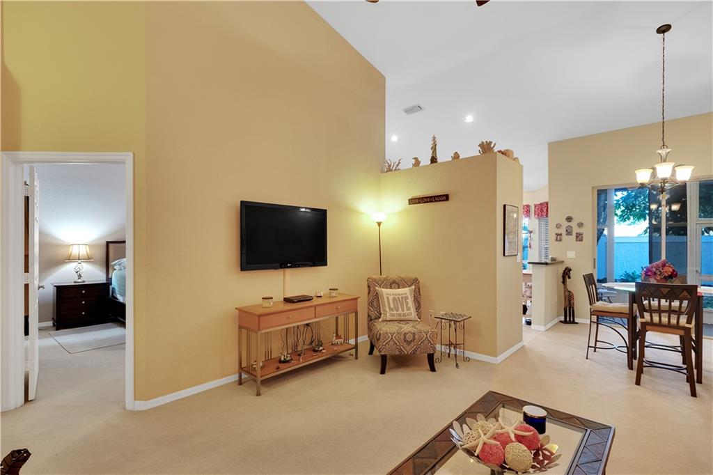 Beautiful large Villa with 2 bedrooms and 2 bathrooms with a 1 car garage. Long welcoming foyer. Property has vaulted ceilings through out. Large eat-in Kitchen newer appliances. Expansive Master bedroom with sit-in area, New blinds,walk in closet and separate patio space. Master bathroom includes tub, shower, and double sink vanity. Large laundry room with NEW full size washer and dryer. Gated community with 3 entrances, basketball court, tennis court, 2 pools, a gym and many guest parking.Water Heater 2017 outside AC 2014. The association fee covers painting of the exterior, law maintenance, Tree trimming, cable tv, burglar alarm and security car patrol.