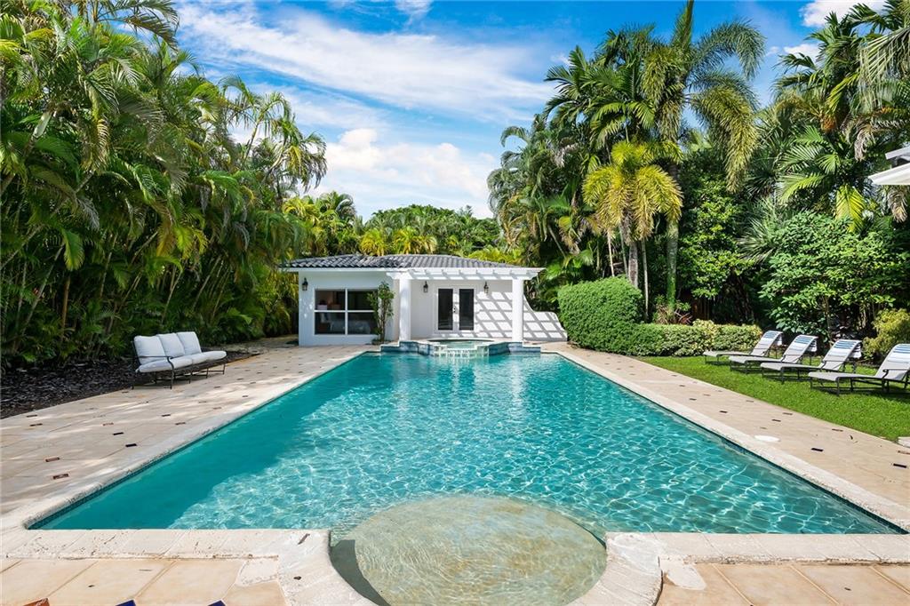 Welcome home to beautifully renovated and professionally designed transitional modern, in the heart of the exclusive Coral Gables community. Enjoy an open warm inviting floor plan flooded by natural light from multiple french doors defining the exterior walls. Elevated ceiling heights in the entry present a grand entrance that pulls your eyes into the main living area highlighted with fireplace, raised ceilings, wood beam accents, wall sconces, elegant window treatments, and chic furniture accents. The kitchen and dining area of the home offer top of the line appliances (Viking) and gas cooking options. With 4 bedrooms + den in the main house and a full functioning guest house ( kitchen, full bath, and separate bedroom) this house is incredible. Lush, tropical, private, and modern.