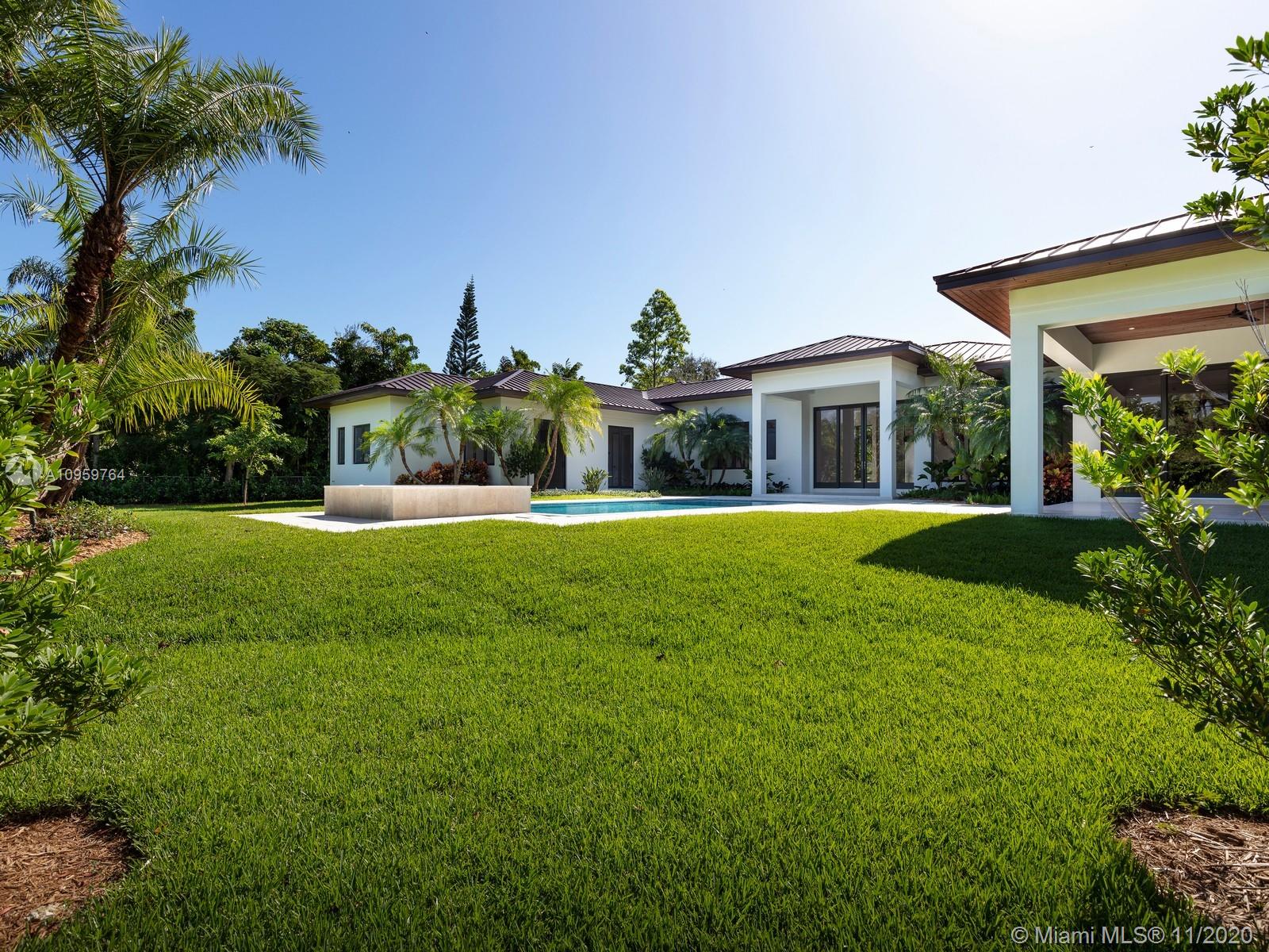 Stunning Brand-New Construction & ready for immediate occupancy in the heart of Pinecrest. This gorgeous 1-story modern estate is nestled on a spacious 37,461 sf gated lot & surrounded by pristine landscaping. Greeted by an exceptional floor plan w/enormous impact windows & doors offering bountiful natural light. Spectacular eat-in kitchen w/ Thermador appliances, wine cellar & wet bar. Enjoy unobstructed views of the open floor plan family rm & dining. Master suite offers huge walk-in closet, spa like bath w/ double vanities, shower, & soaking tub. Discover all around views of the glorious outdoors including resort style pool & spa, covered terrace w/ built in summer kitchen & huge yard. Add Features: 3 car gar, maids quarters, mud rm/laundry, gas fireplace. 1 Year builders warr.