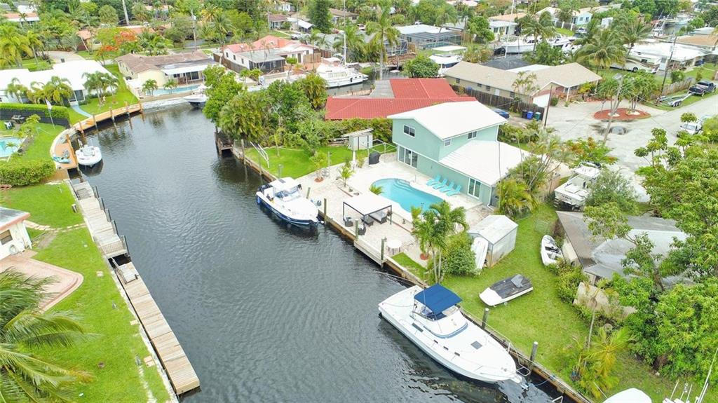BRING YOUR YACHT! Perfect large yacht basin with turn around. Rare point lot with 114 foot deep water dock space. Can accommodate multiple boats. Large concrete dock and seawall. Power hookup to dock with 50 amps breaker ready to hook any big vessel. No fixed bridges. Brand new marina only one minute from home. Can service big yacht. Close to downtown Fort Lauderdale and beaches. Stunning two story three bedroom three bath home remodeled and move-in ready. Beautiful porcelain flooring on first floor and PVC laminate flooring on second floor. Pool has been redone completely, new diamond blue textured, new special travertine all around and new salt water chlorinated system. Come see this beautiful home!